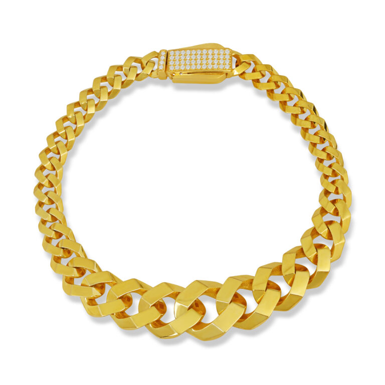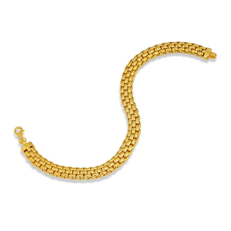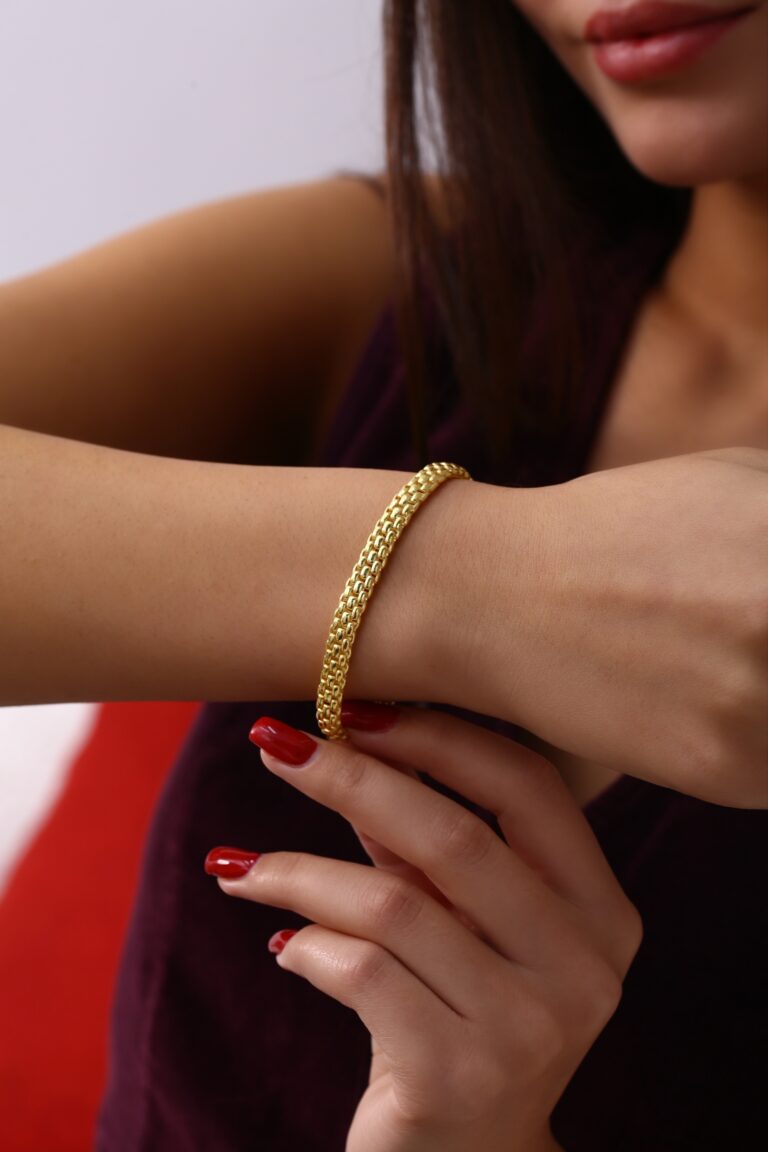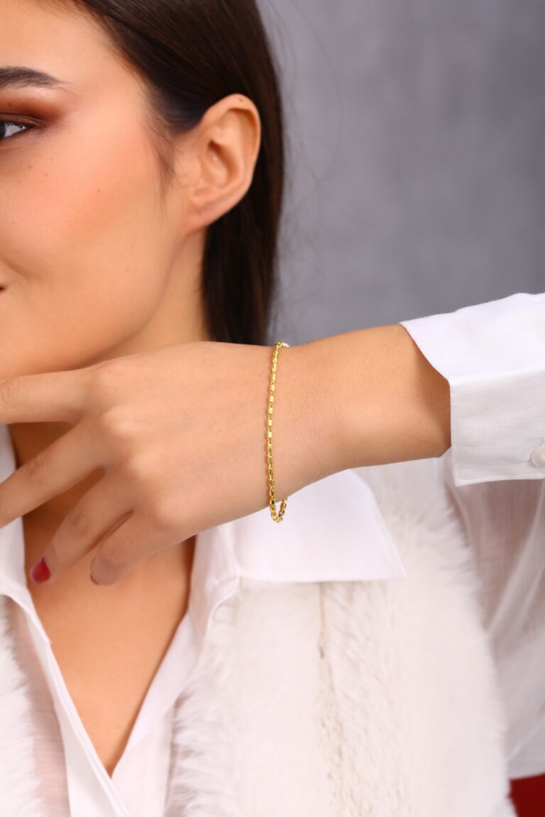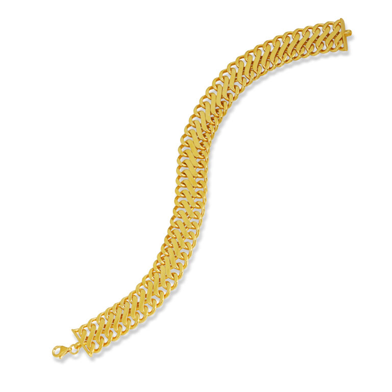 Geniş ve akıcı zincir formuyla bilekte güçlü bir duruş sergileyen, gold kaplama 925 ayar gümüş bileklik. Hem modern hem de zamansız görünümüyle günlük stil ve özel davet kombinlerinde mükemmel tamamlayıcıdır.