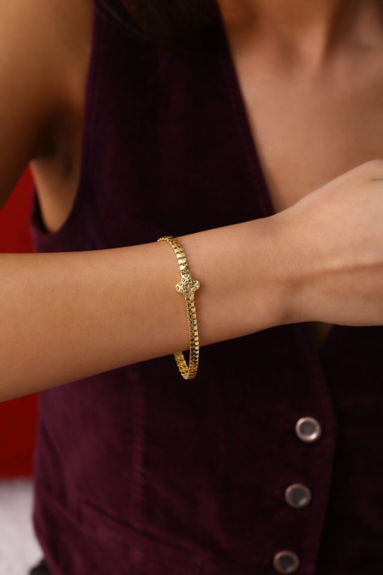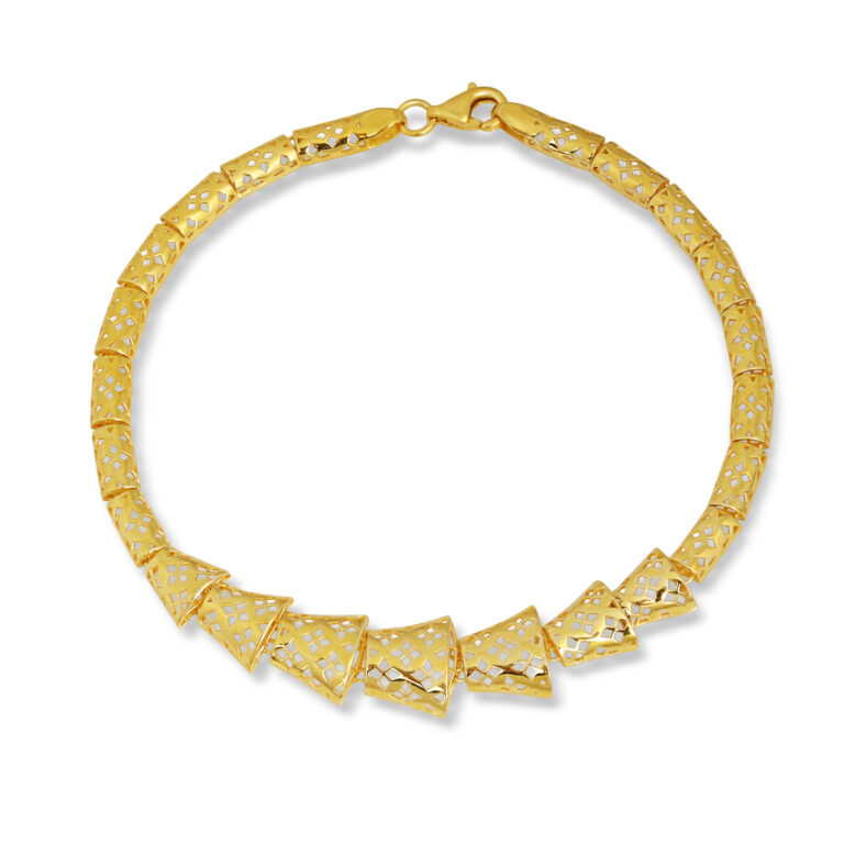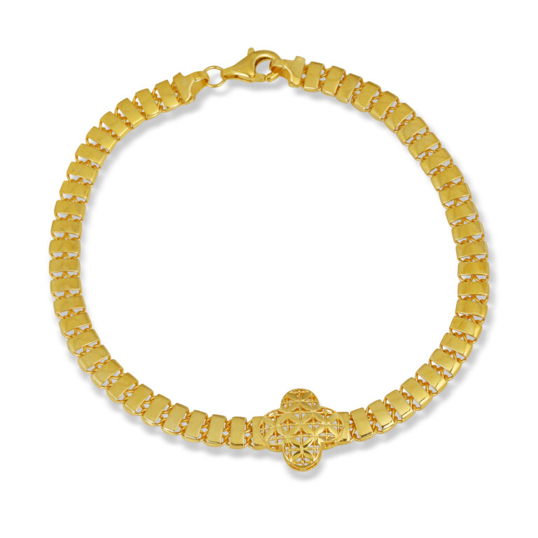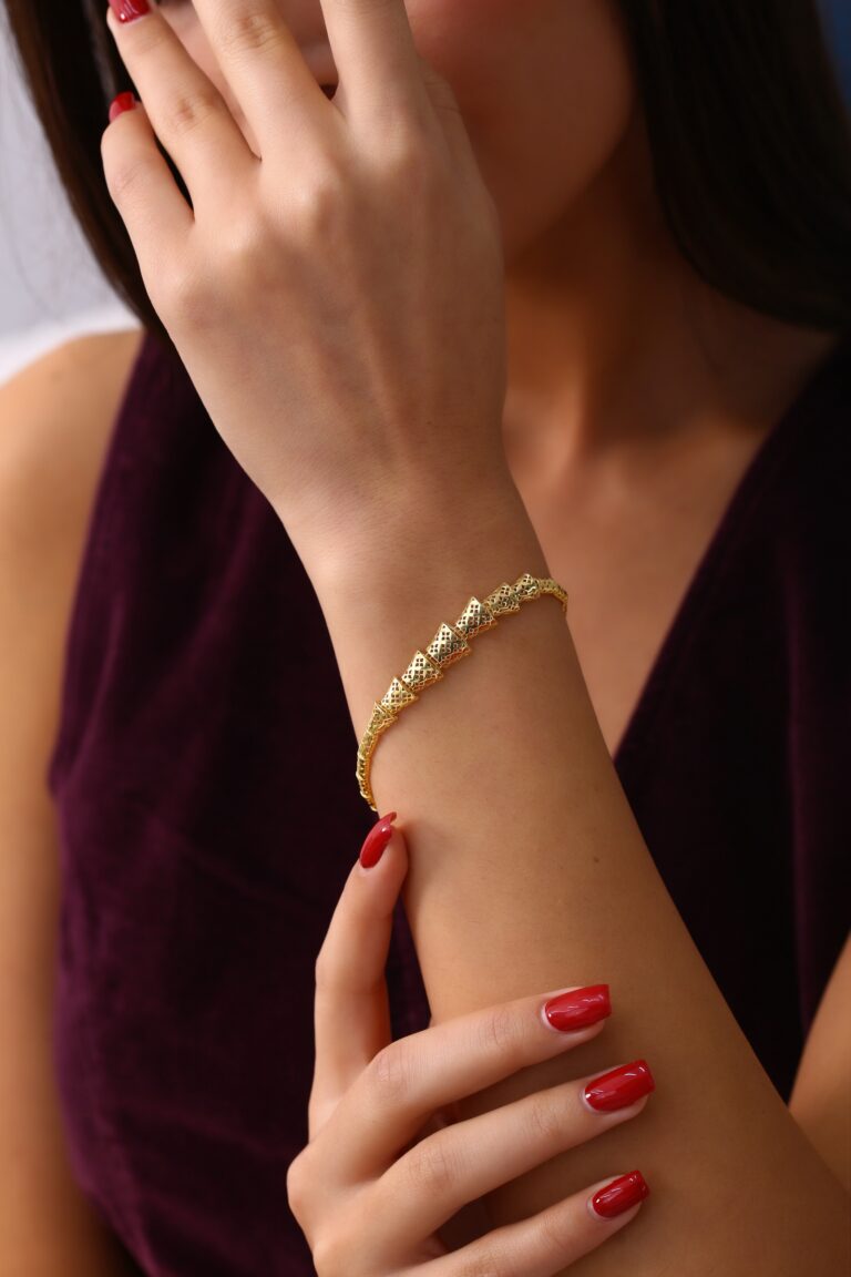 Geometrik dokulu yüzey detaylarıyla modern ve özgün bir karakter sunan, gold kaplama 925 ayar gümüş bileklik. Hafif yapısı ve zarif formuyla günlük stilin en dikkat çekici tamamlayıcılarından biri.