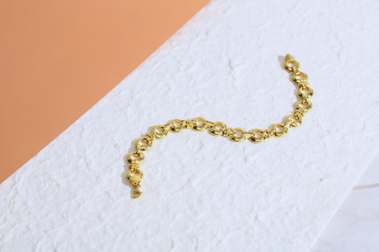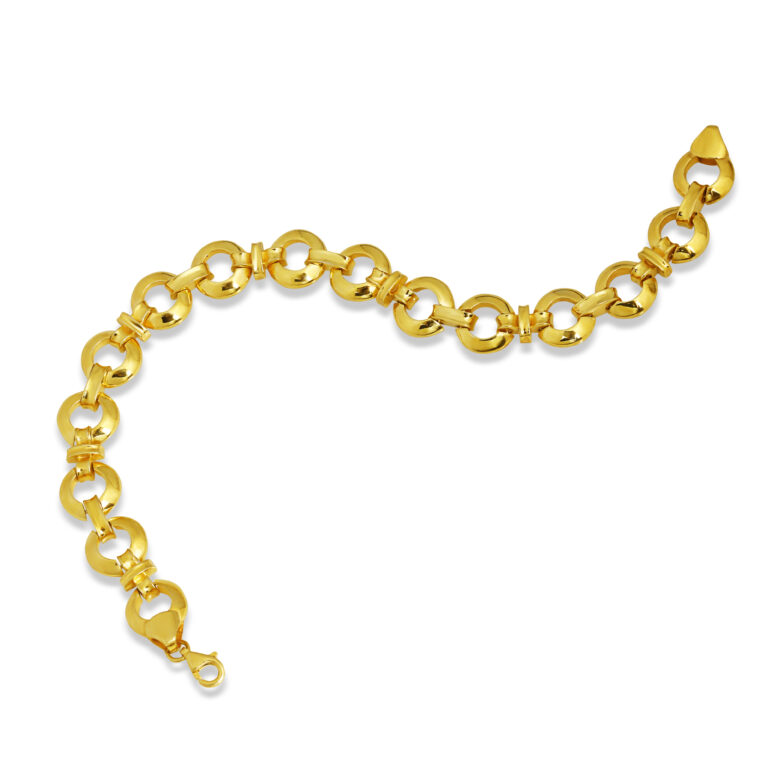 Modern halkalı zincir formuyla şık ve güçlü bir duruş sunan, 925 ayar gümüş üzerine altın kaplama bileklik.