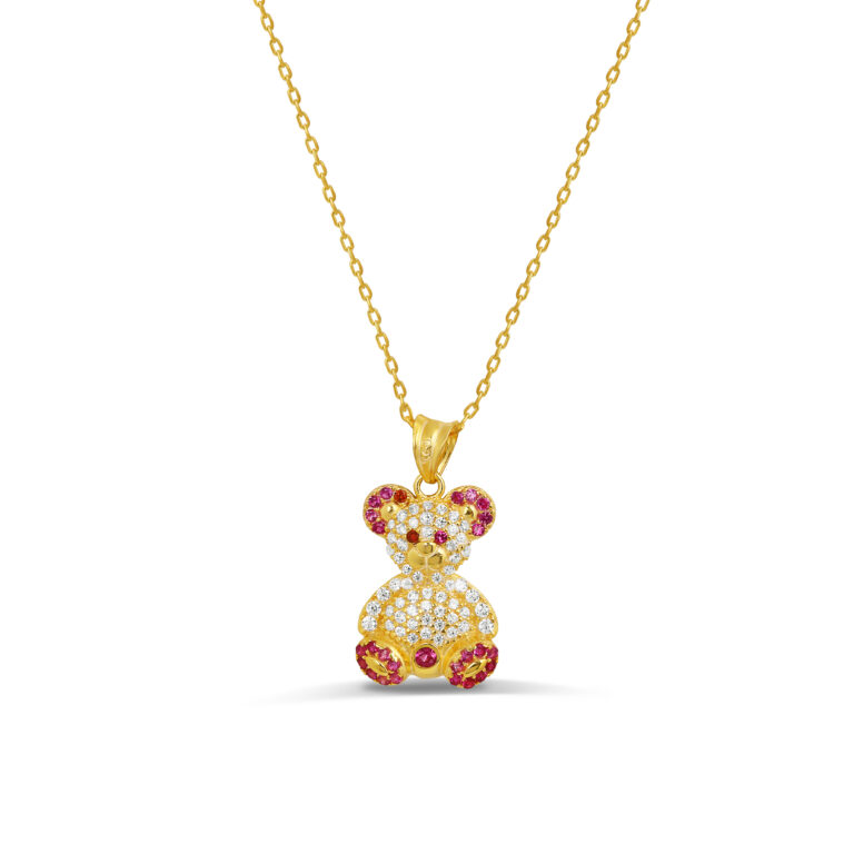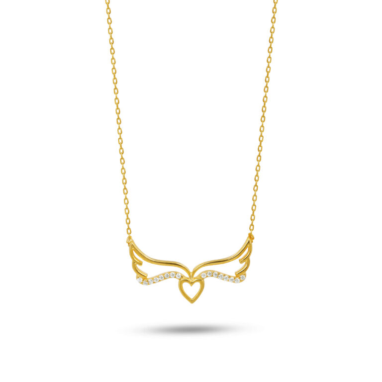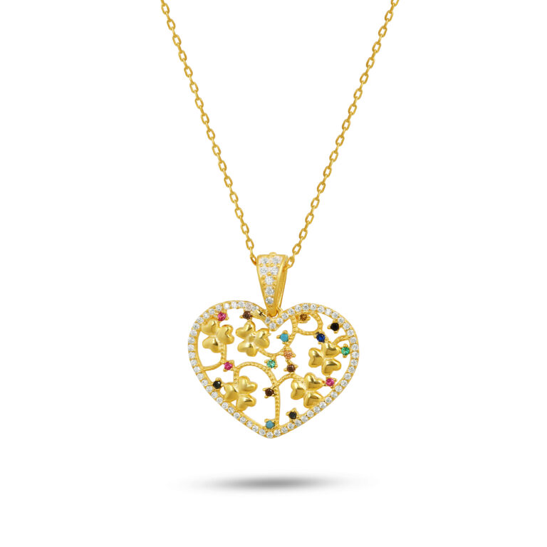 Kalp silueti ve parlak taşlı detaylarıyla modern, romantik ve göz alıcı bir kolye. 925 ayar gümüş üzerine altın kaplama.