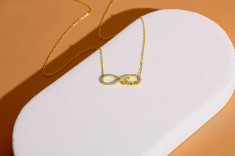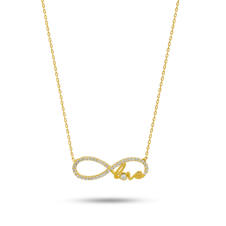 Taş işlemeli love yazılı sonsuzluk sembollü altın kaplama kolye.