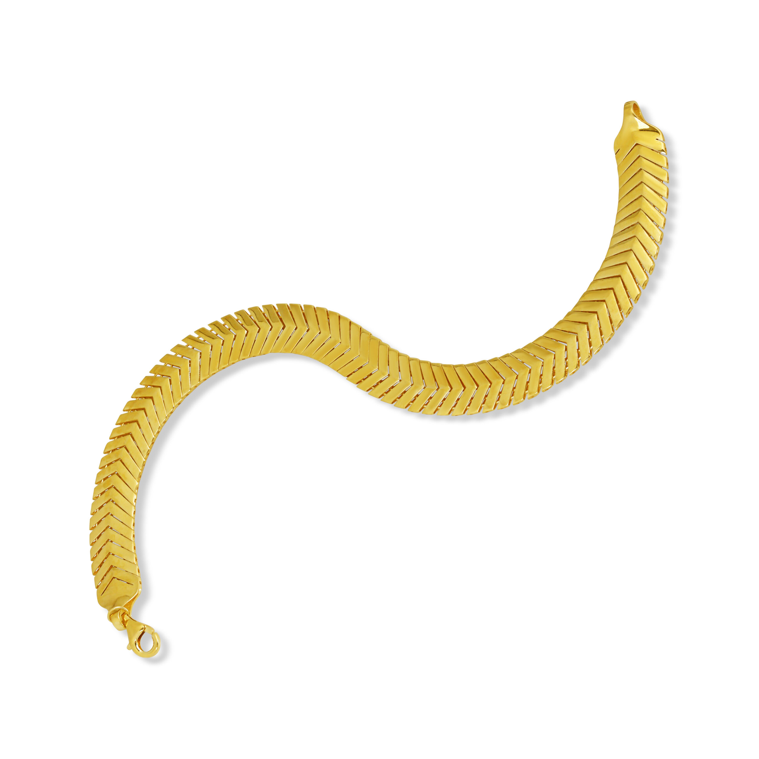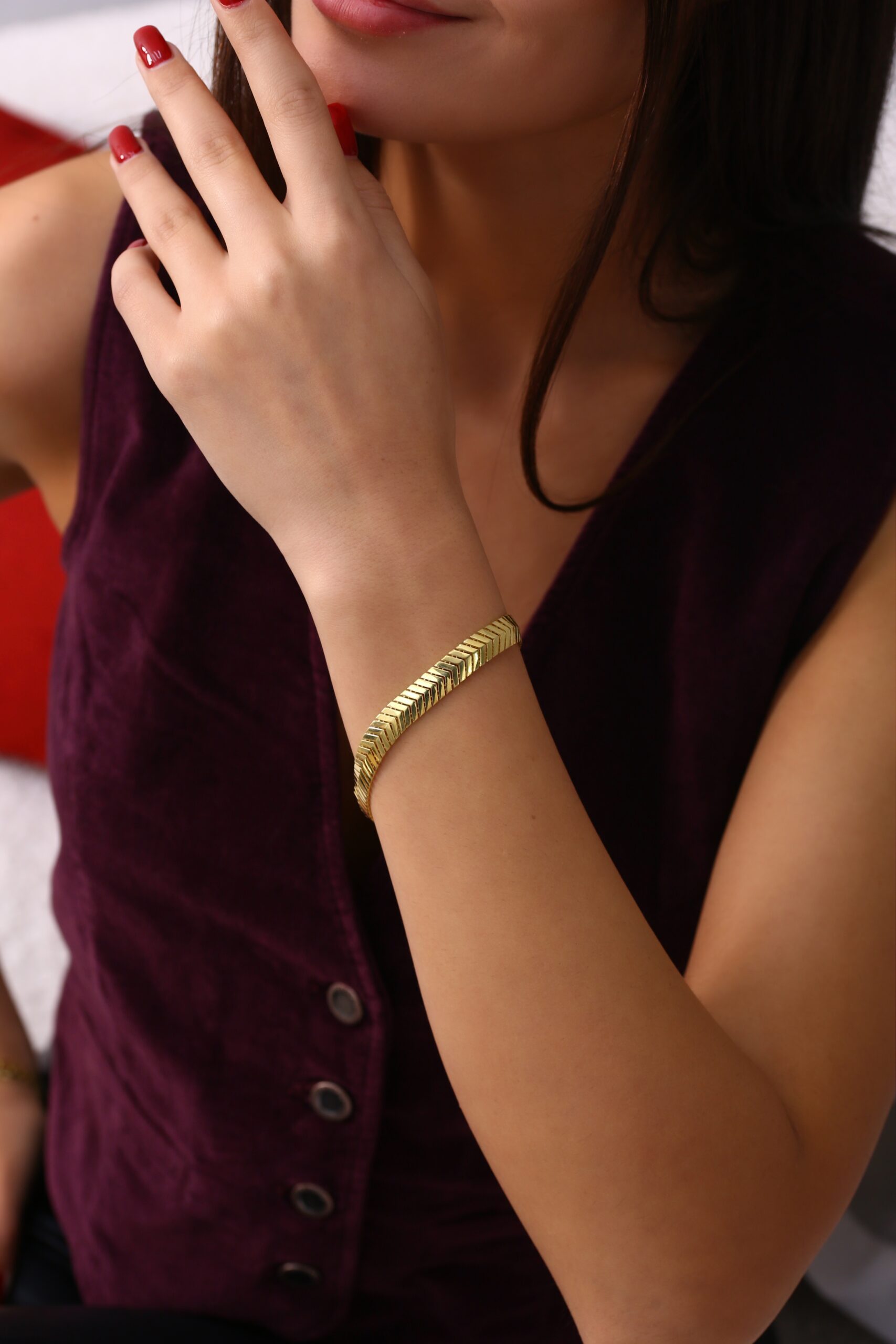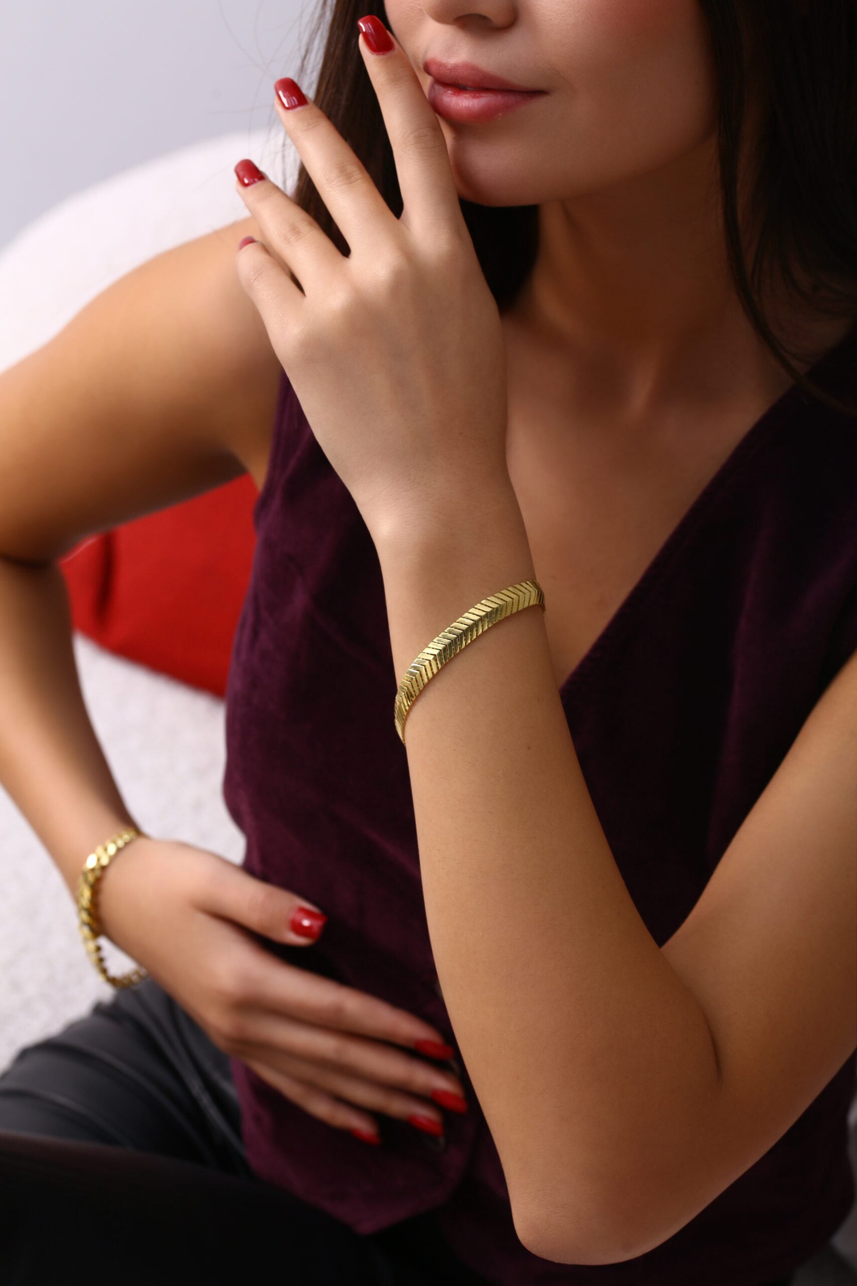 Çavuş modelin simetrik ve güçlü çizgilerini taşıyan, parlak yüzeyli ve modern bir bileklik. 925 ayar gümüş üzerine altın kaplama.