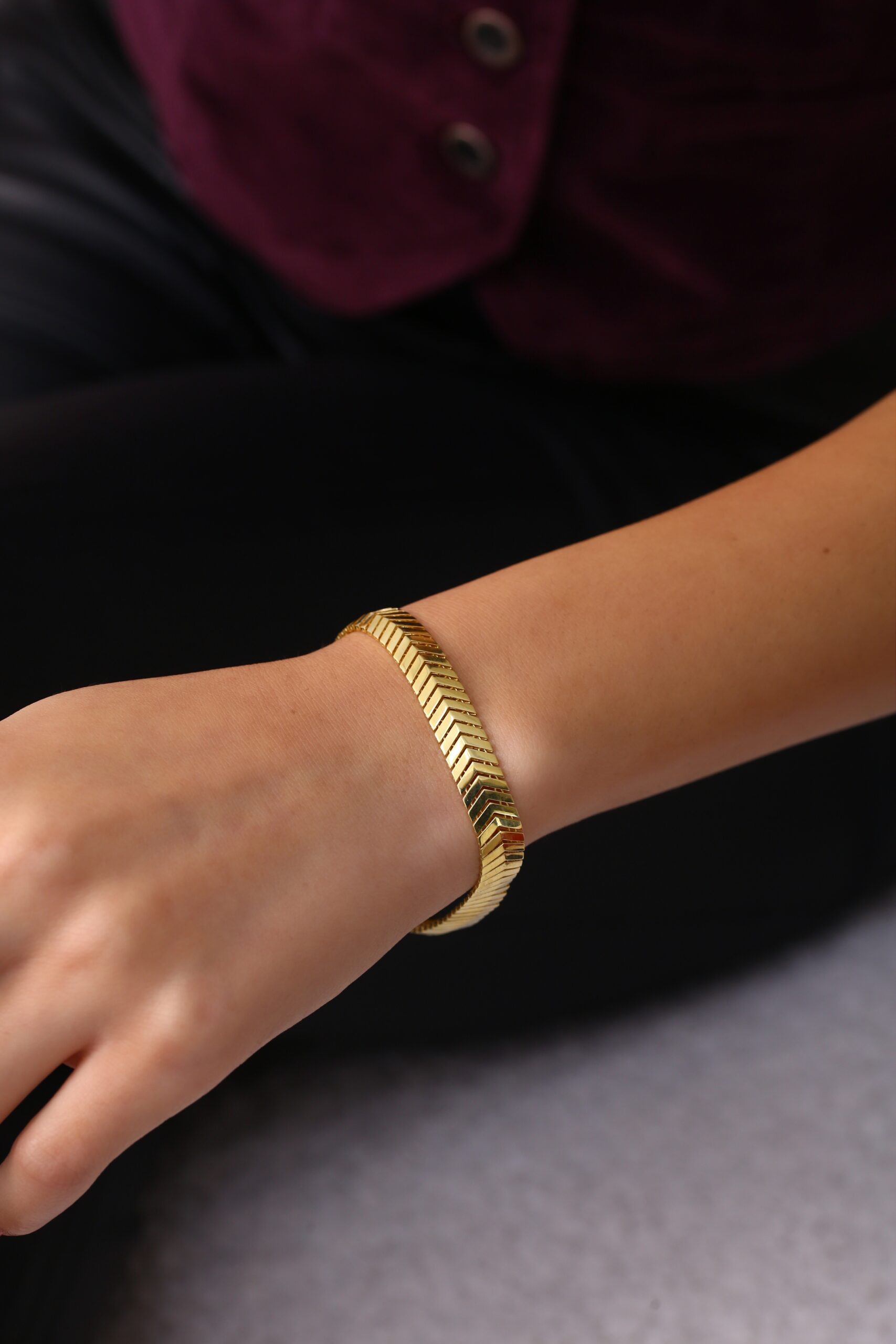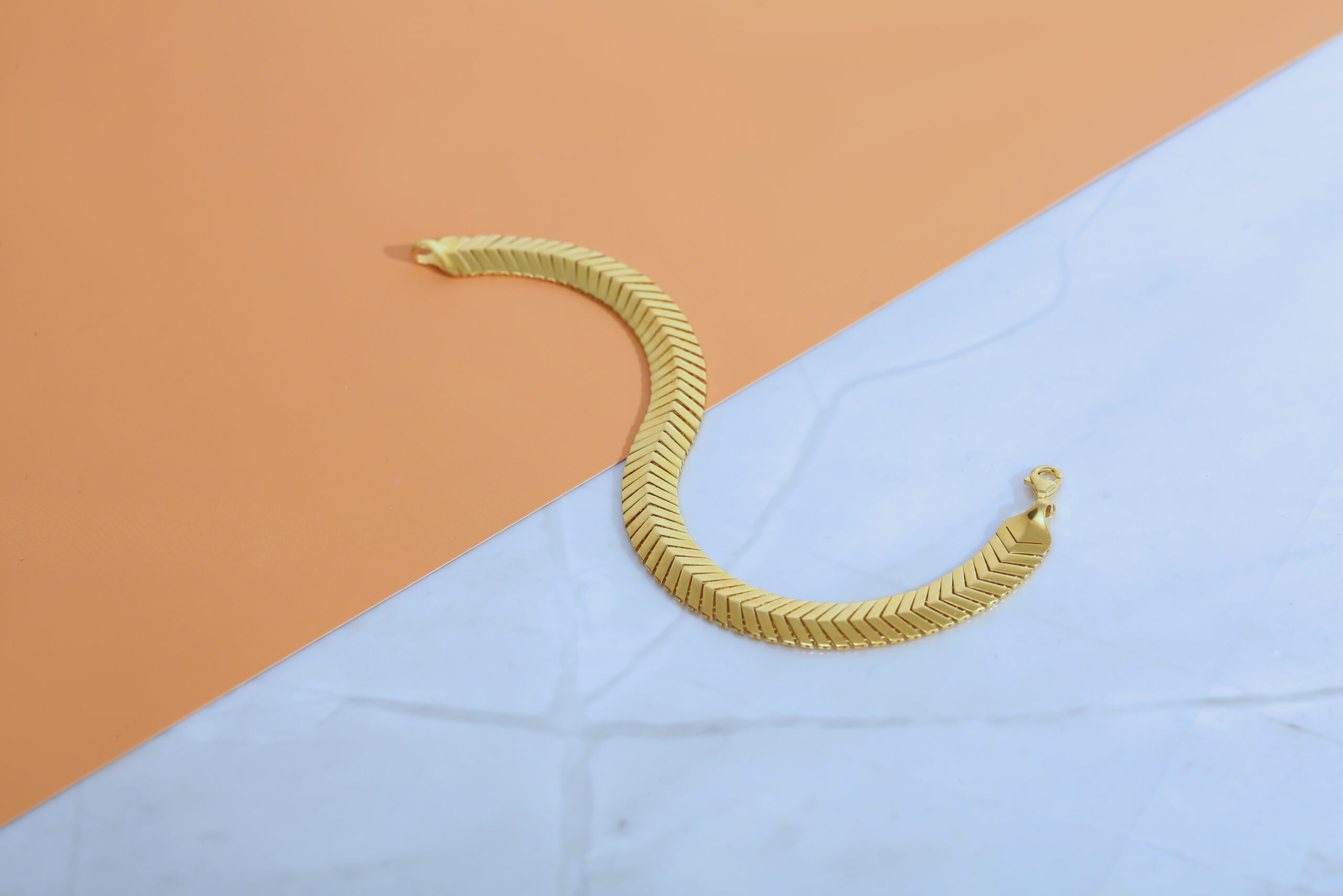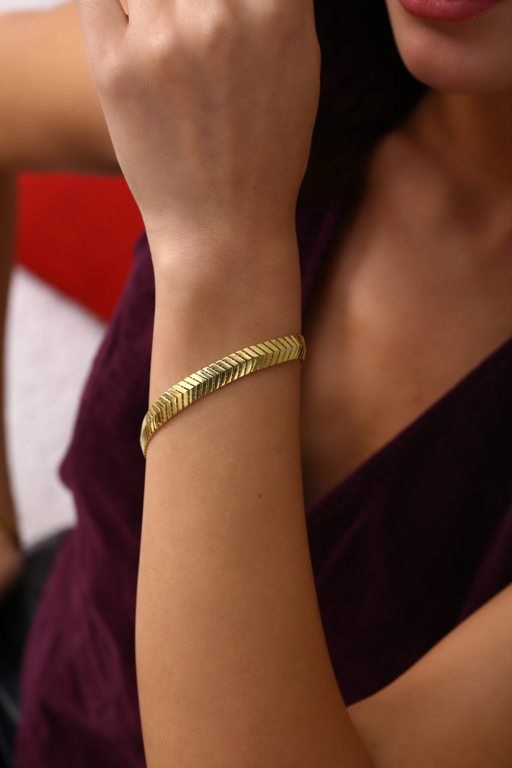 Çavuş modelin simetrik ve güçlü çizgilerini taşıyan, parlak yüzeyli ve modern bir bileklik. 925 ayar gümüş üzerine altın kaplama.