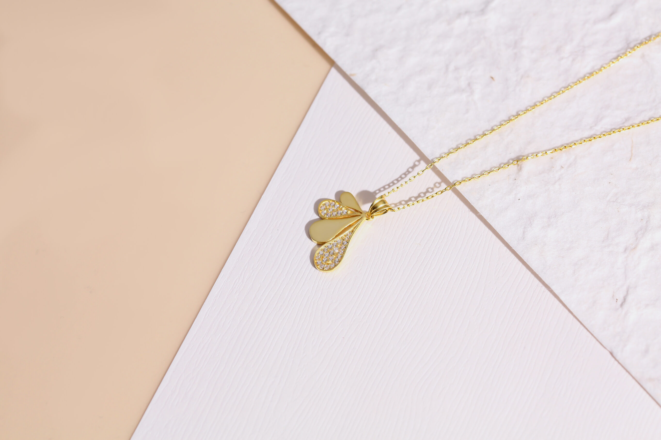 Asil görünümüyle dikkat çeken bu damla formundaki kolye, hem minimal hem de gösterişli bir deneyim sunar. Üç parçalı tasarımı hareketli bir görünüm oluştururken, taşlarla zenginleştirilen yüzey ışığı mükemmel yansıtır. Özel günler, davetler ve günlük şıklık için ideal bir seçimdir.