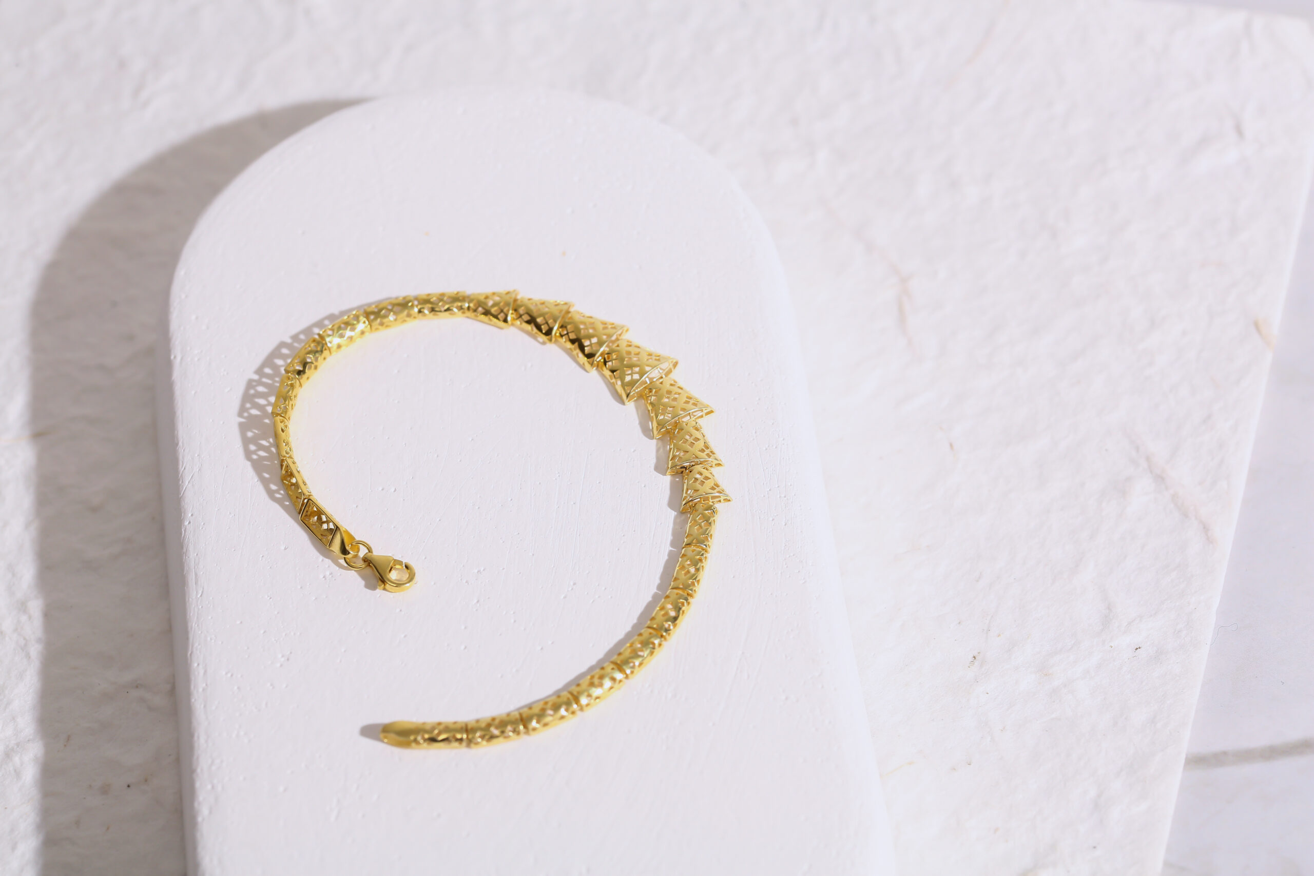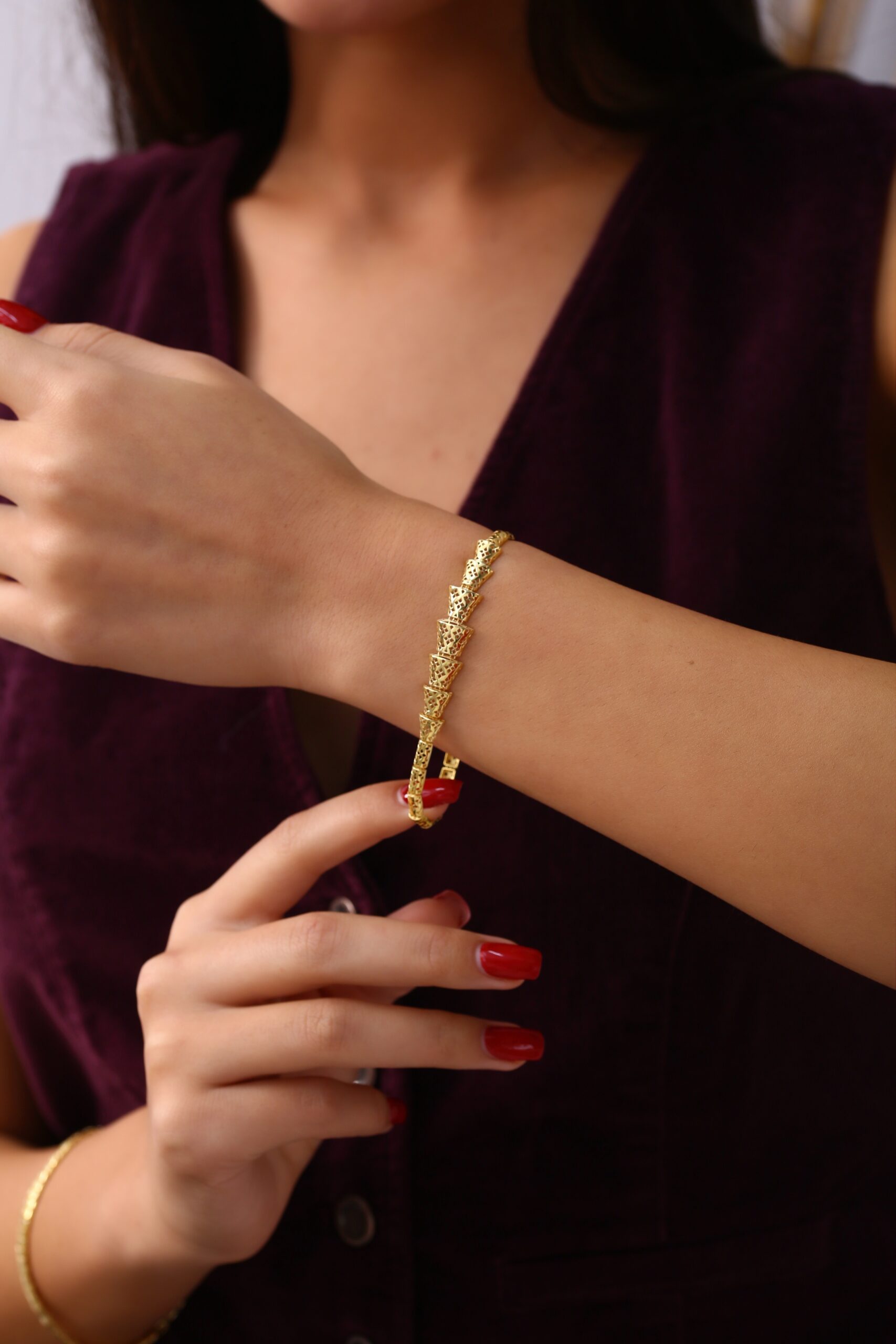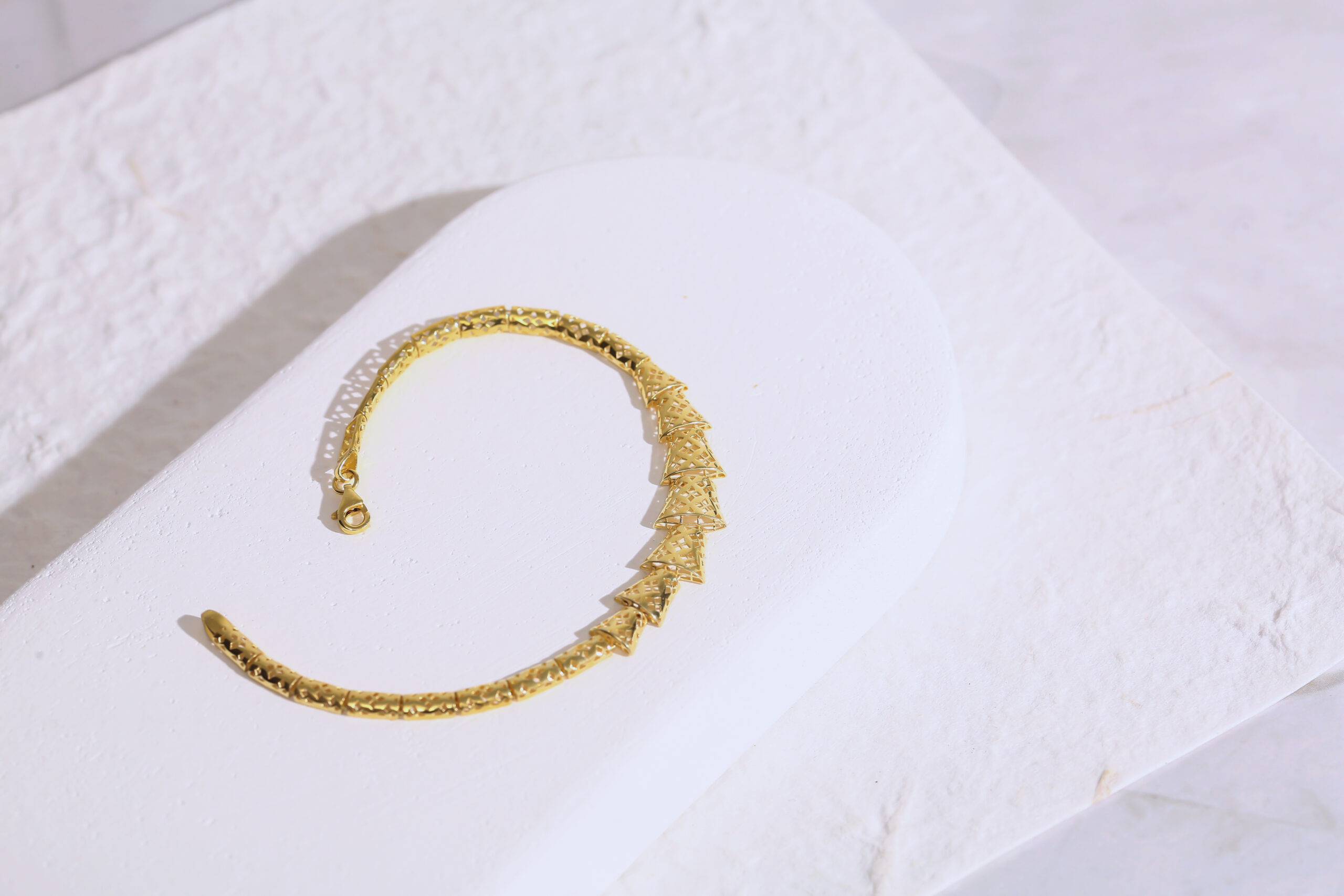Zarif ama aynı zamanda karakterli bir aksesuar arayanlar için tasarlanan bu geometrik yüzey dokulu bileklik, modern çizgisiyle dikkat çekiyor. Bileklik üzerinde yer alan üçgen formundaki özel detaylar, ışığı her açıdan yansıtarak son derece canlı bir parlaklık oluşturuyor. El işçiliğiyle hazırlanmış bu dokular, bileğe hem hareketli hem de estetik bir duruş kazandırıyor.