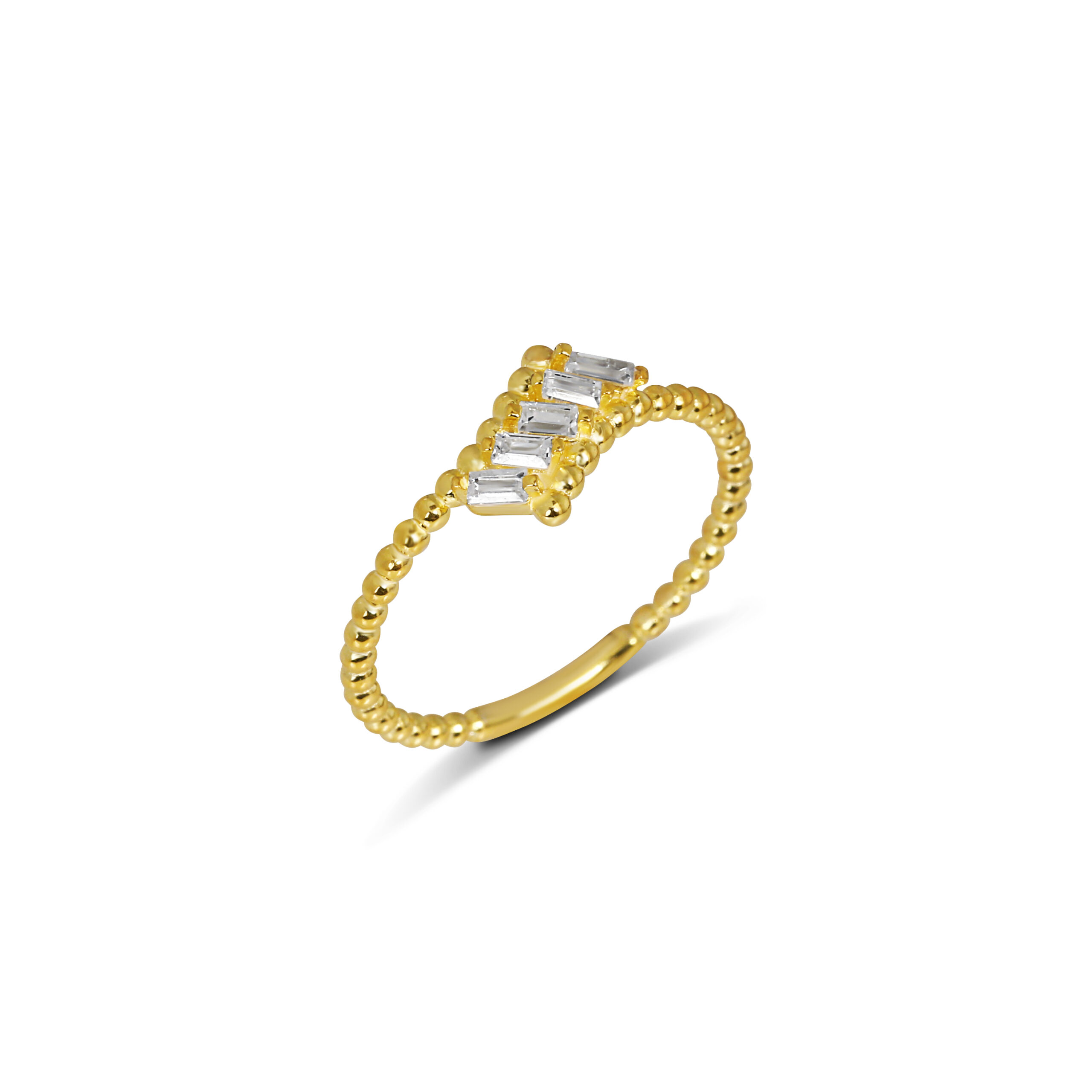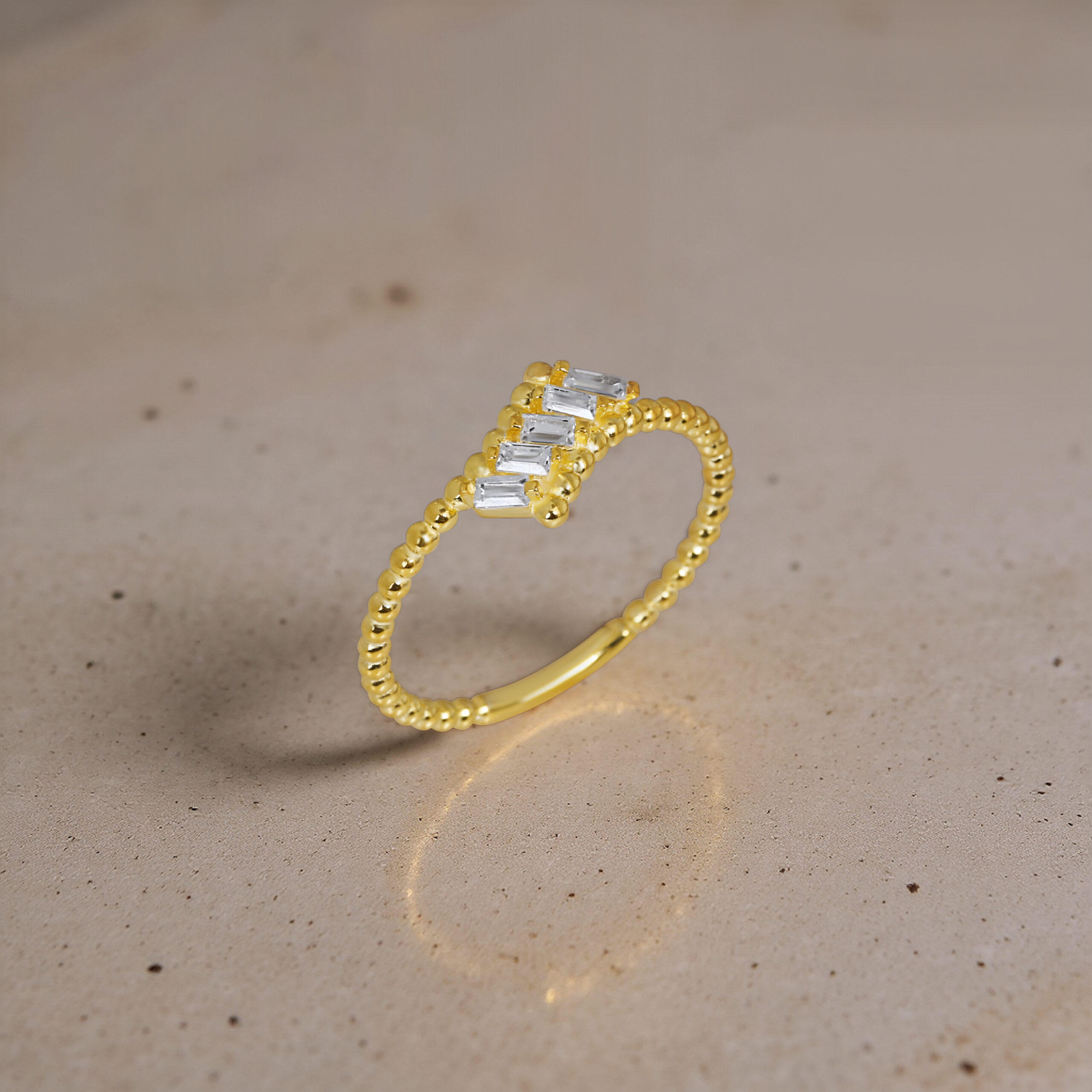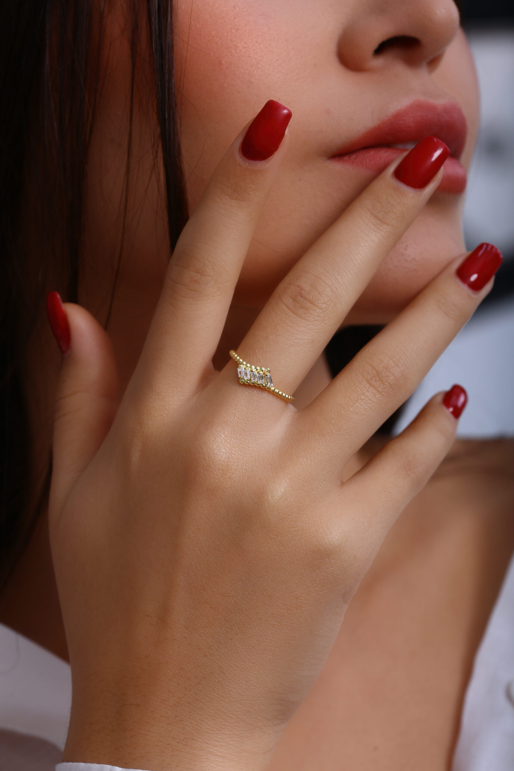 Asimetrik baget taş dizilimi, boncuklu ince bantla birleşerek modern ve şık bir tasarım oluşturur. GoldPark’ın minimal ama dikkat çekici yüzük serisinin özel parçalarından biridir. Hafif yapısı sayesinde gün boyu konfor sağlar.