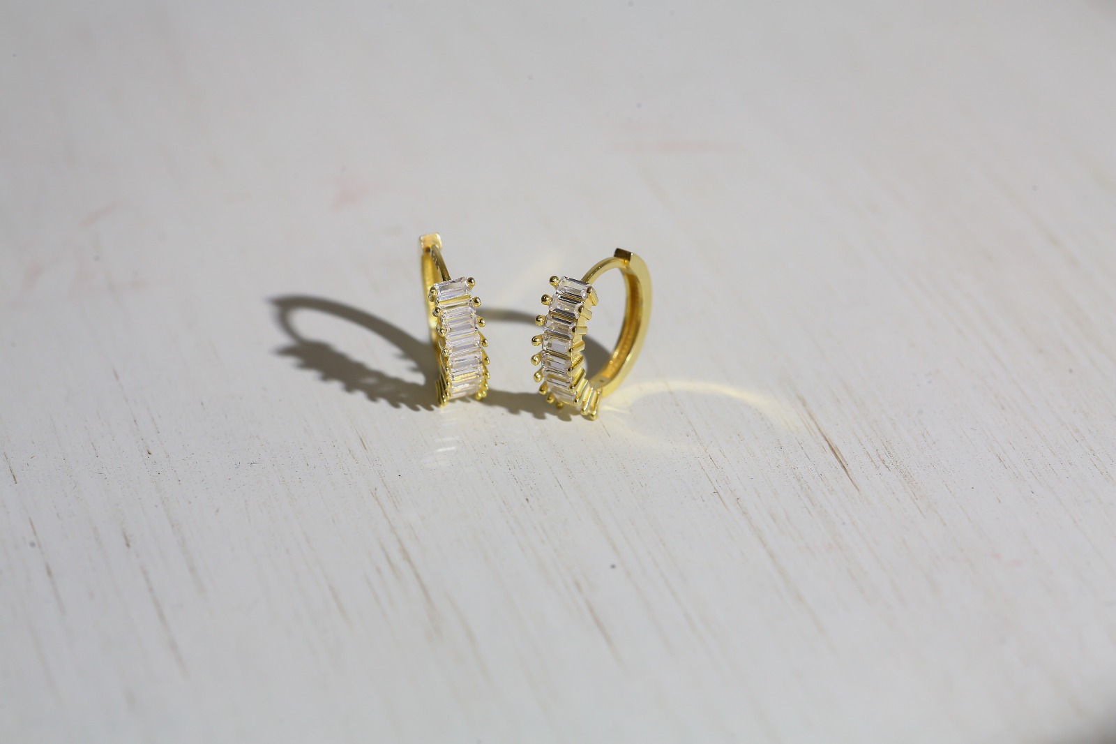 Altın kaplama 925 ayar gümüşten üretilen bu baget taşlı halka küpe, sade ve şık tasarımıyla her stile uyum sağlar.