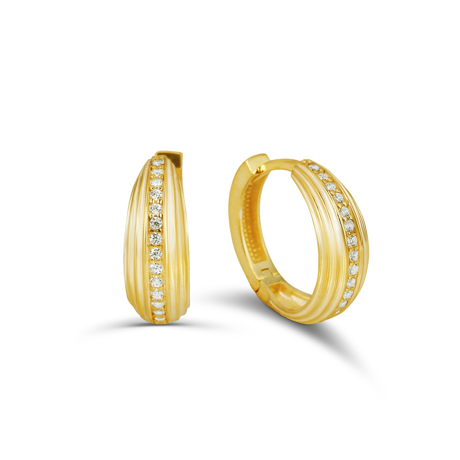 Altın kaplama 925 ayar gümüşten üretilen bu çizgili ve taş detaylı halka küpe, zarif tasarımıyla her stile ışıltı katar.