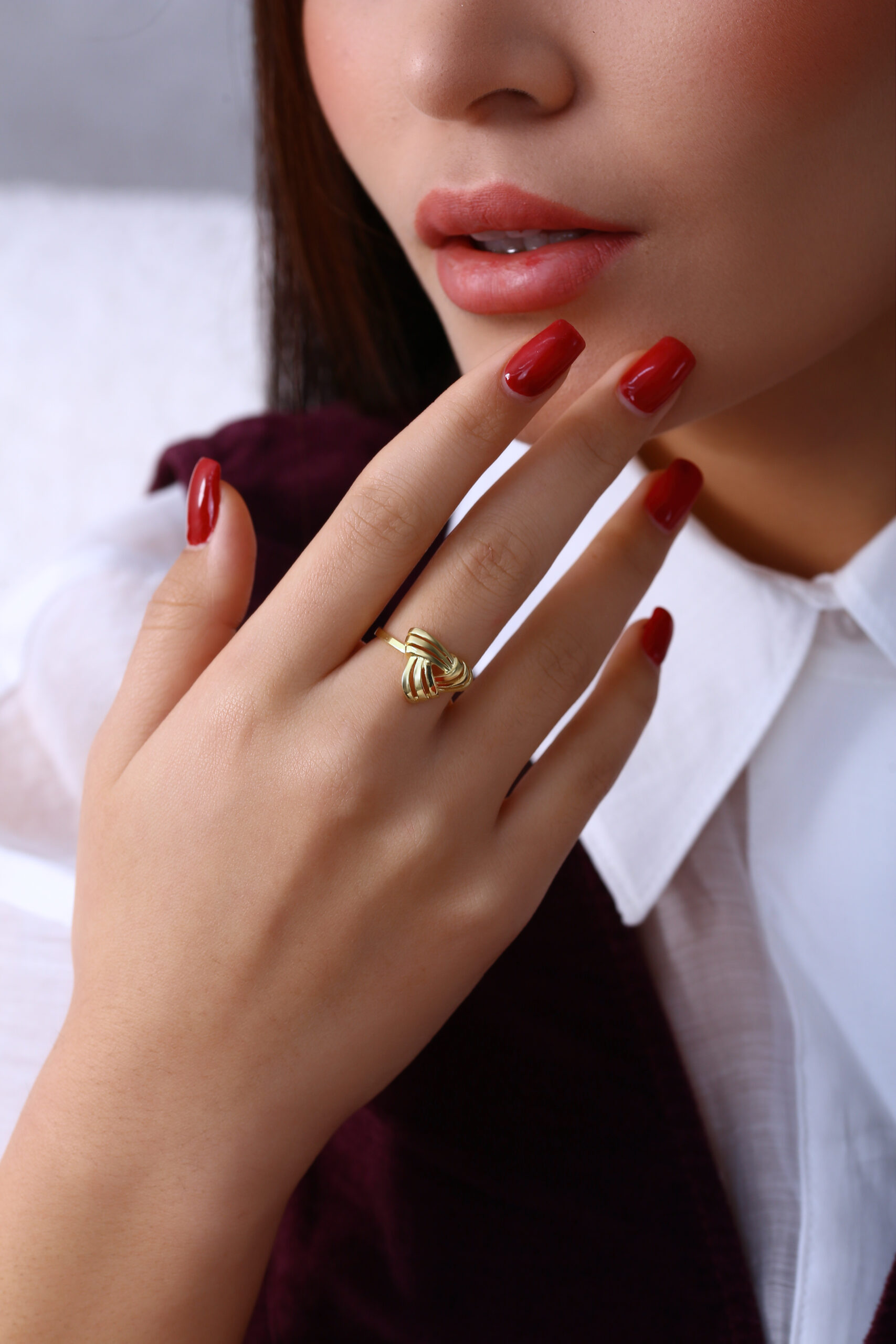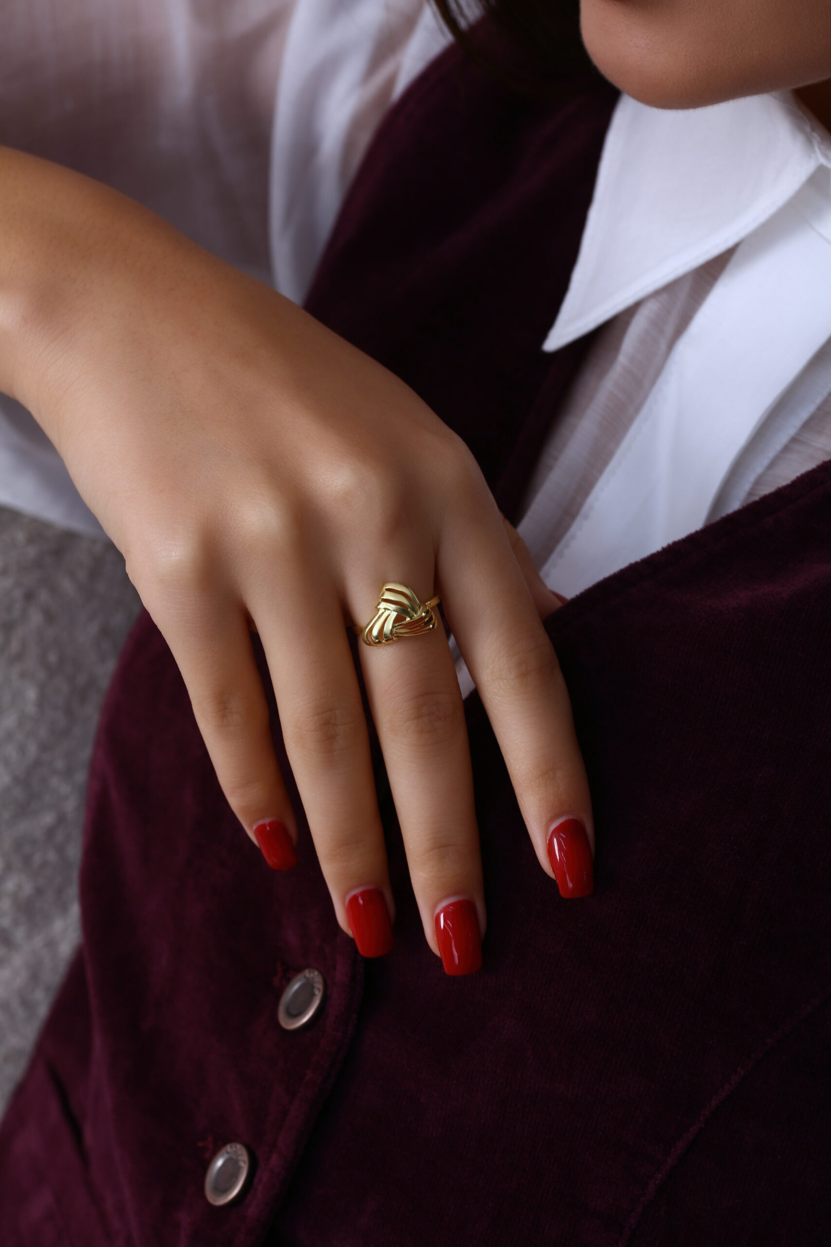 Kıvrımlı şeritlerin oluşturduğu düğüm formu, yüzüğe hem modern hem de sanatsal bir karakter kazandırır. GoldPark’ın sade ama iddialı tasarım çizgisine uygun bu model, günlük kombinlerde hafif bir şıklık arayanlar için kusursuz bir tamamlayıcıdır. Minimal dokusu sayesinde farklı yüzüklerle rahatlıkla kombine edilebilir.