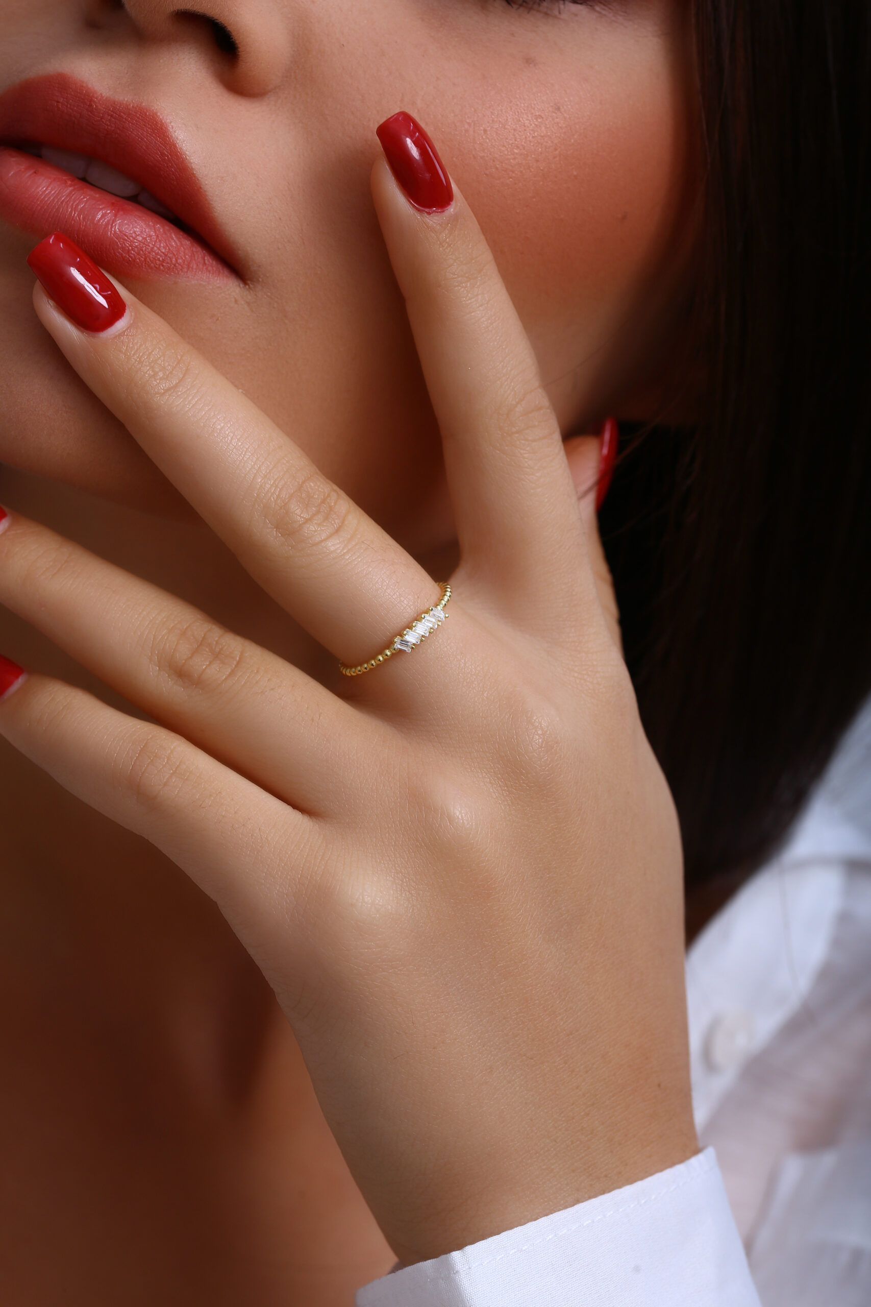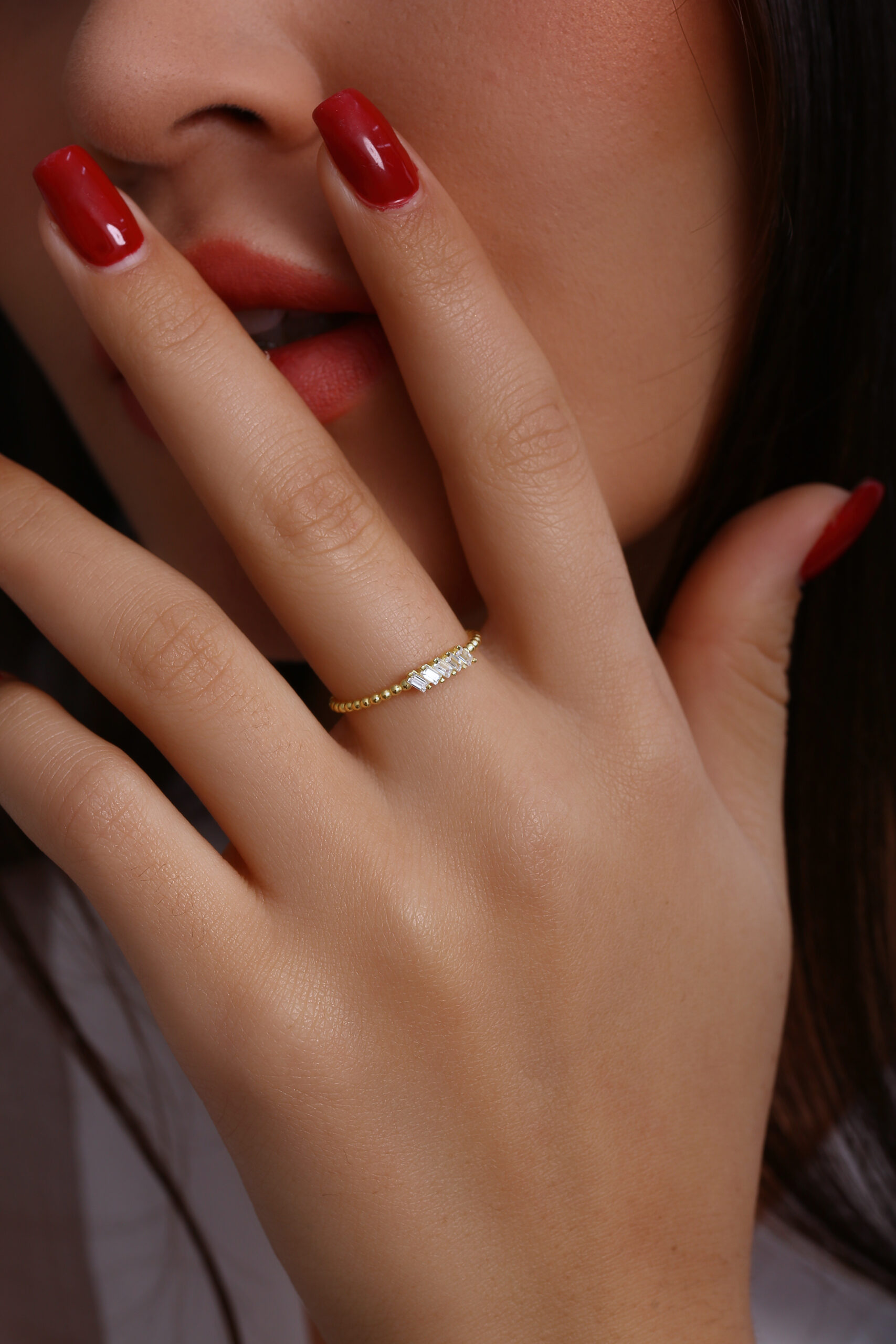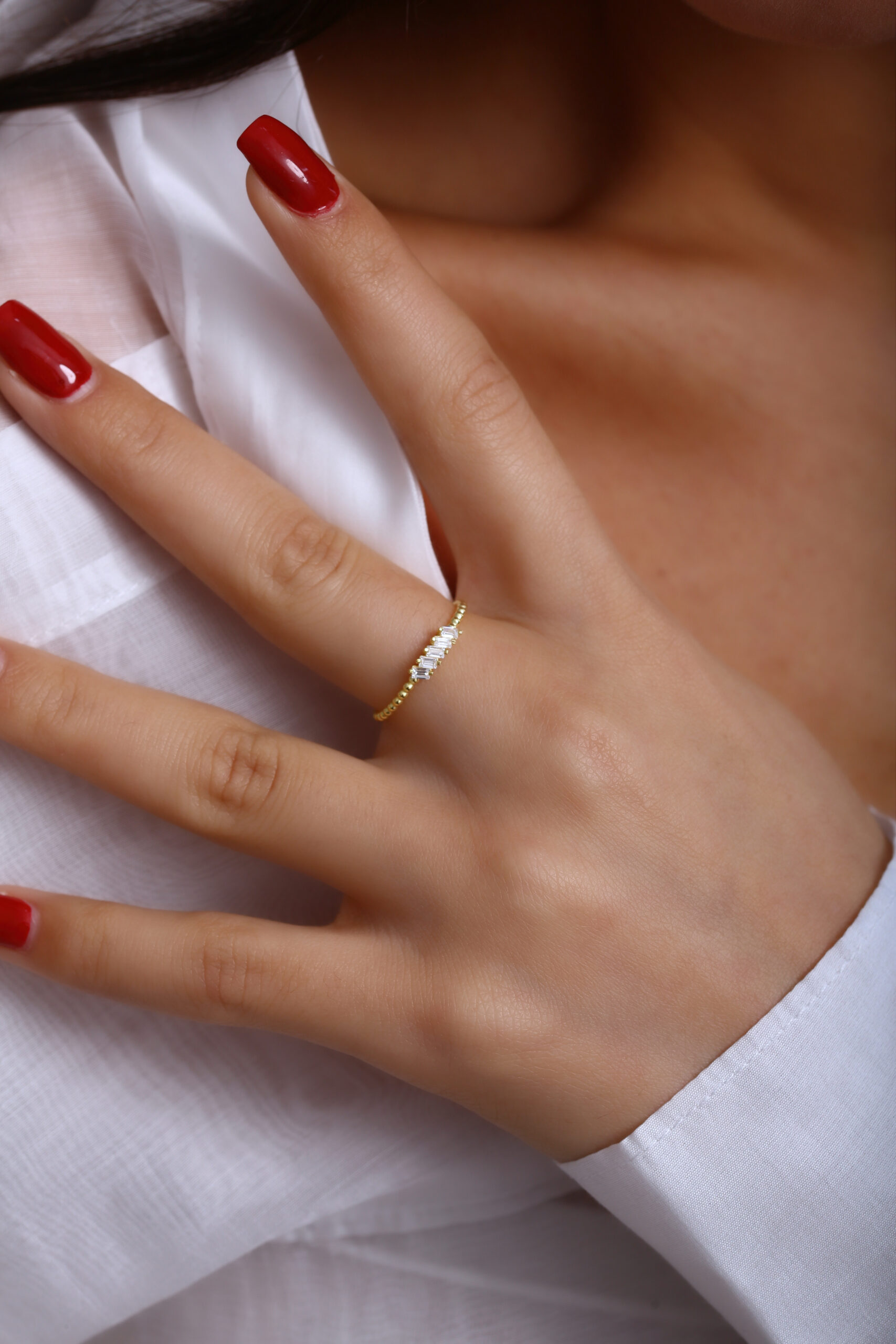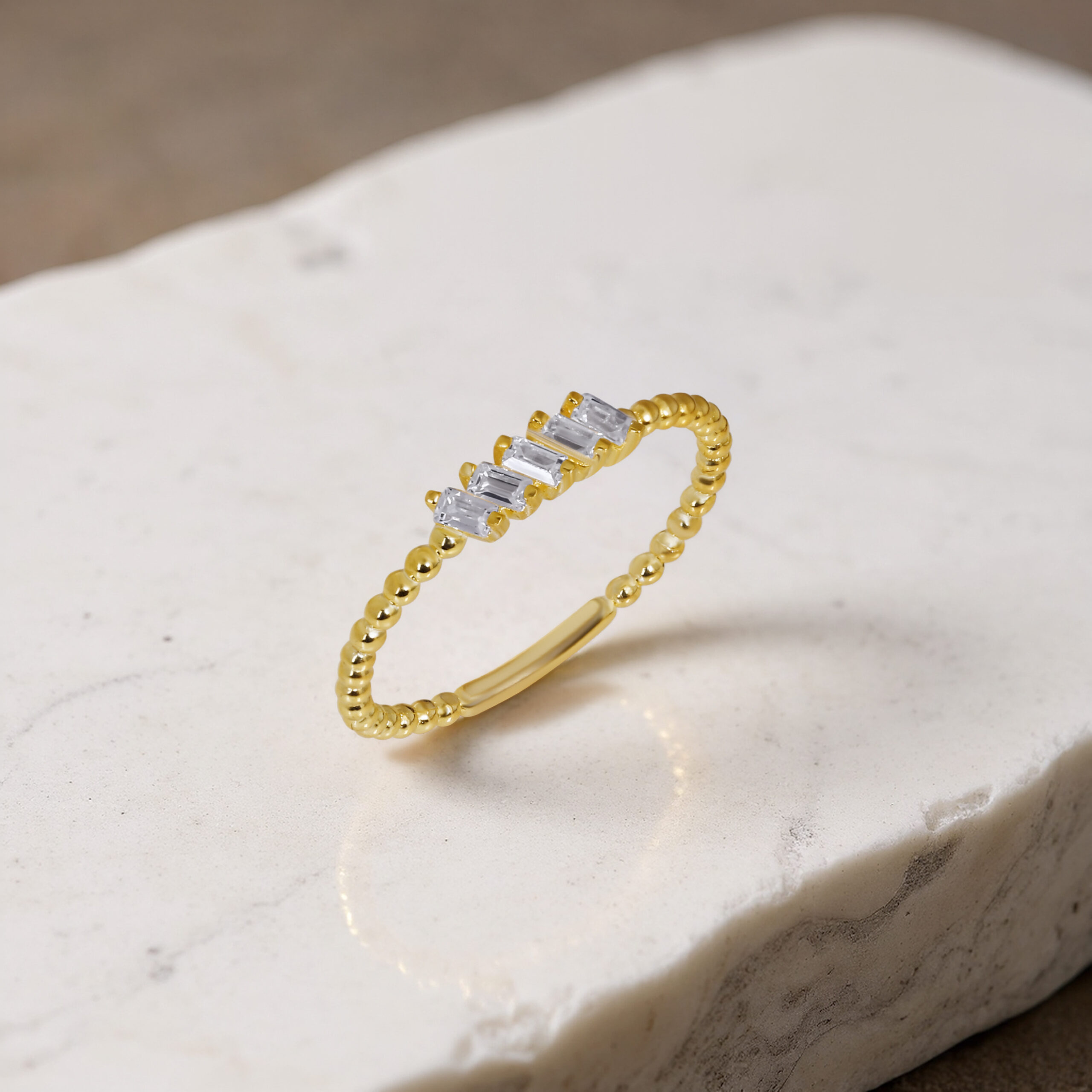 Boncuklu ince bant yapısı ve üstte yer alan dört baget taş dizilimiyle minimal şıklığı bir araya getirir. GoldPark’ın hafif, günlük kullanıma uygun özel tasarımlarından biridir. Tek başına veya diğer yüzüklerle kombinlemeye uygundur.