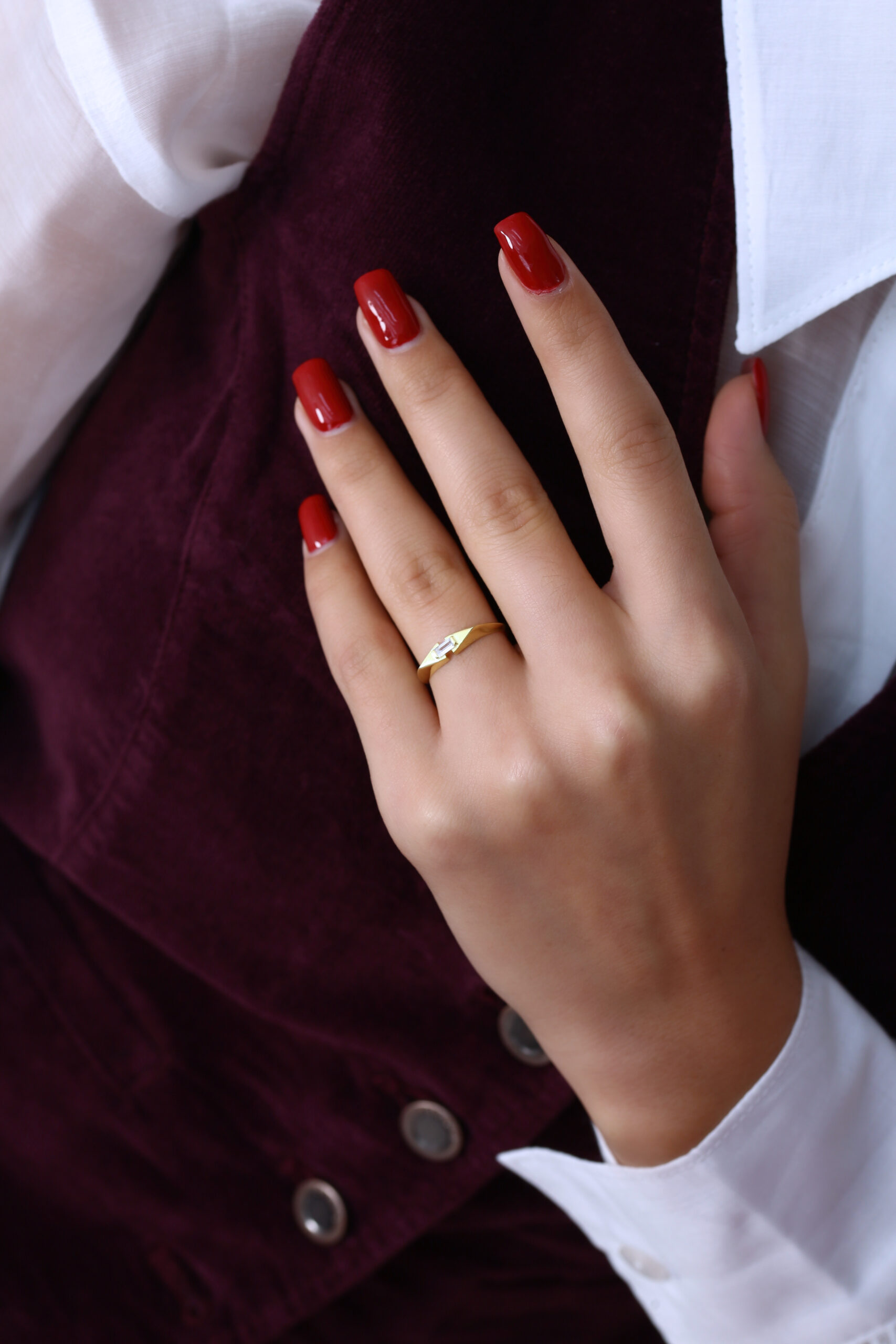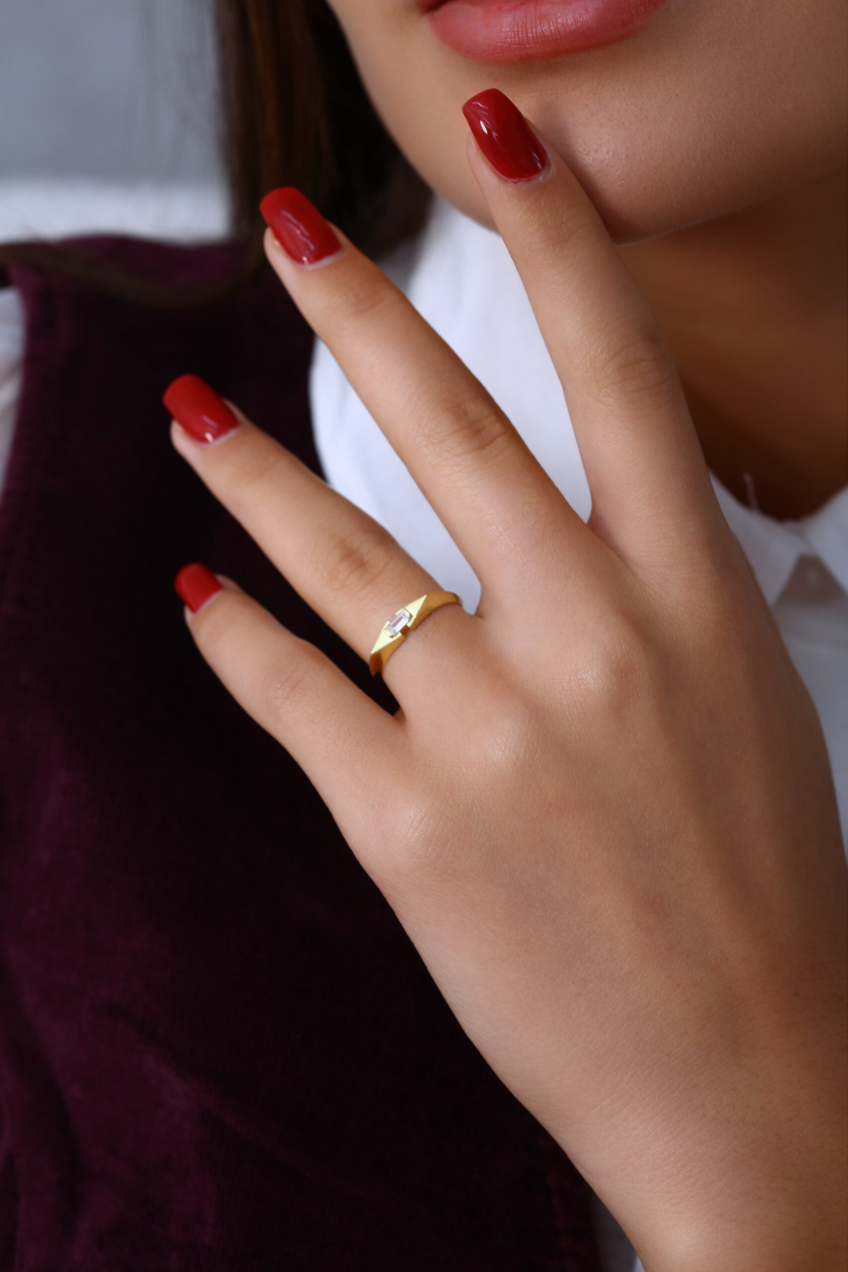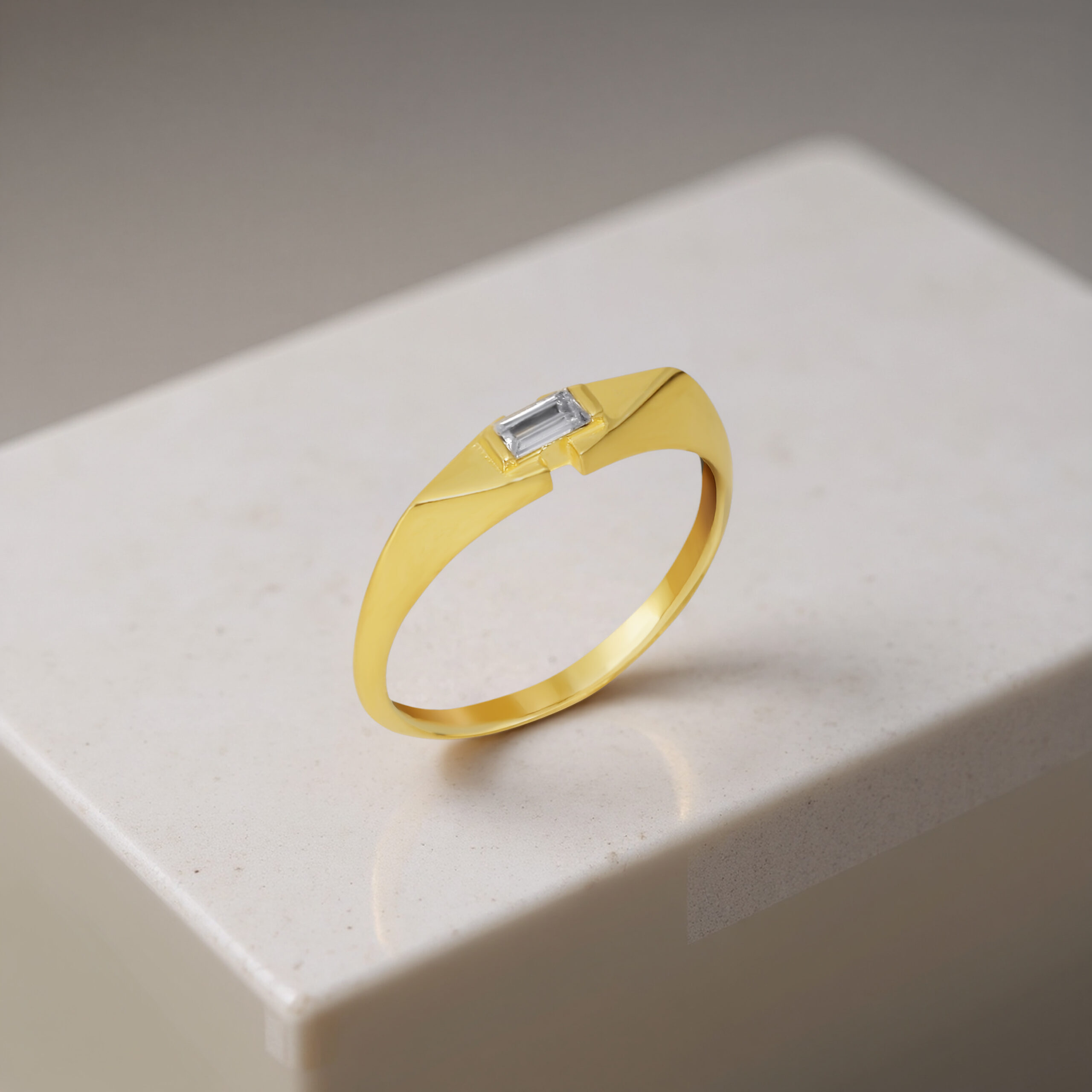 Sade ve keskin hatlarıyla dikkat çeken bu baget taş yüzük, minimal tasarımıyla her stile kolayca uyum sağlar. İnce kesim baget taş modern bir ışıltı katarken, yüzüğün hafif formu gün boyu rahat kullanım sunar. Minimal ama etkili bir aksesuar arayan kadınlar için ideal bir tercih.