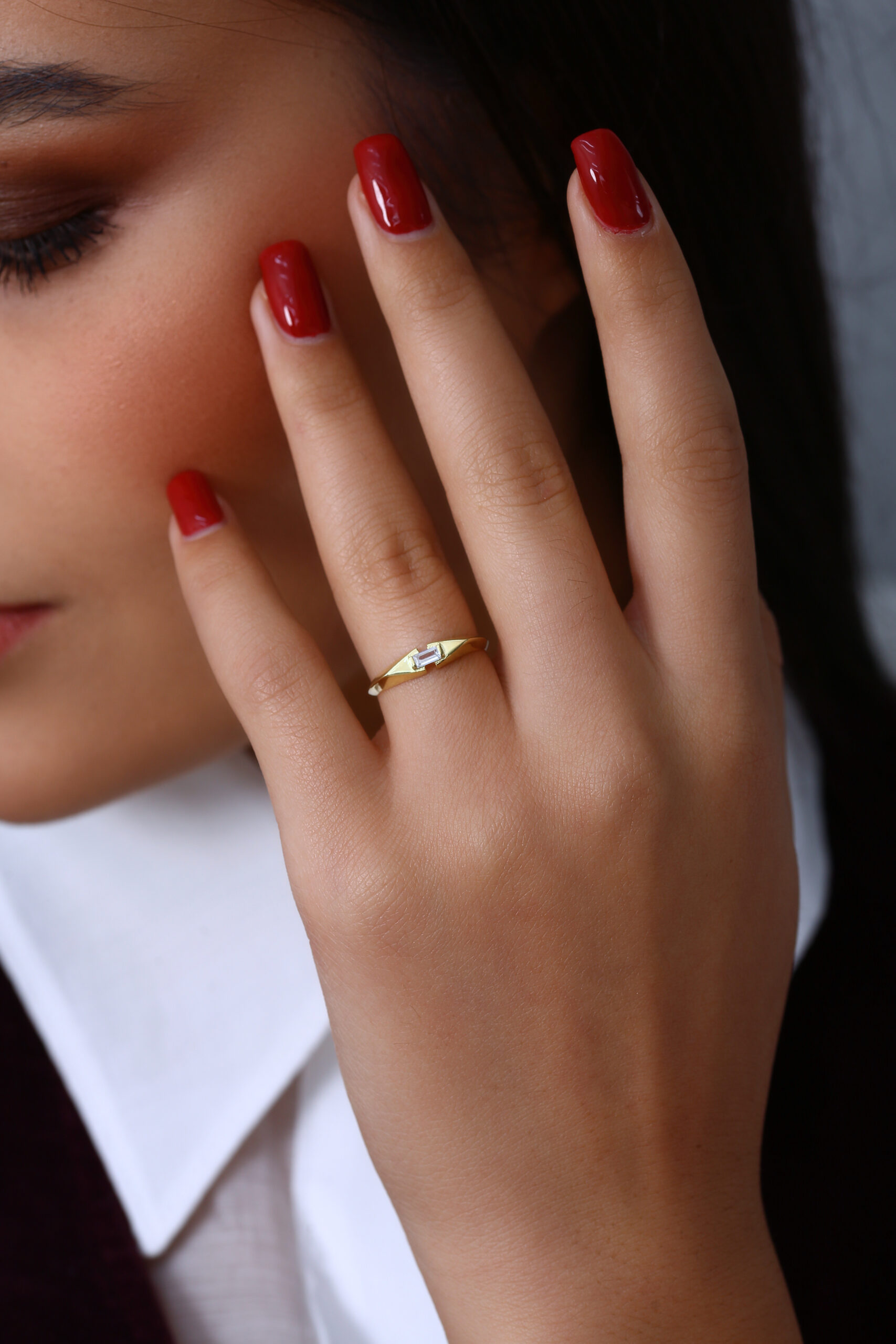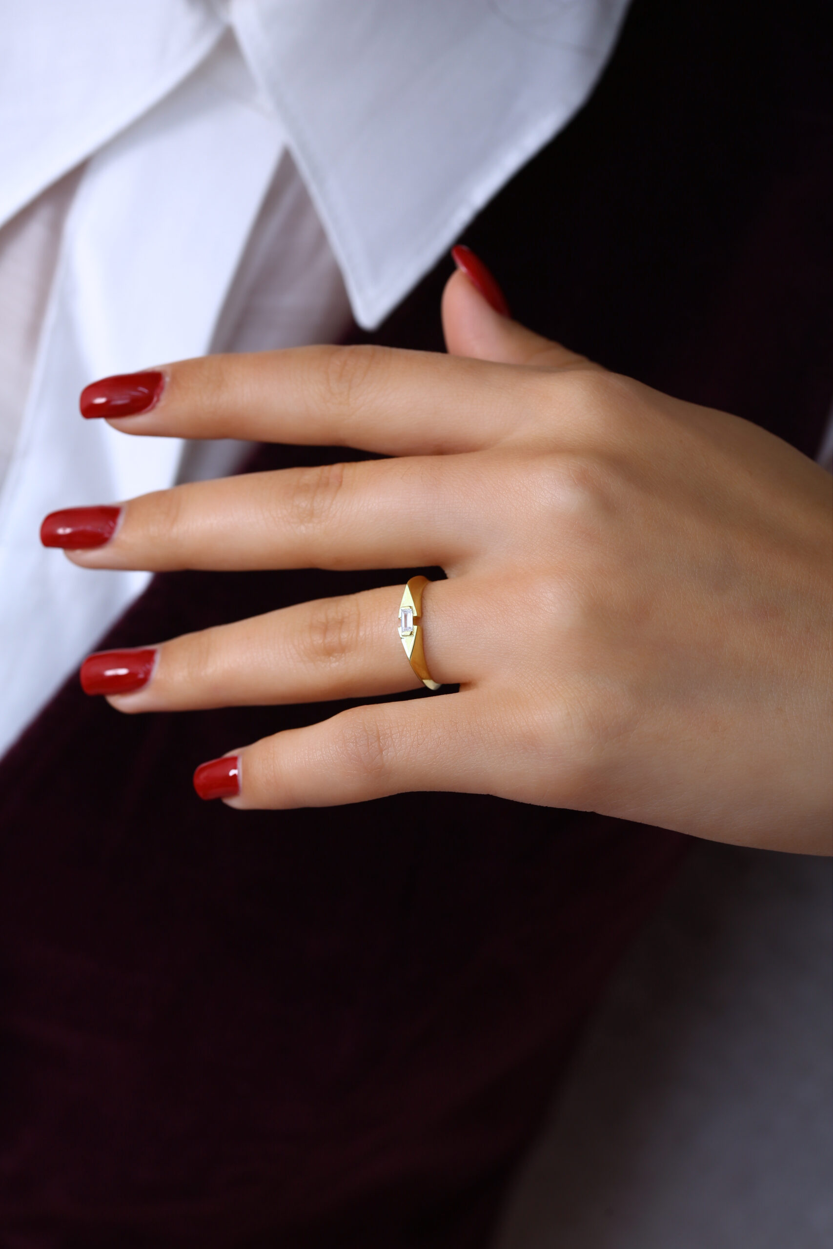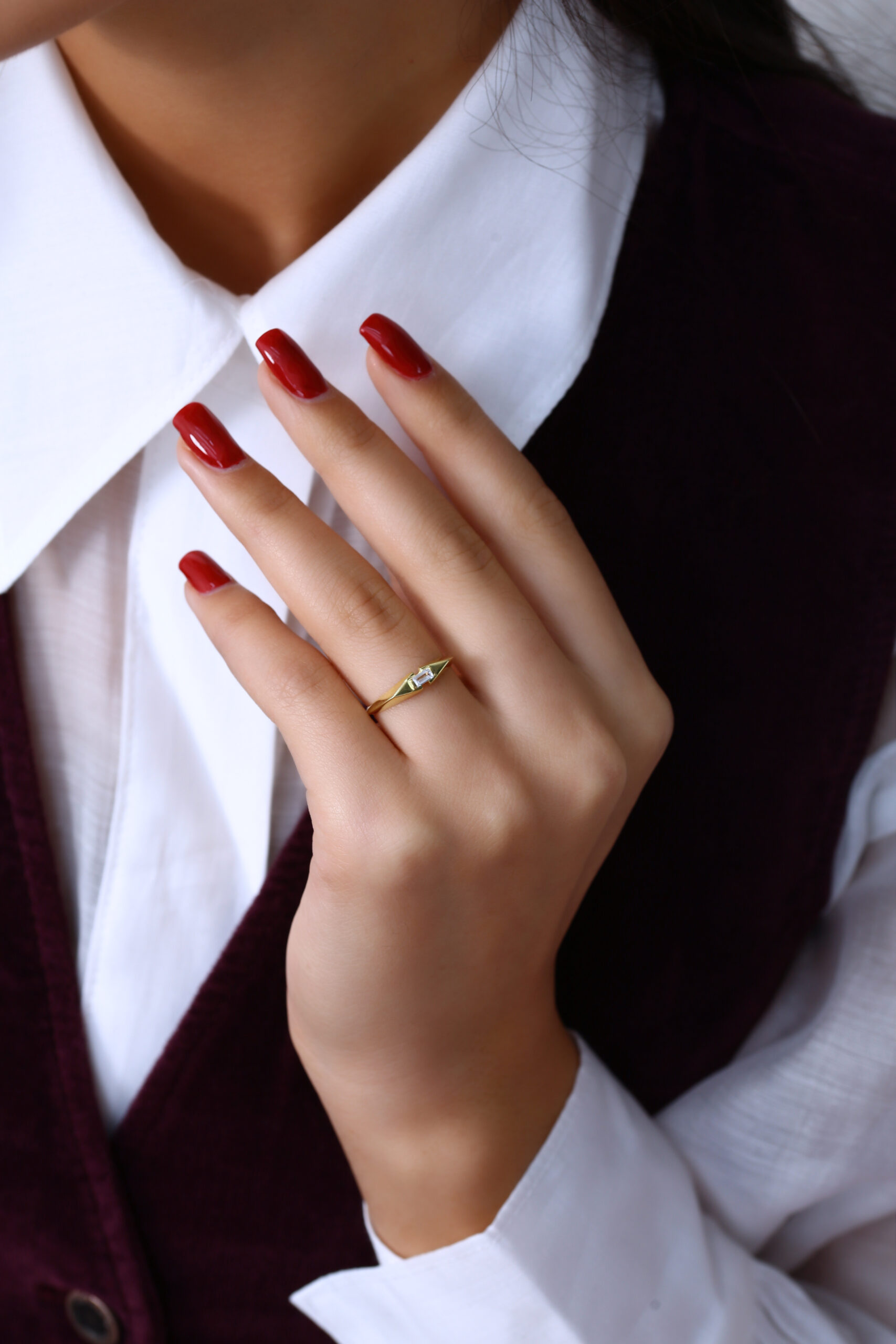 Sade ve keskin hatlarıyla dikkat çeken bu baget taş yüzük, minimal tasarımıyla her stile kolayca uyum sağlar. İnce kesim baget taş modern bir ışıltı katarken, yüzüğün hafif formu gün boyu rahat kullanım sunar. Minimal ama etkili bir aksesuar arayan kadınlar için ideal bir tercih.