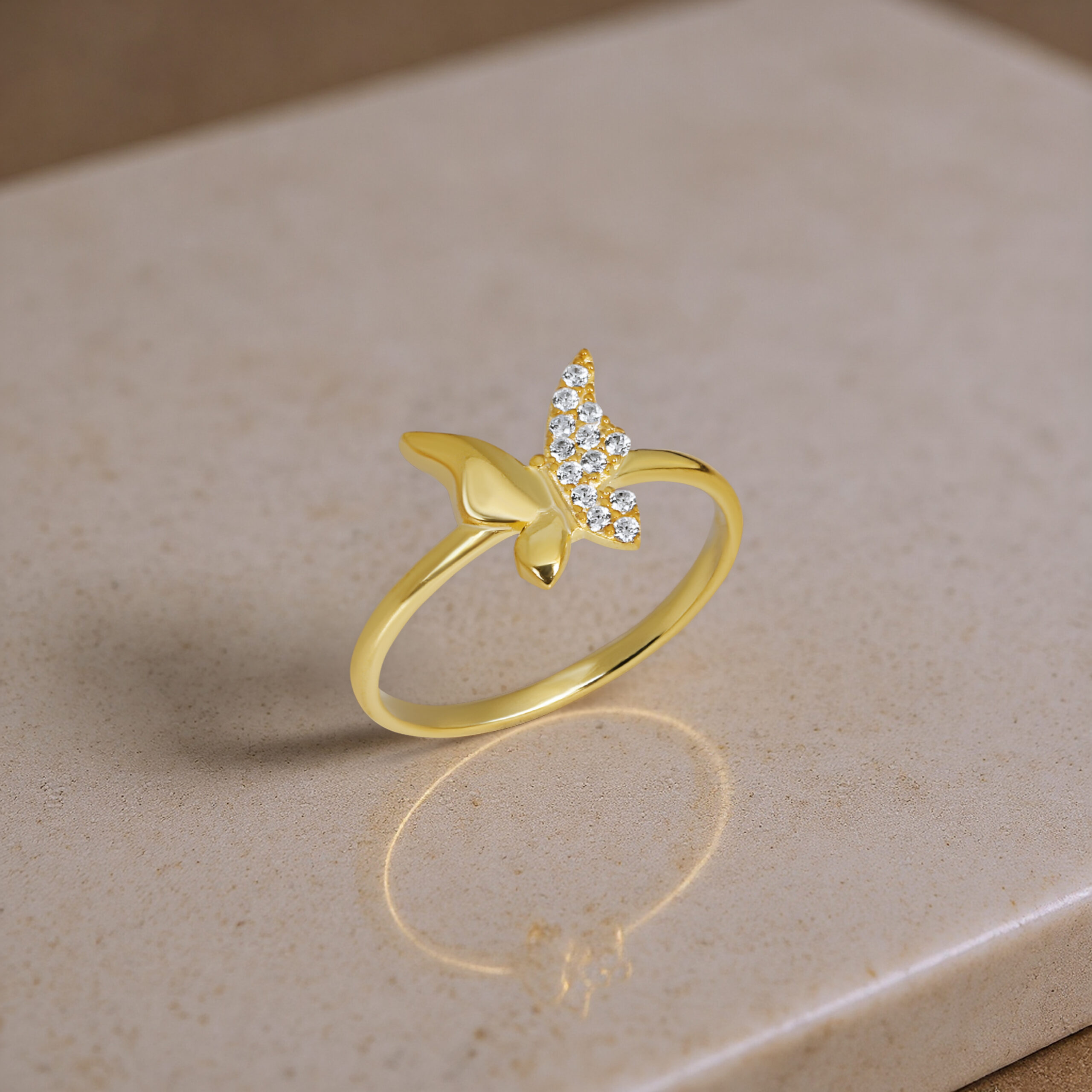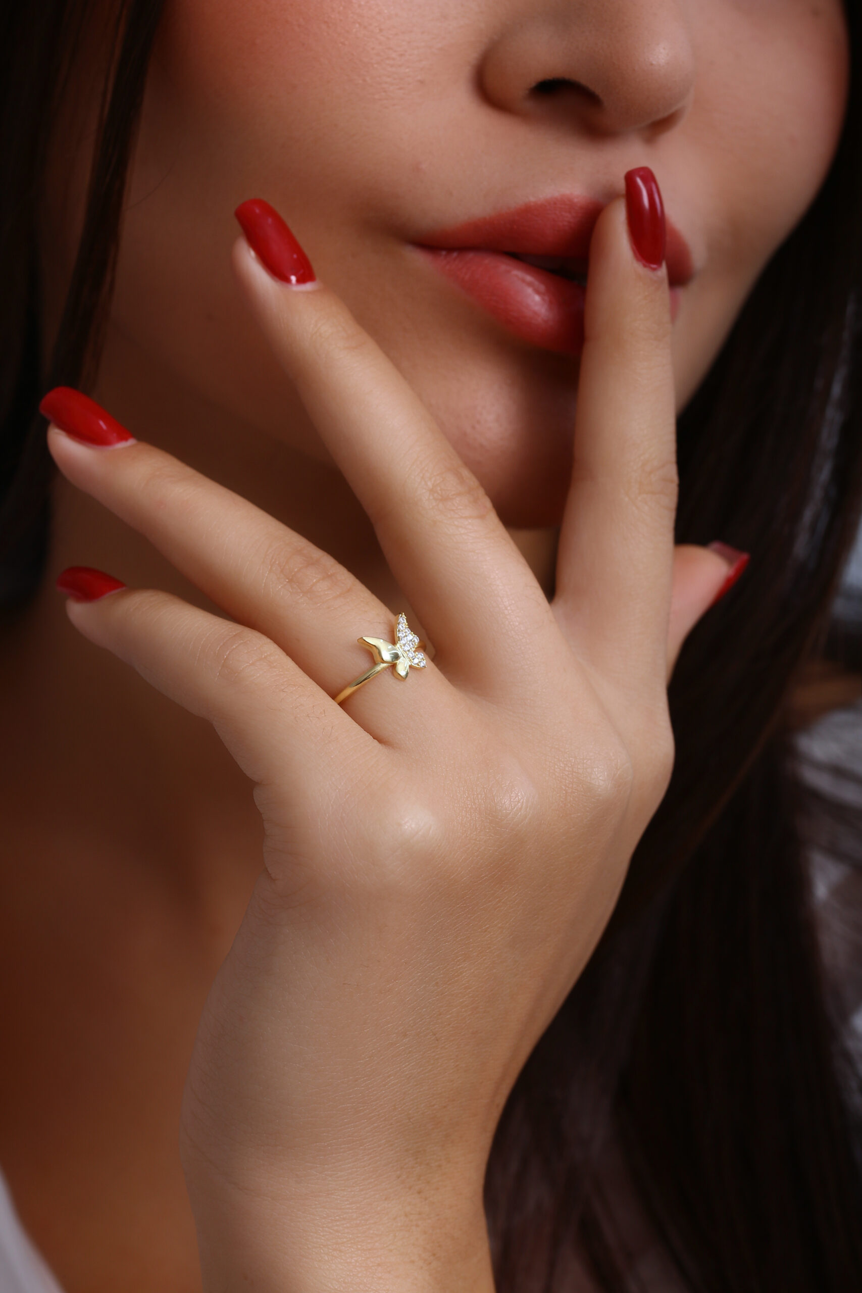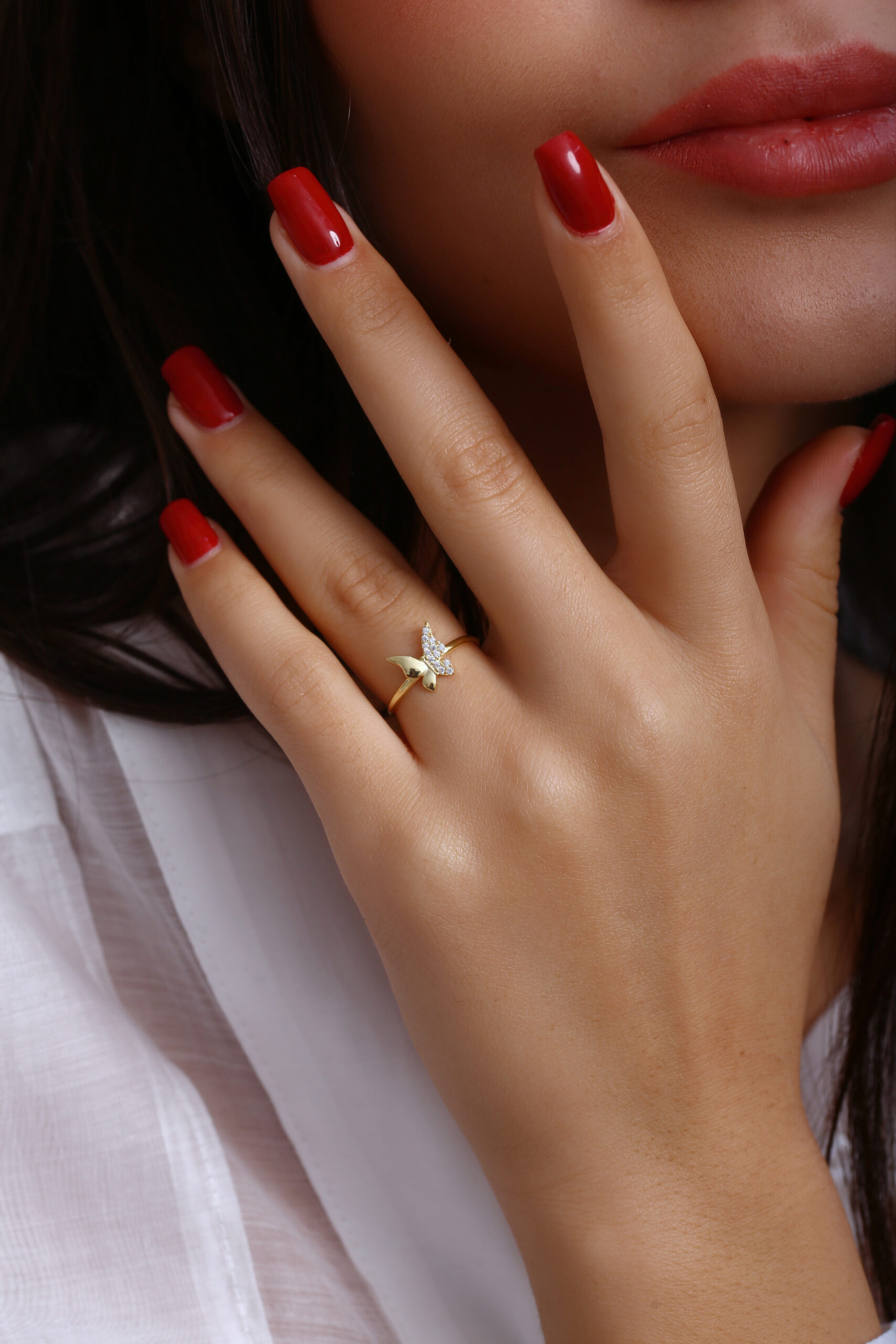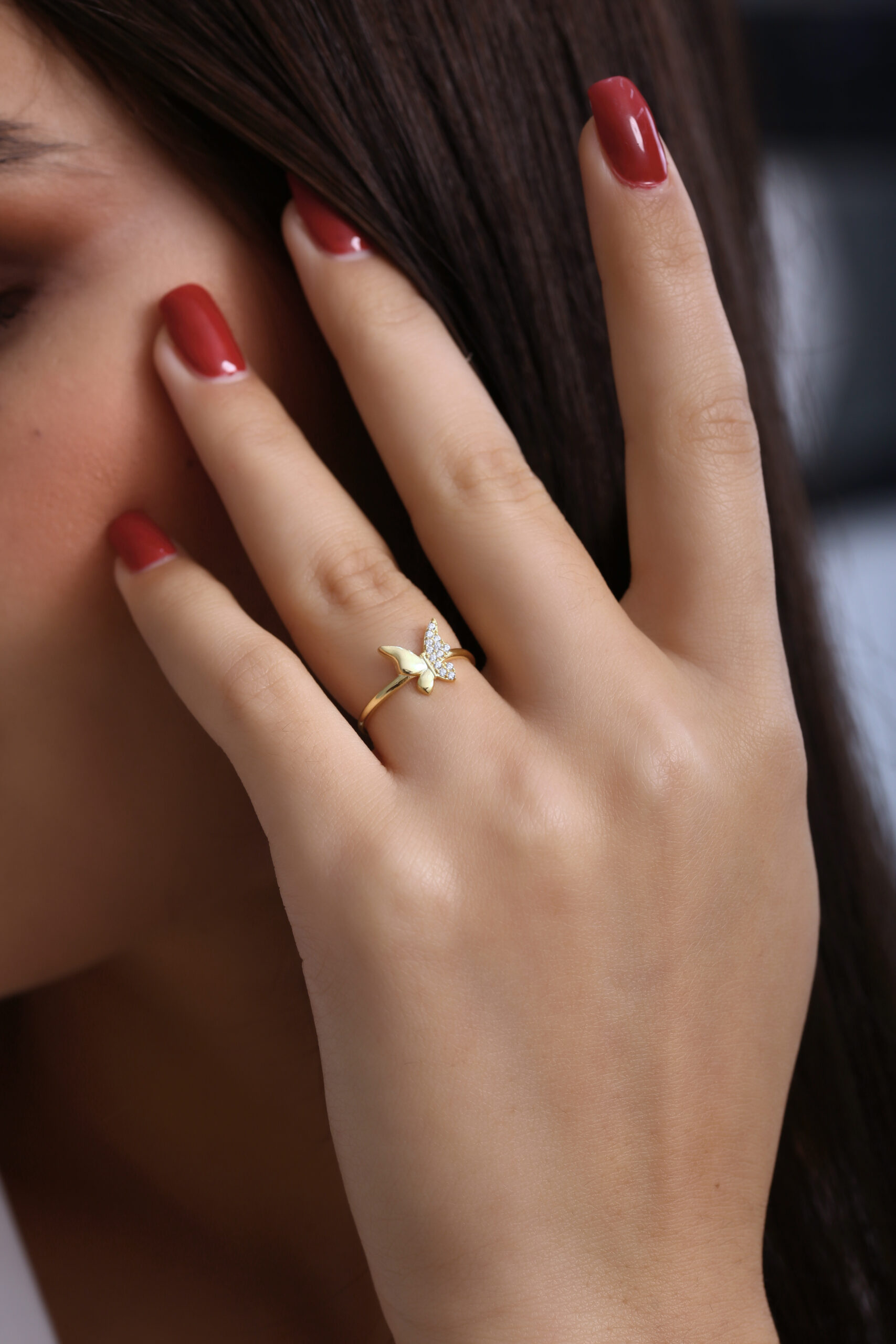 Taş işçiliği ile detaylandırılmış kelebek figürü, yüzüğe feminen ve zarif bir dokunuş katar. Hafif ve ince yapısıyla günlük kullanıma uygundur. GoldPark’ın sembolik ve şık figürlü yüzük koleksiyonunun özel parçalarındandır.
