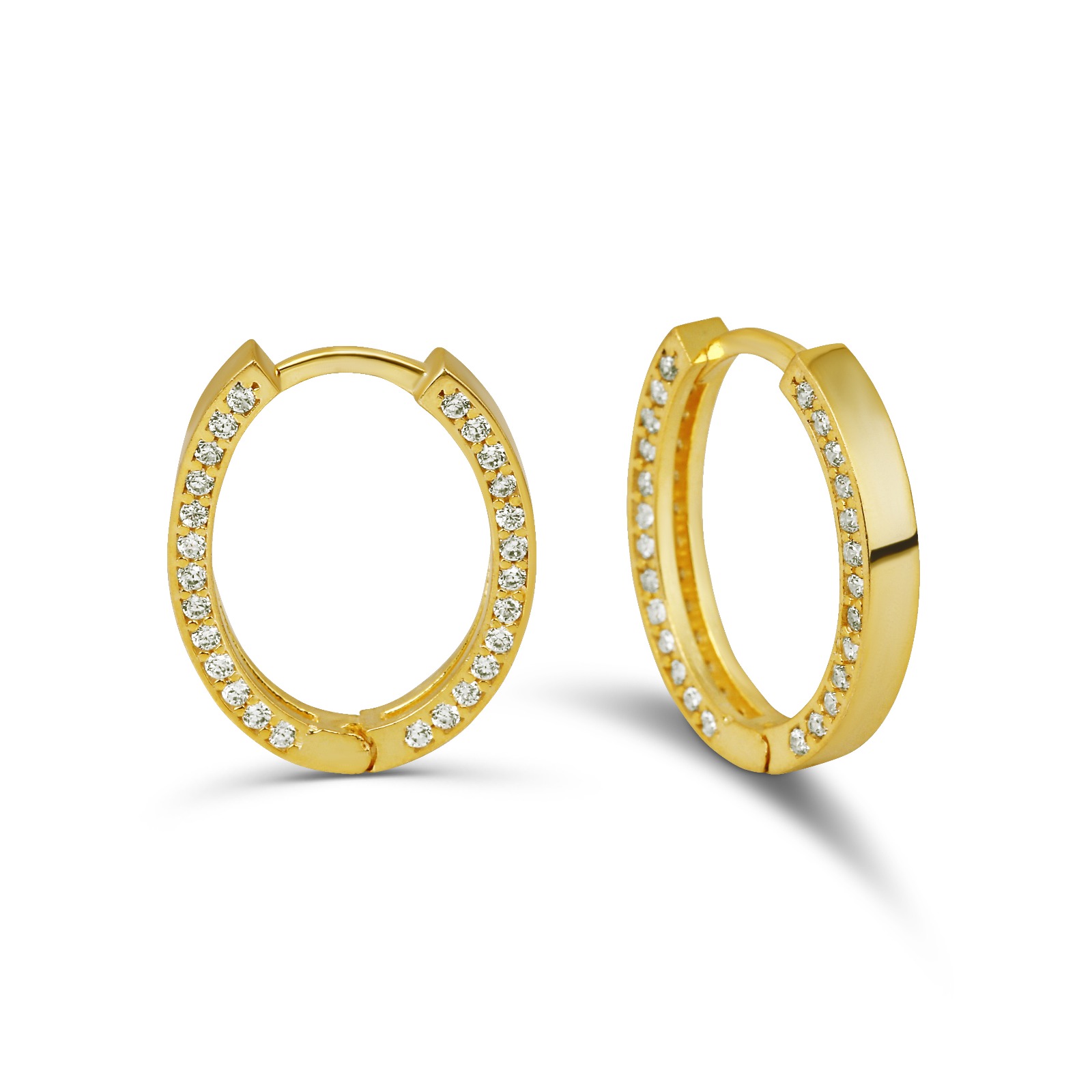 Altın kaplama 925 ayar gümüşten üretilen bu taşlı halka küpe, sade tasarımına rağmen güçlü bir ışıltı sunar.
