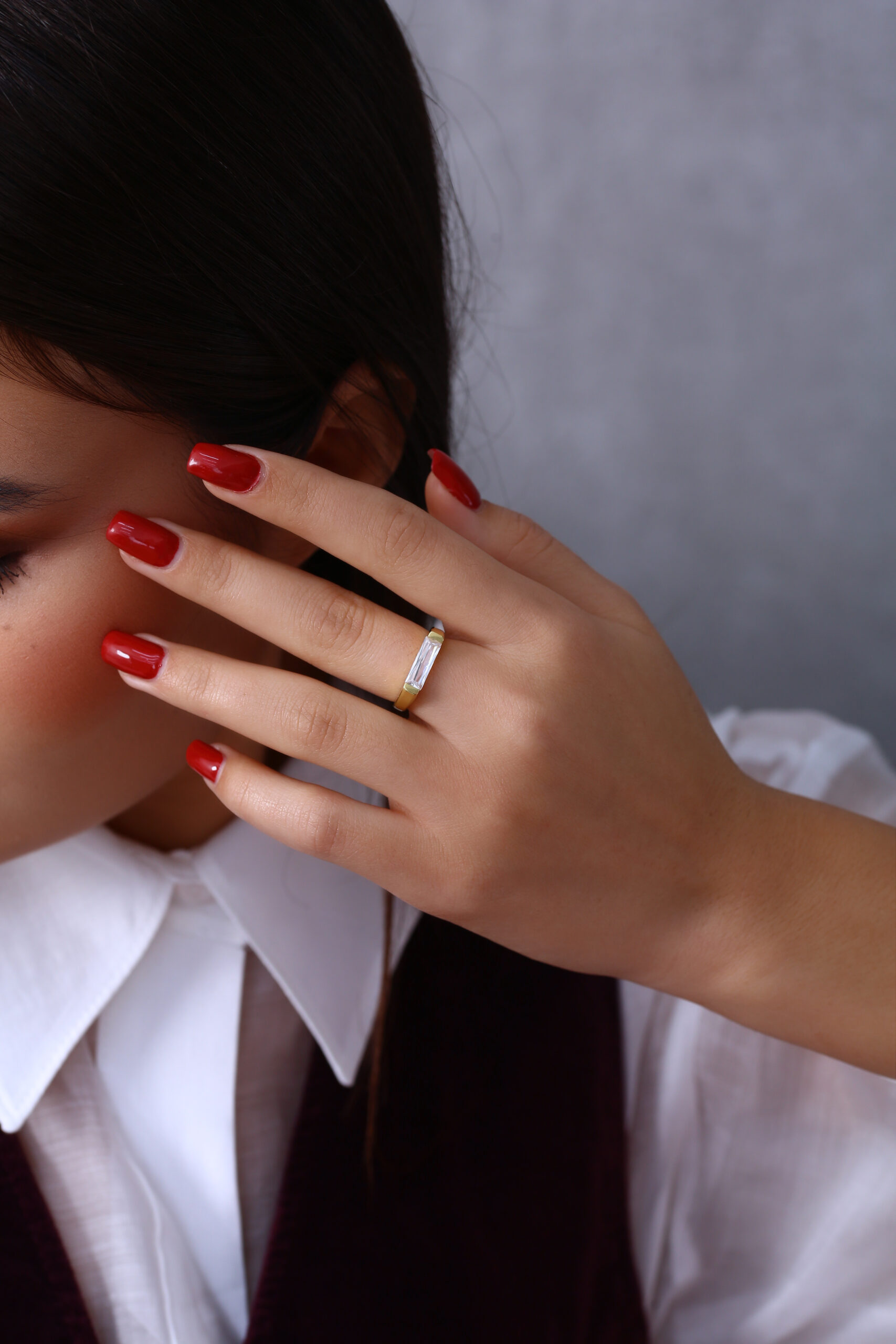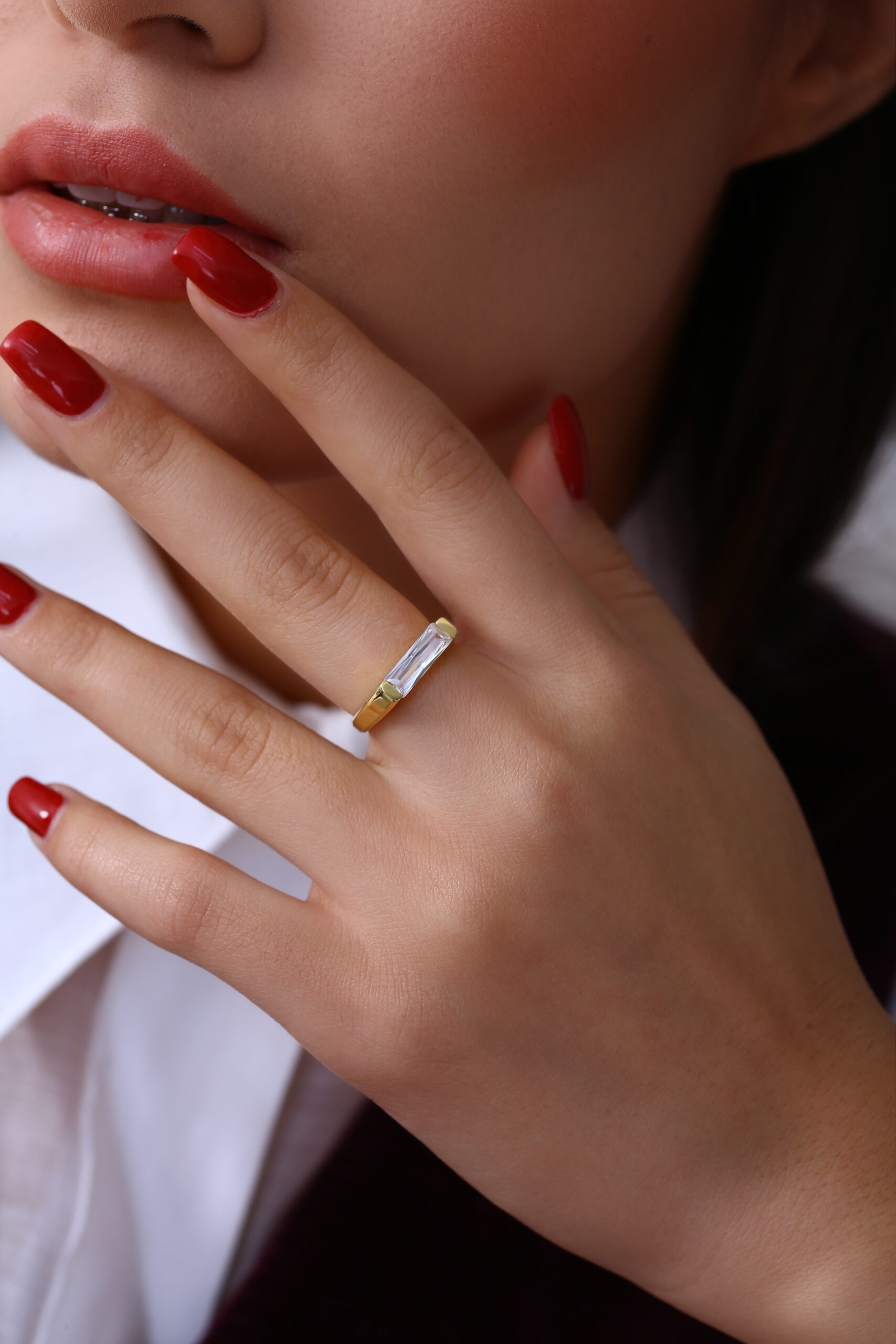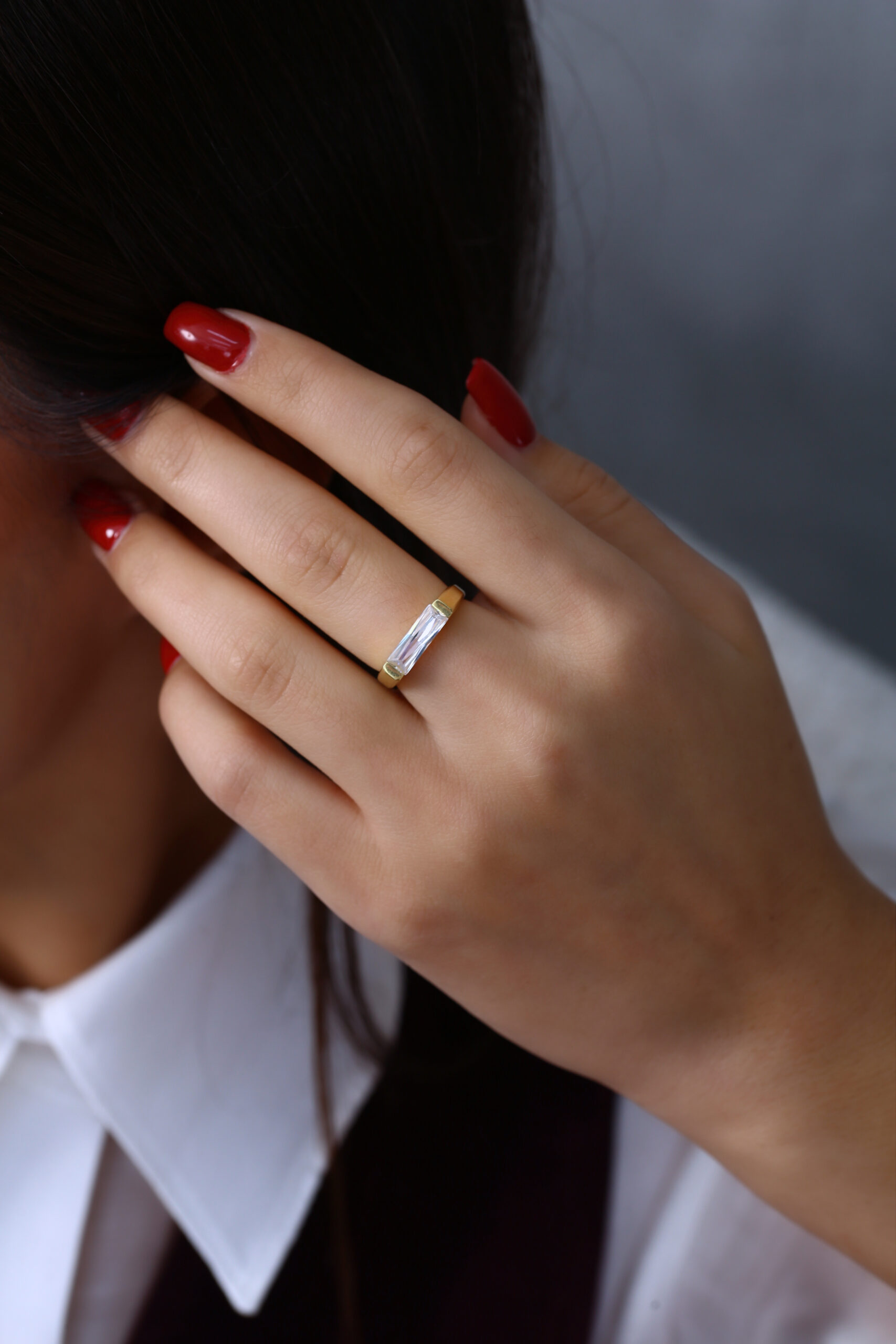 Modern uzun baget taşı ve sade yüzük formuyla hem iddialı hem zarif bir duruş sunar.