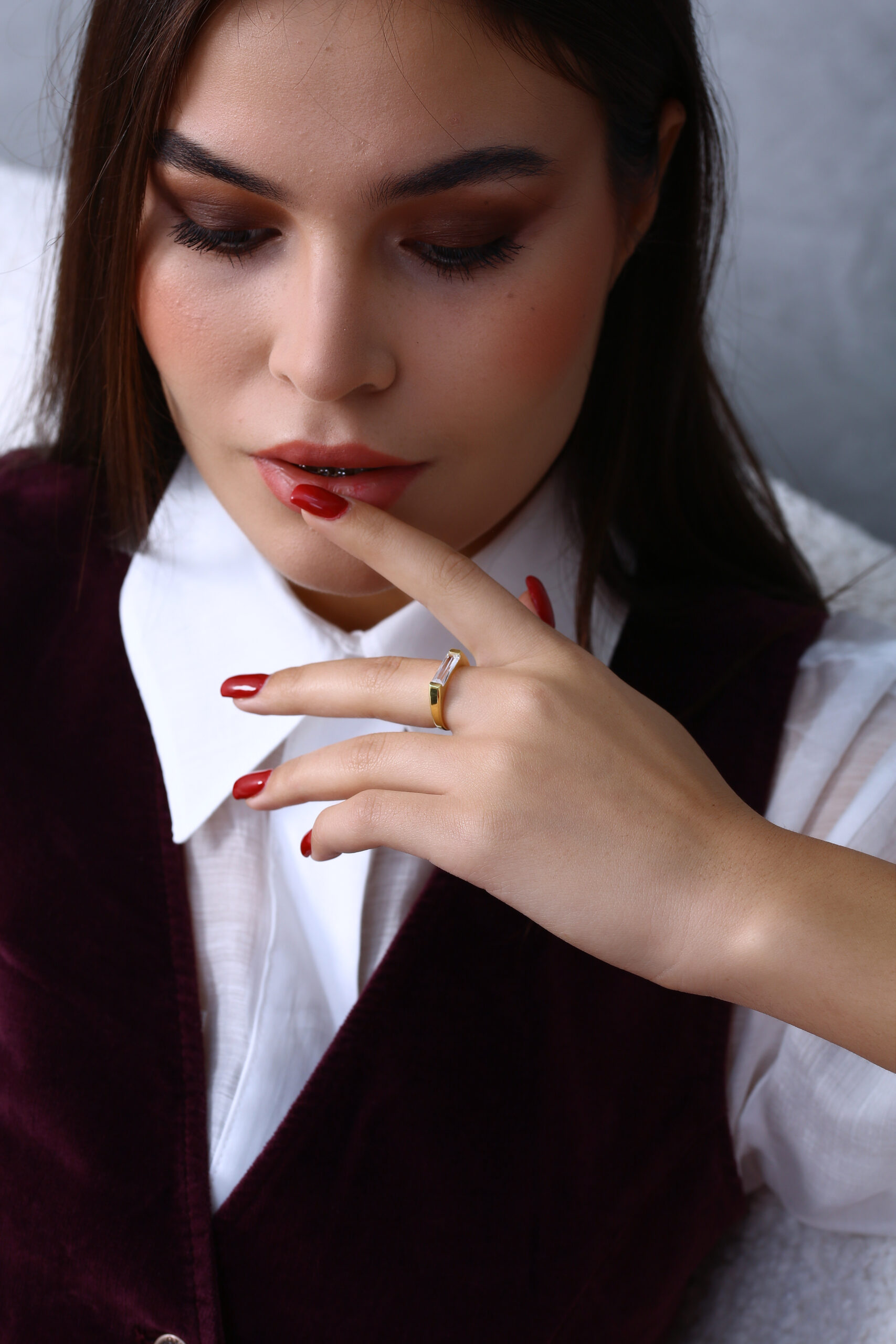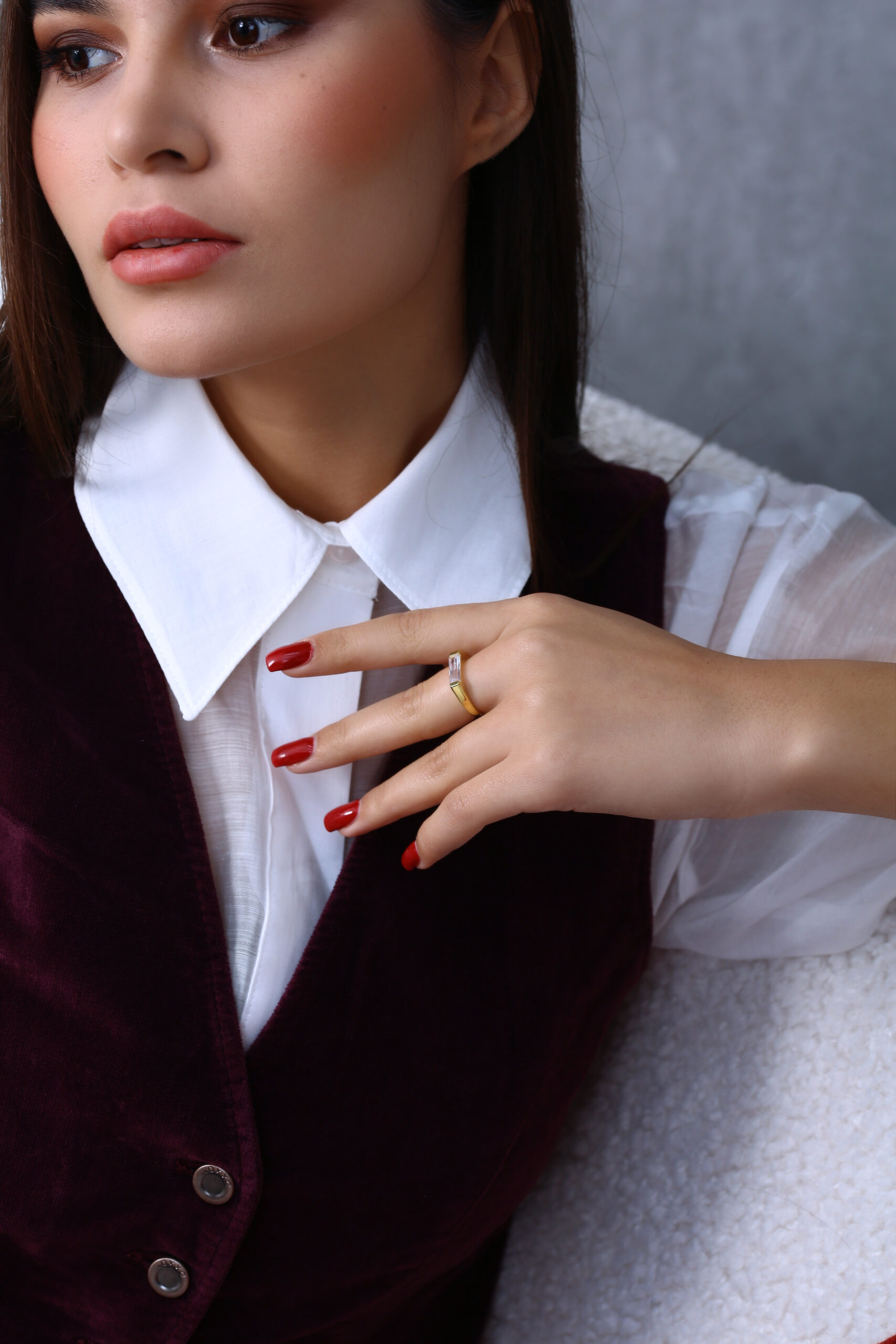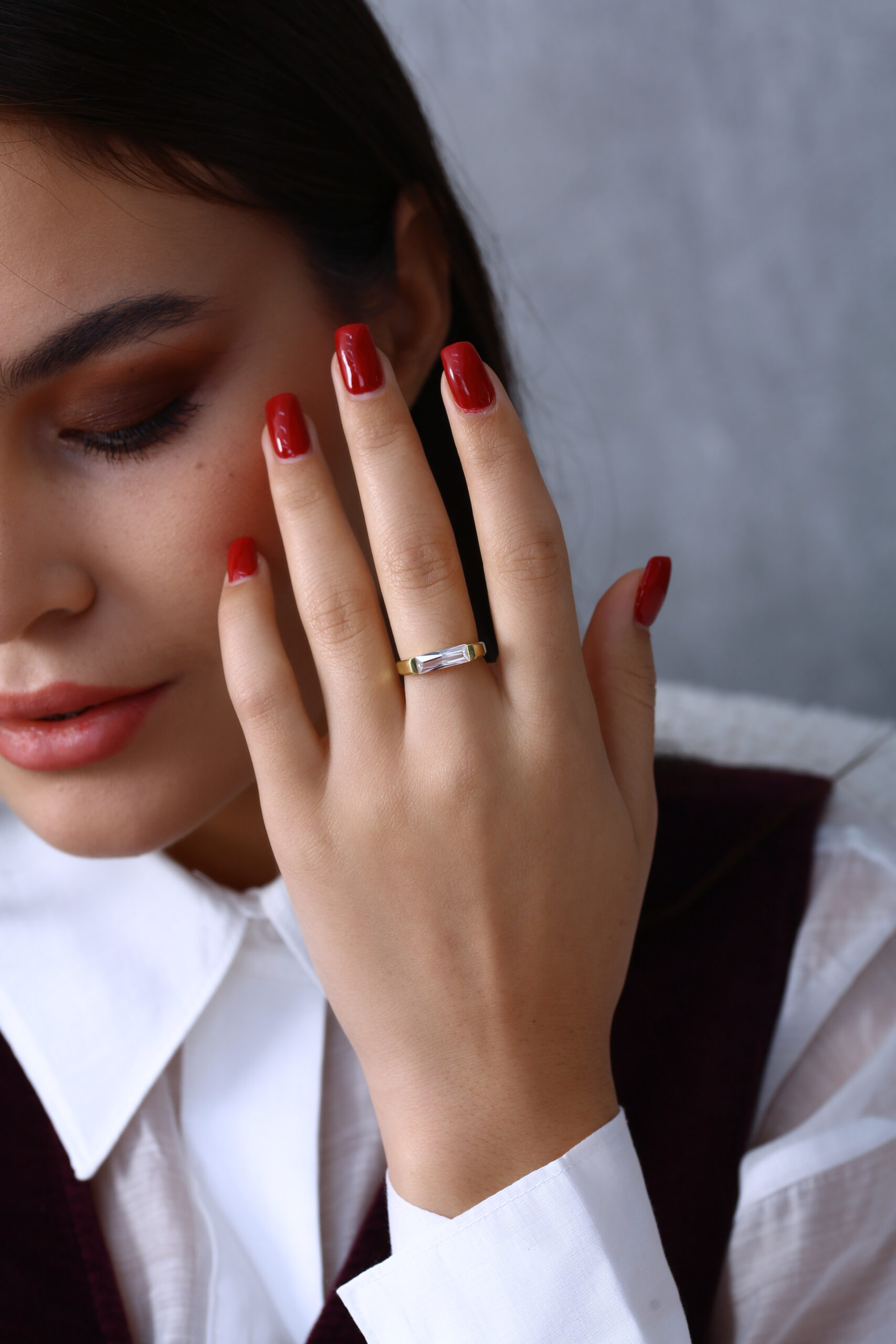 Modern uzun baget taşı ve sade yüzük formuyla hem iddialı hem zarif bir duruş sunar.