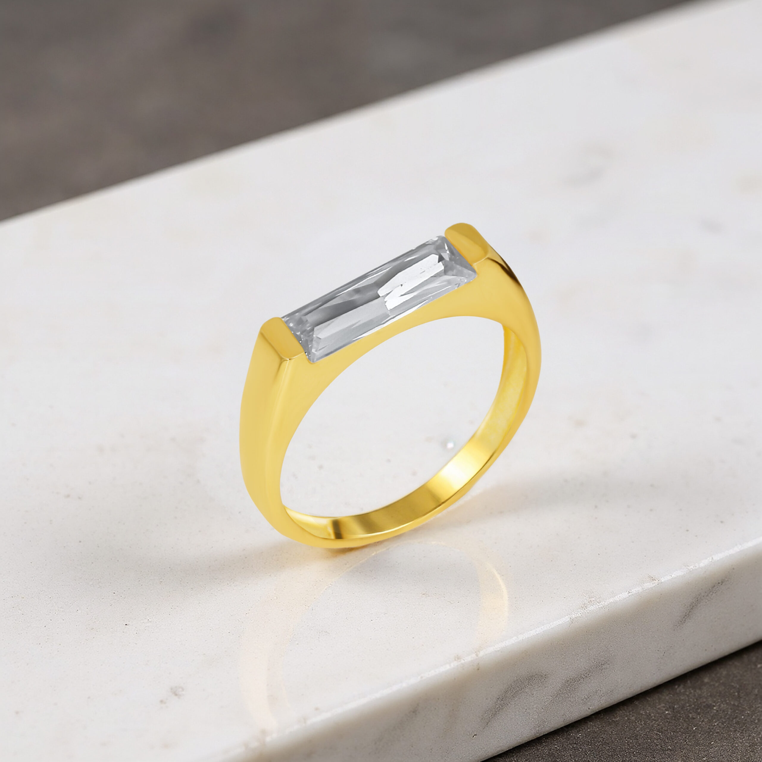 Uzun dikdörtgen baget taşın merkezde güçlü bir vurgu oluşturduğu bu model, sade gövde tasarımıyla zamansız bir modernlik sunar. GoldPark’ın minimal çizgisine uygun şekilde tasarlanan yüzük, tek başına bile güçlü bir stil etkisi yaratır. Günlük kombinlerde sofistike bir dokunuş isteyenler için mükemmeldir.