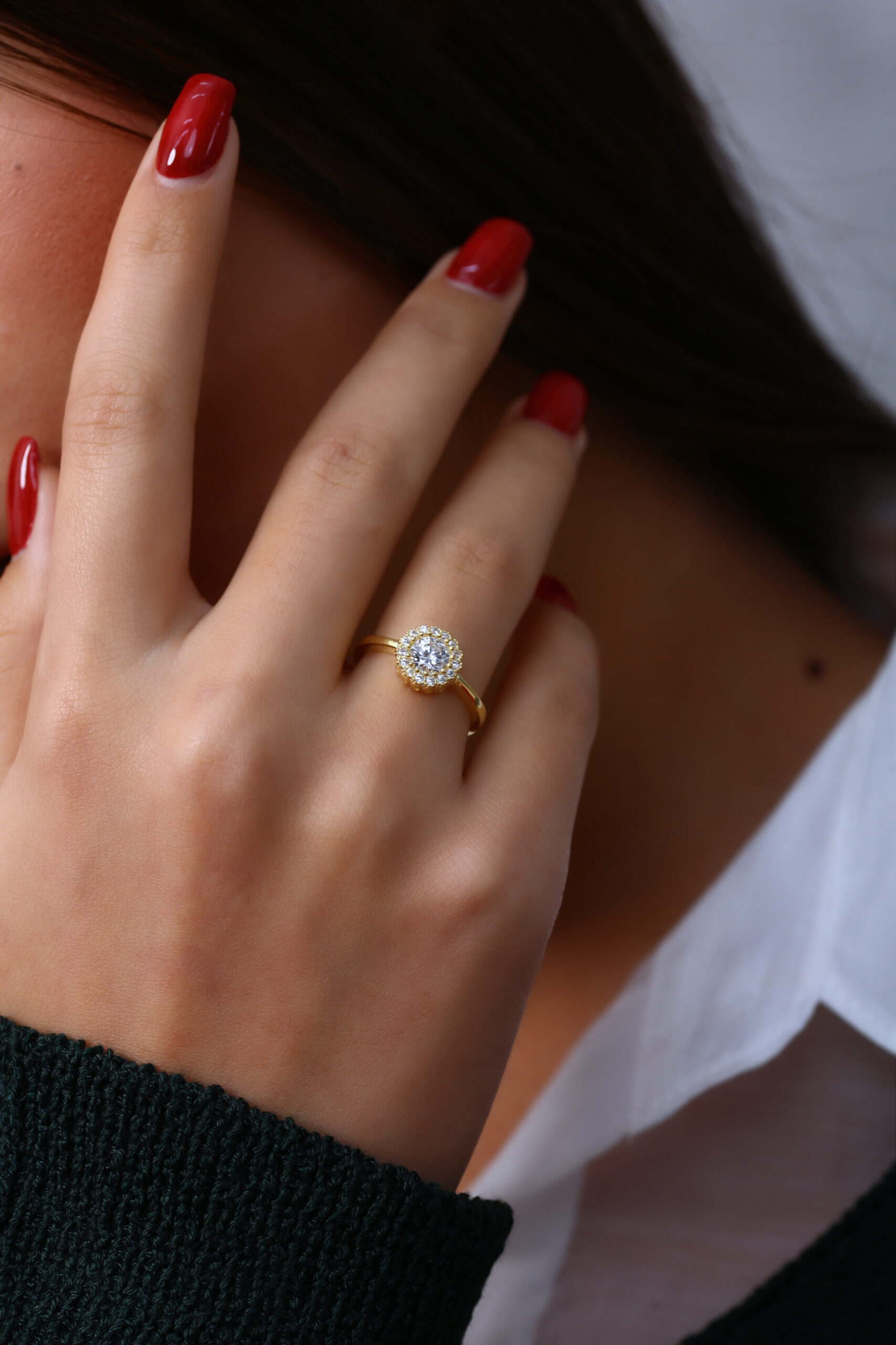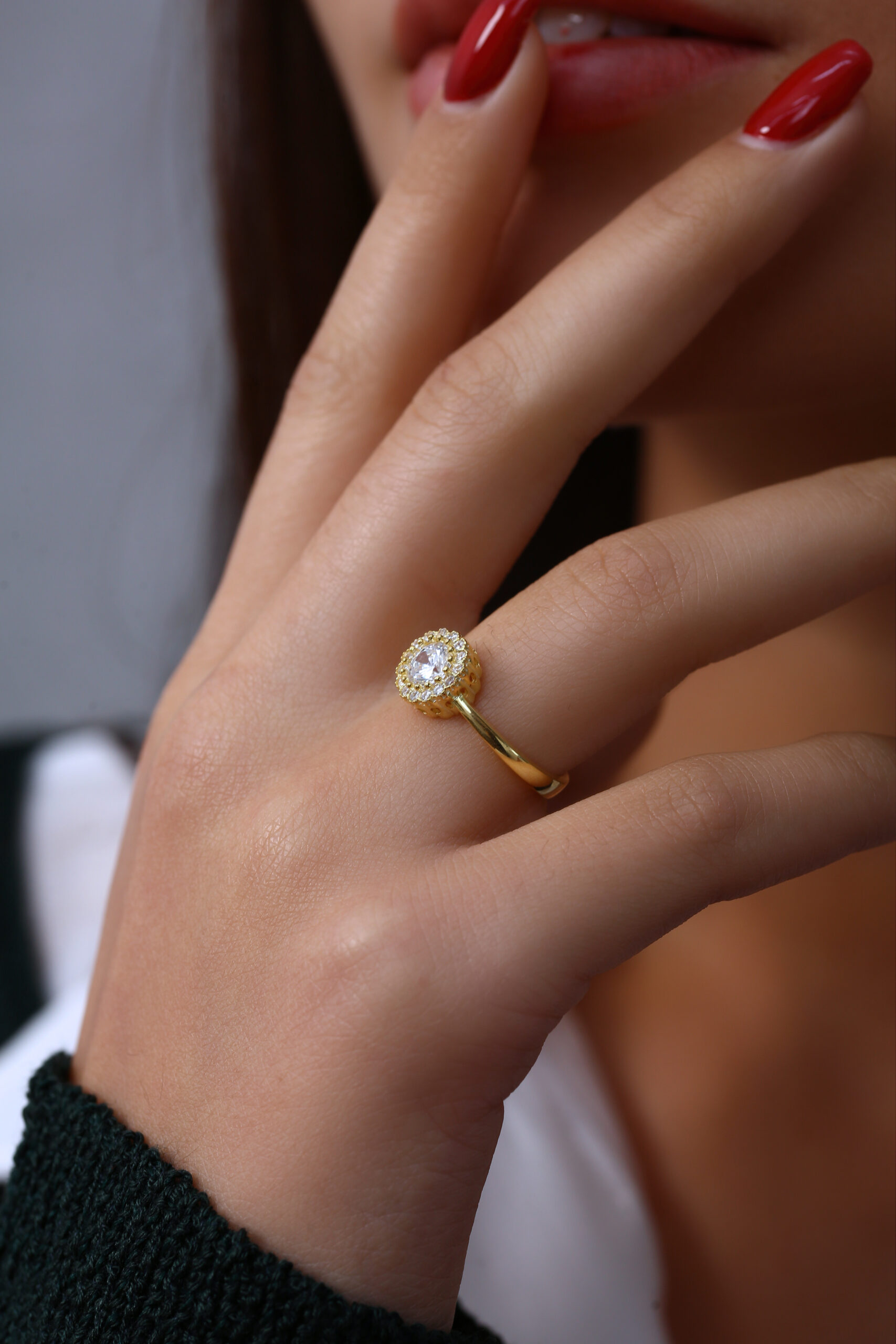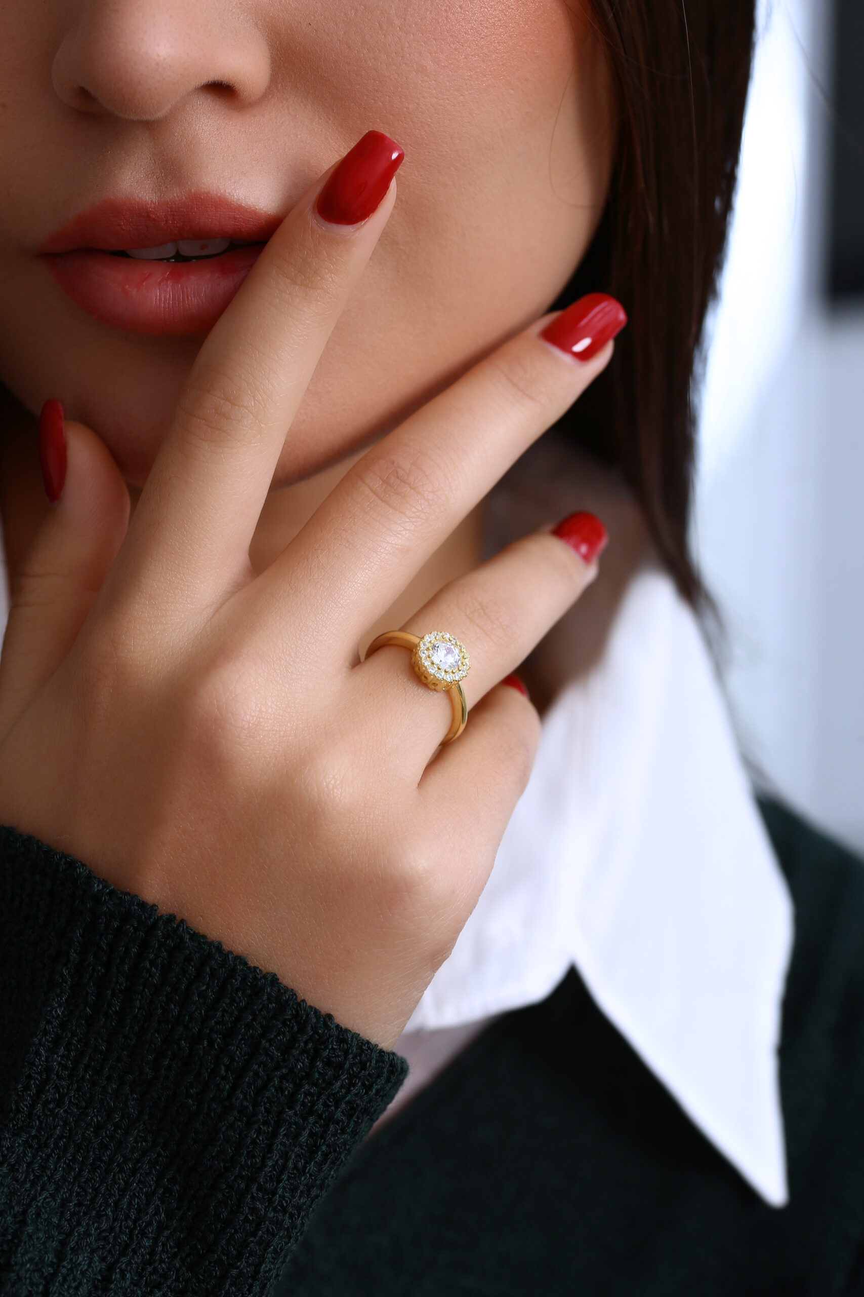 Merkezdeki büyük taş ve etrafını saran ince parlak taşlarla kusursuz bir ışıltı sunan bu yüzük, zarif bir şıklık arayan kadınlar için tasarlandı. Özel kesim orta taş hem günlük kullanımda hem de özel günlerde etkileyici bir görünüm sağlar. Altın kaplama gövdesi modern ve zarif dokunuşlarla tamamlanmıştır.