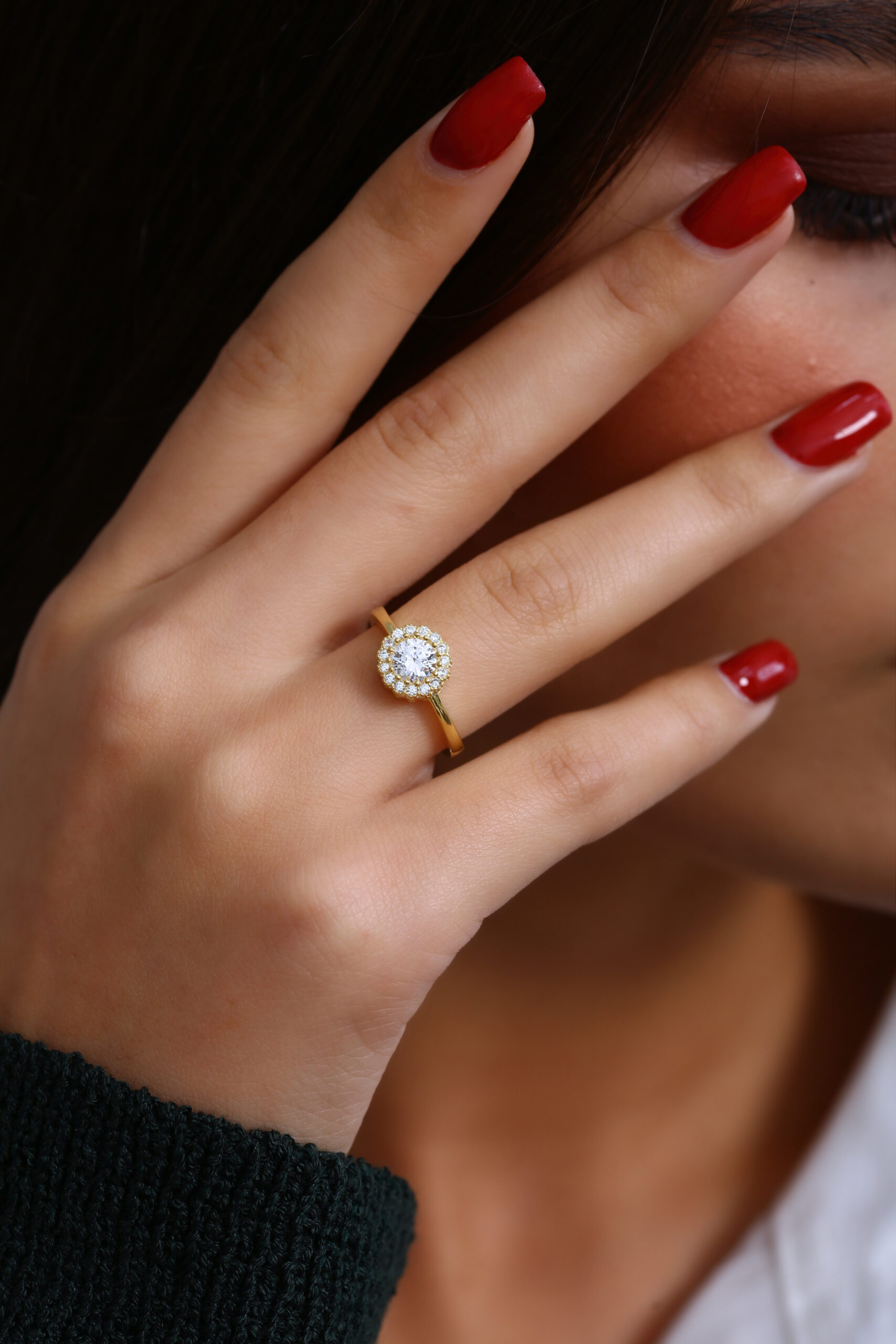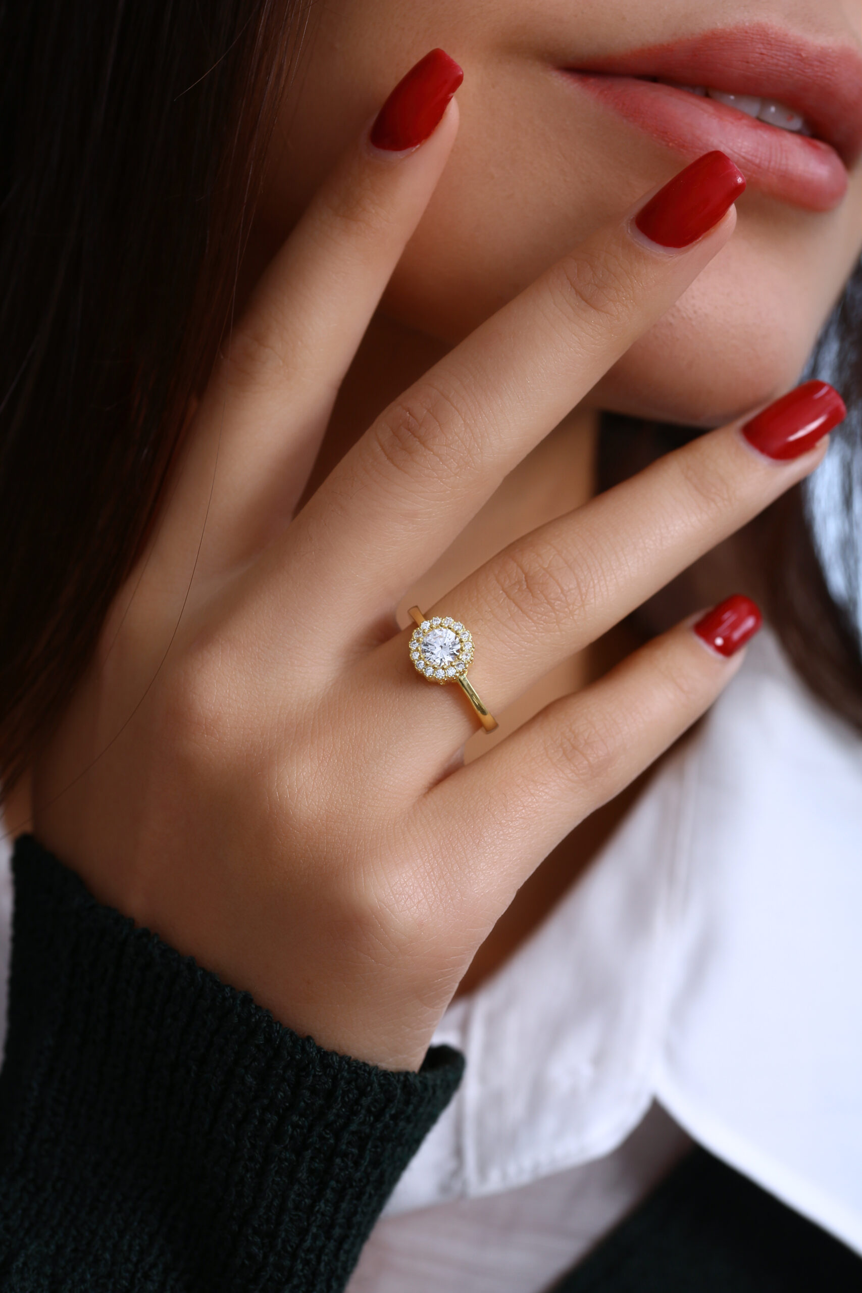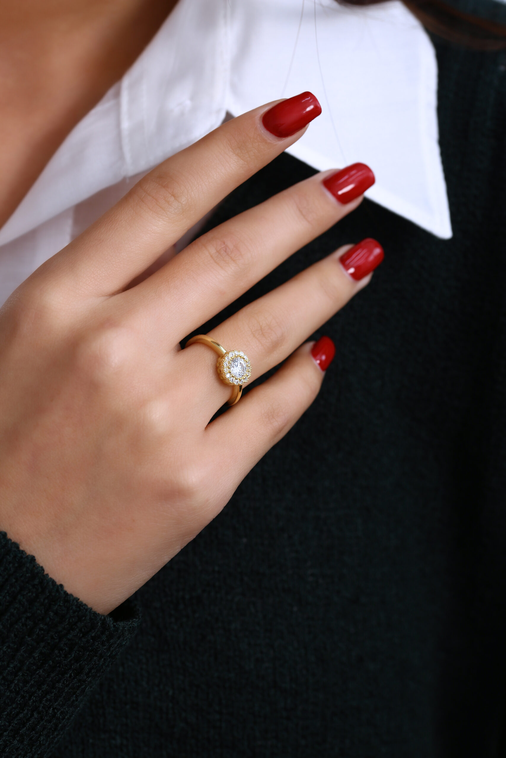 Merkezdeki büyük taş ve etrafını saran ince parlak taşlarla kusursuz bir ışıltı sunan bu yüzük, zarif bir şıklık arayan kadınlar için tasarlandı. Özel kesim orta taş hem günlük kullanımda hem de özel günlerde etkileyici bir görünüm sağlar. Altın kaplama gövdesi modern ve zarif dokunuşlarla tamamlanmıştır.