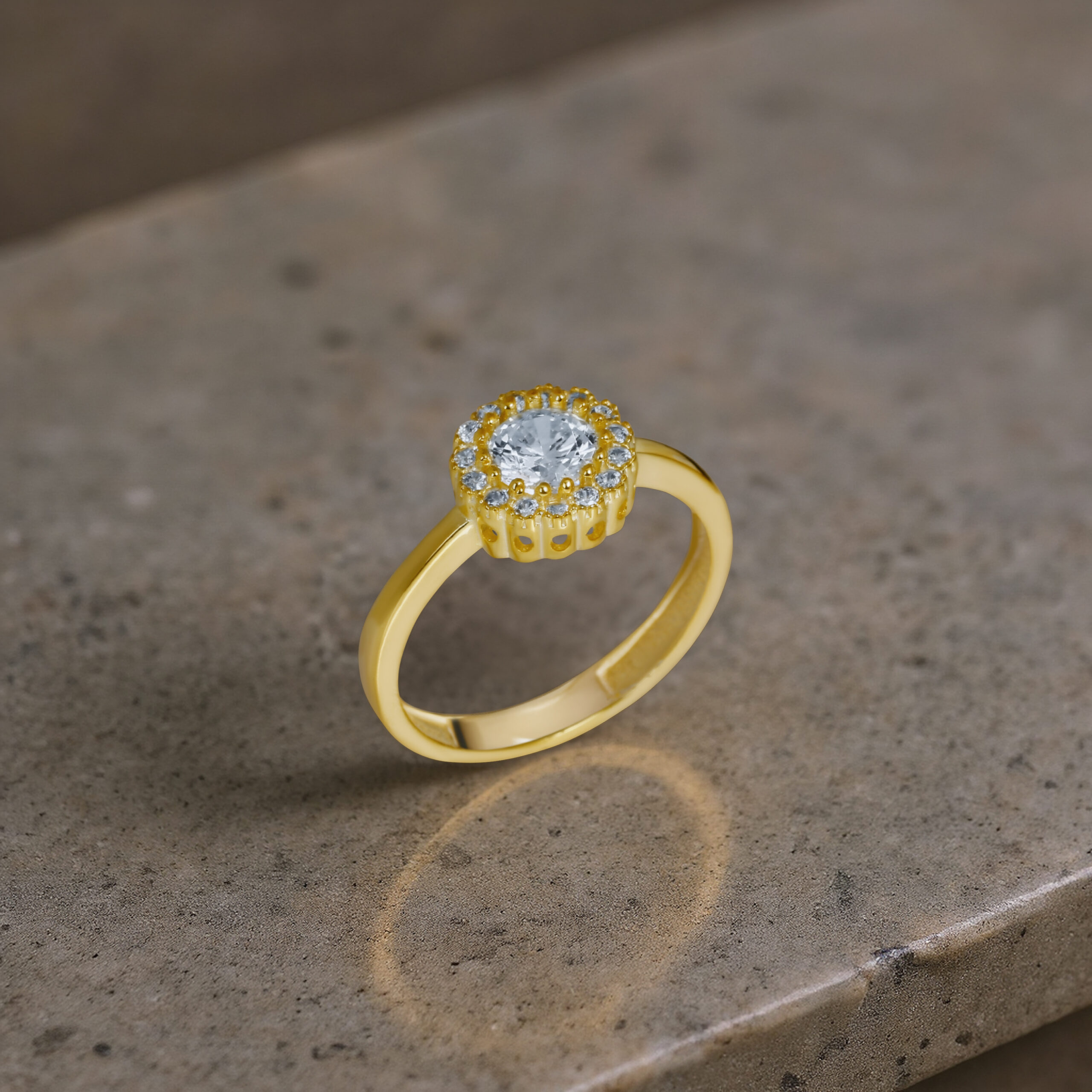 Merkez taş ve çevresindeki parlak taşlarla ışıltısı yüksek, zarif gold yüzük.