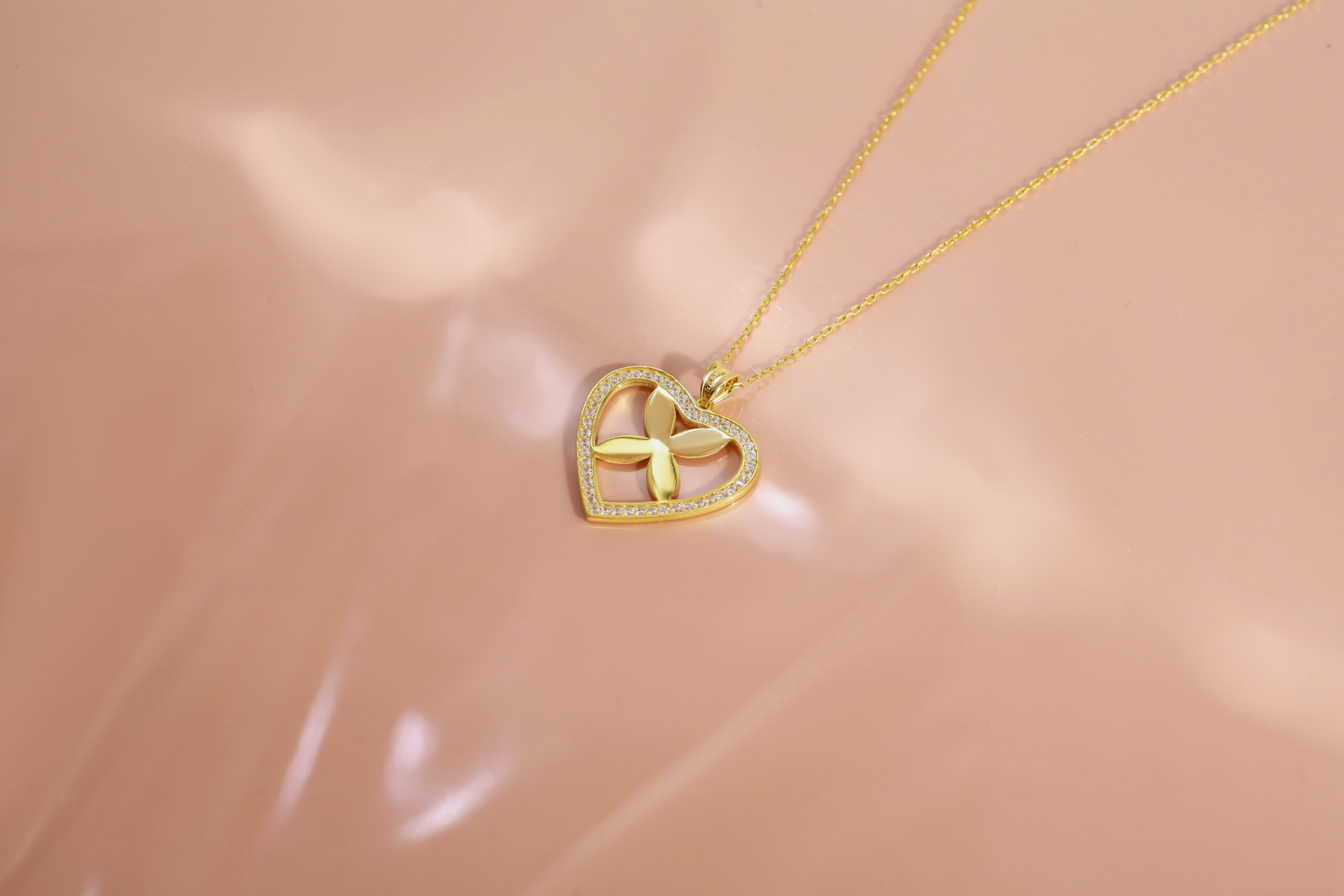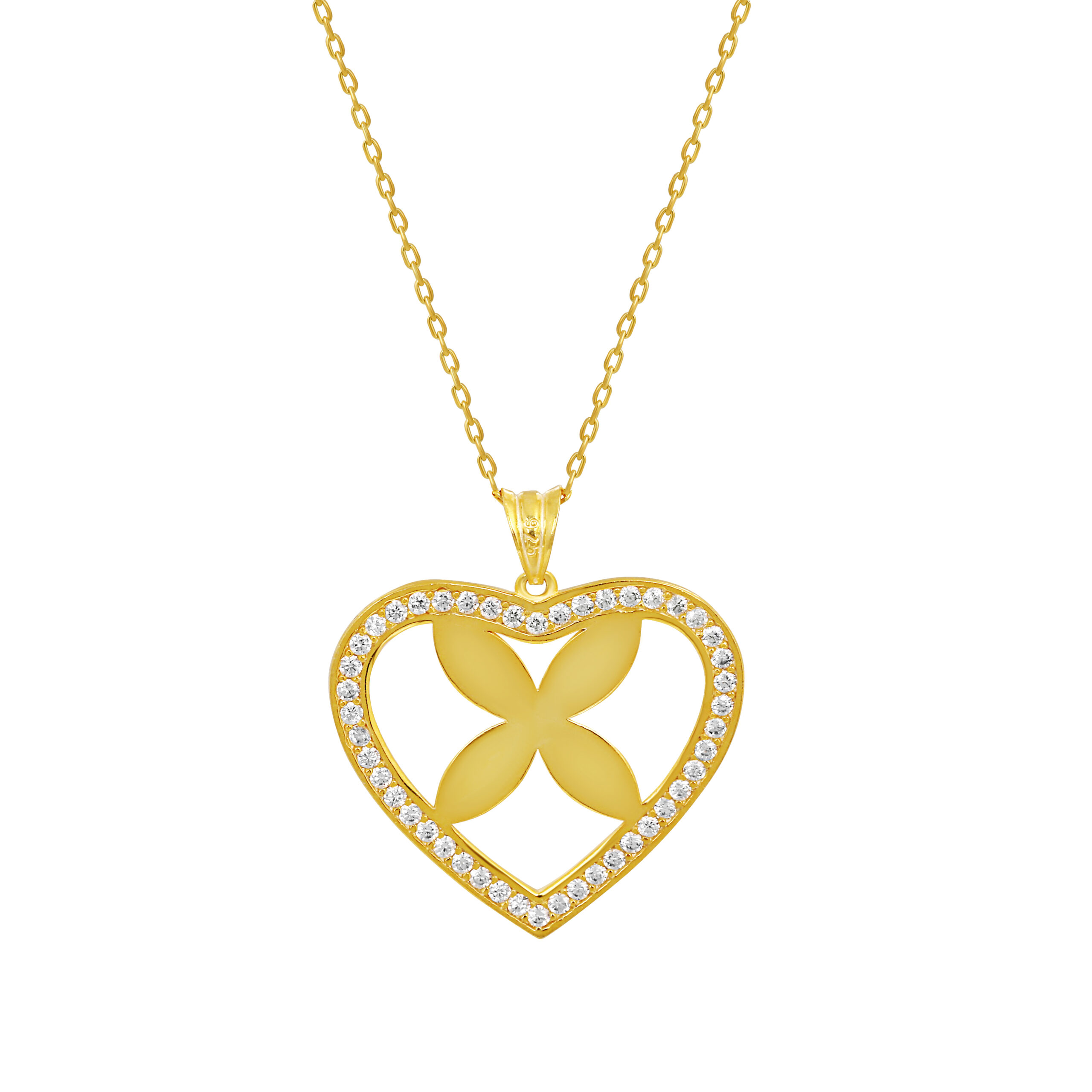 Kalp silueti ve parlak taşlı detaylarıyla modern, romantik ve göz alıcı bir kolye. 925 ayar gümüş üzerine altın kaplama.