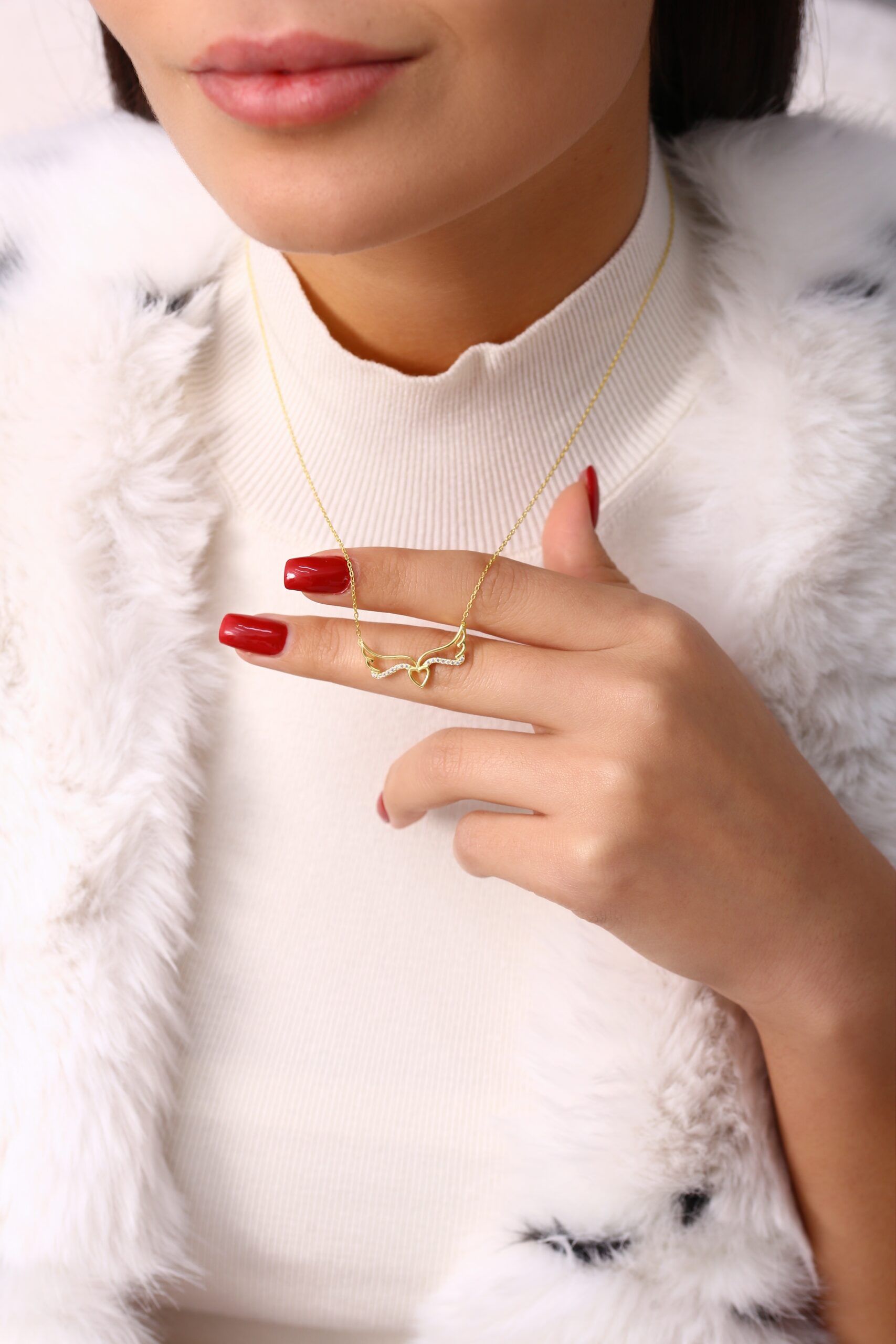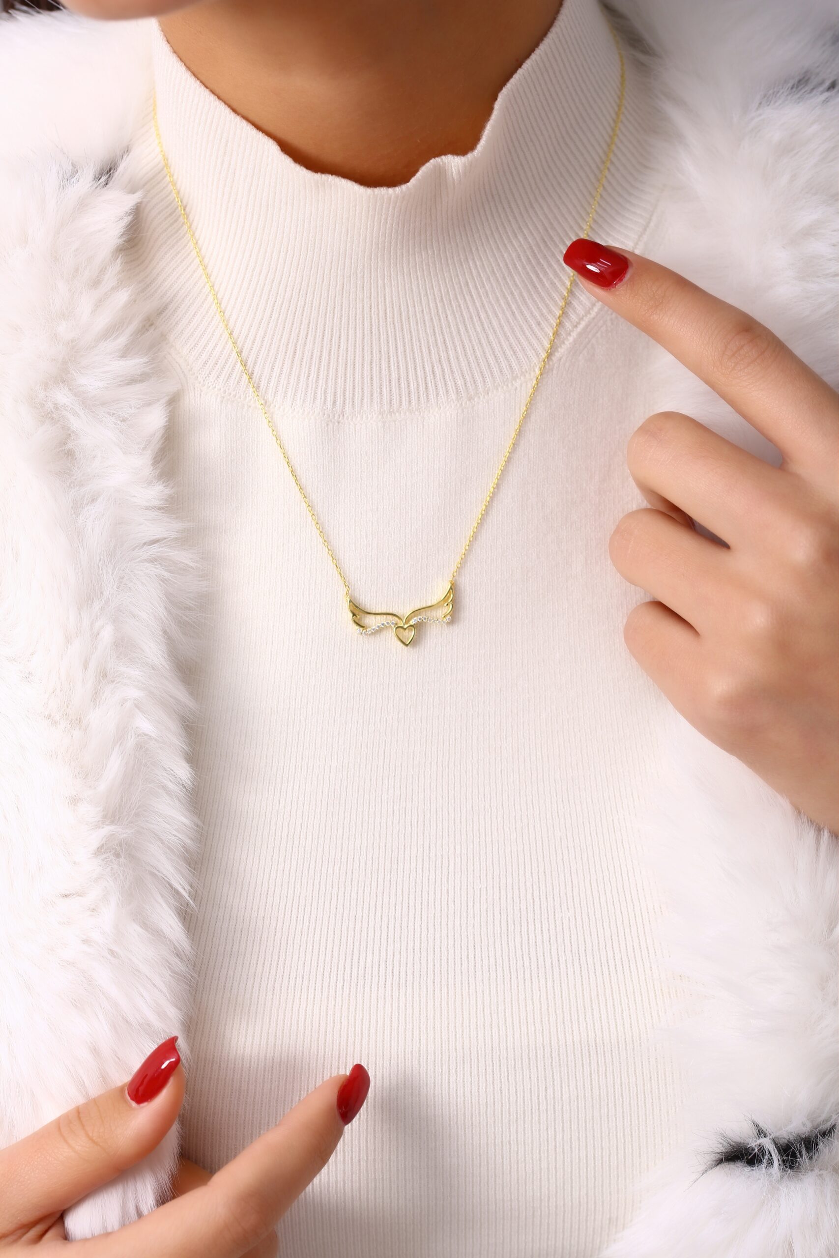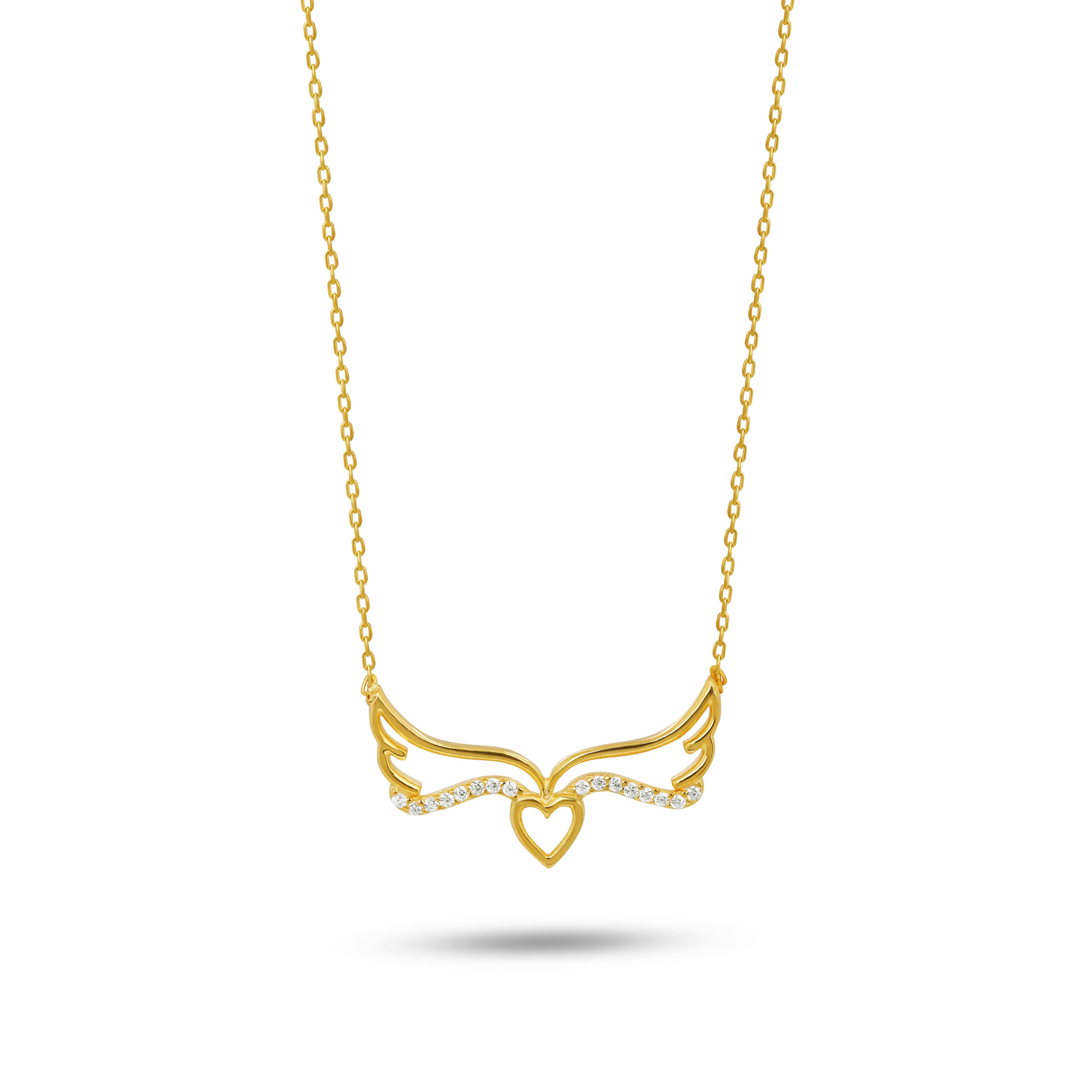 Kalp ve kanat detaylarının birleşimiyle oluşturulan bu kolye, zarif taş işlemeleriyle göz alıcı bir parlaklık sunar. Altın kaplama yüzey, modern çizgiler ve ince zincir tasarım ile günlük kullanıma da özel günlere de rahatlıkla uyum sağlar. Sevgi, özgürlük ve koruma sembollerini tek tasarımda buluşturan şık bir aksesuardır.