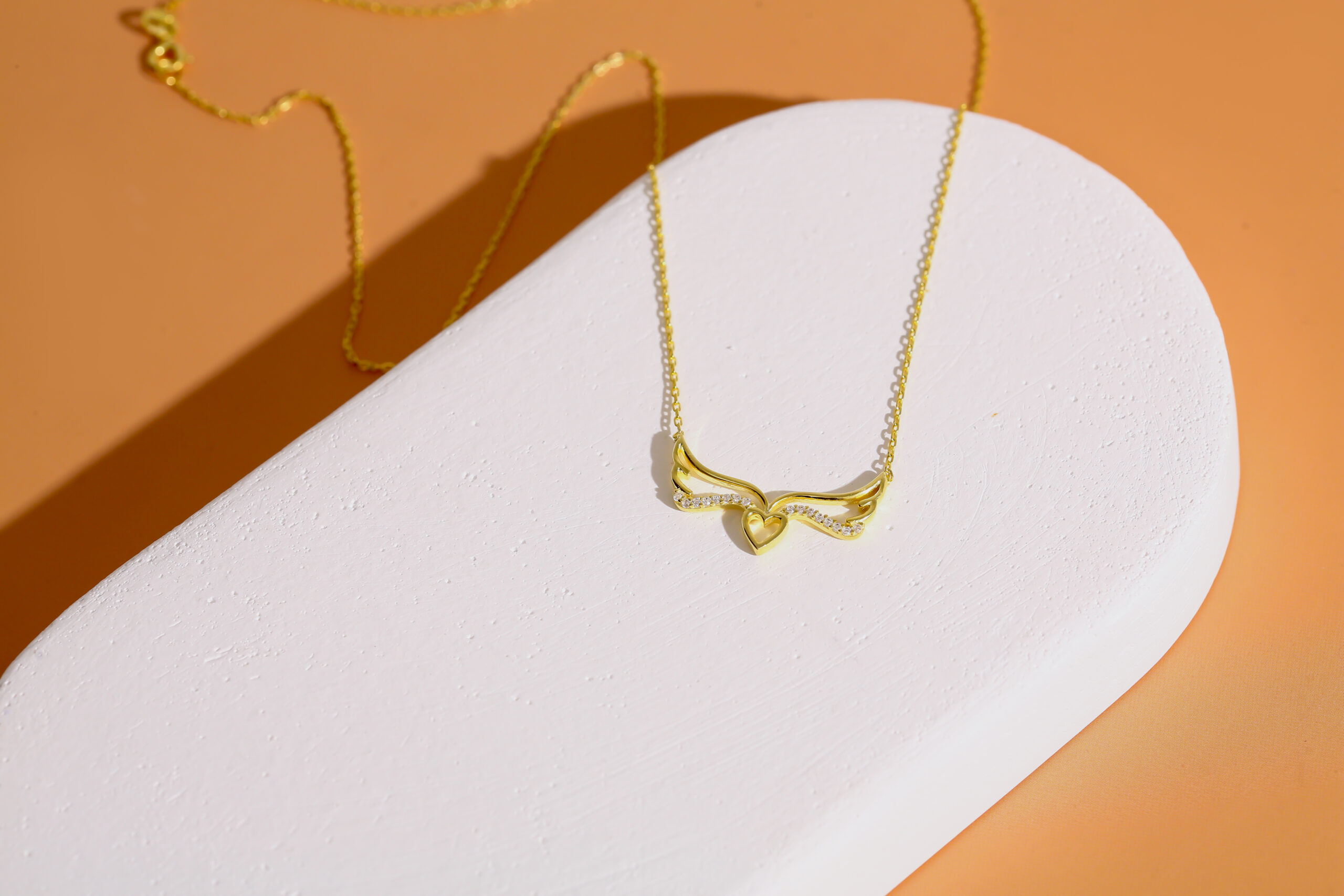 Taş işlemeli kalp ve kanat figürlü altın kaplama kolye.