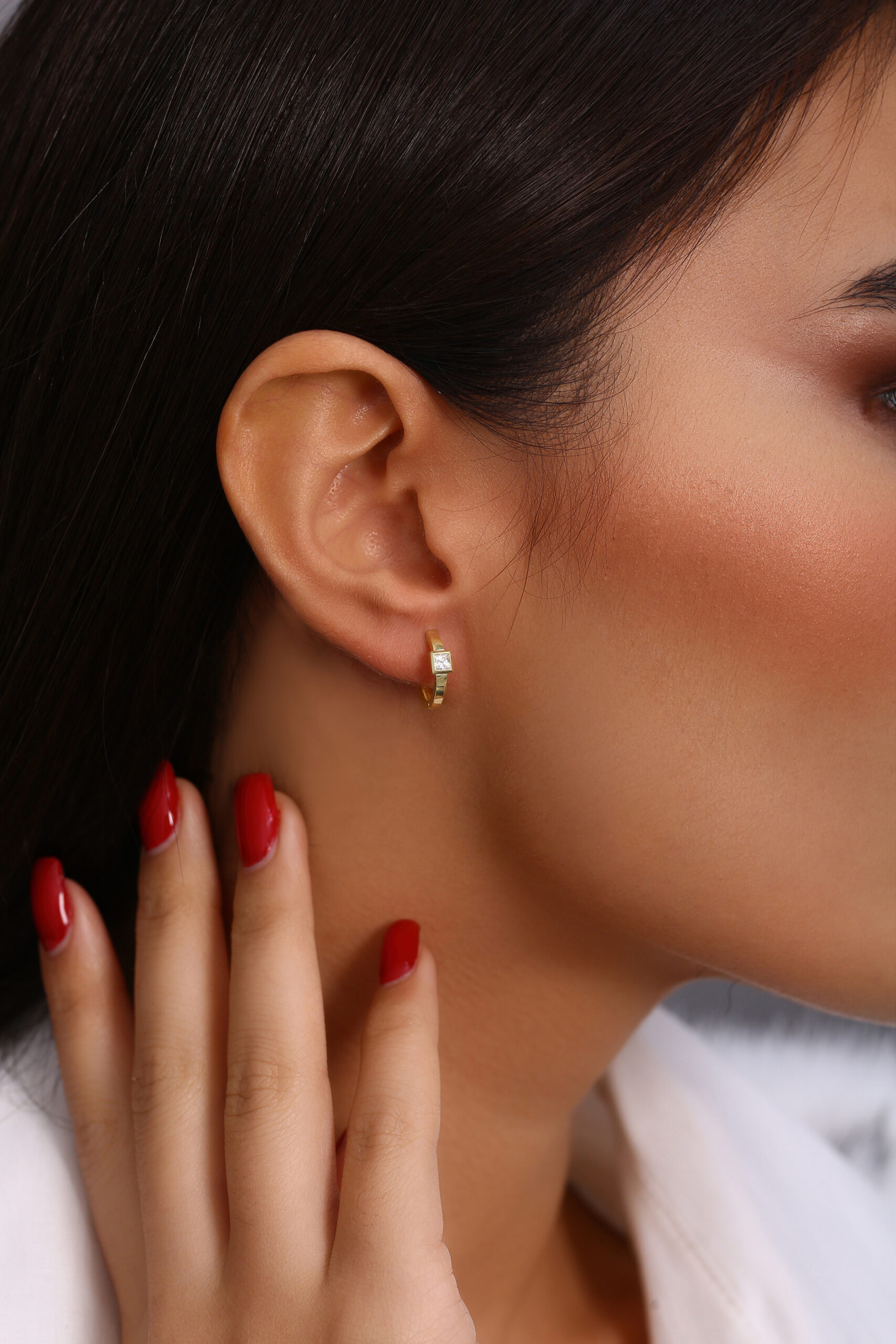 Minimalist kare taş detayıyla sade şıklığı vurgulayan bu halka küpe, zarif bir görünüm isteyenler için ideal bir modeldir. Hem gündelik kombinlerde hem özel davetlerde rahatlıkla tercih edilebilir. Parlak altın kaplama yüzeyi uzun süre taze görünüm sağlar.