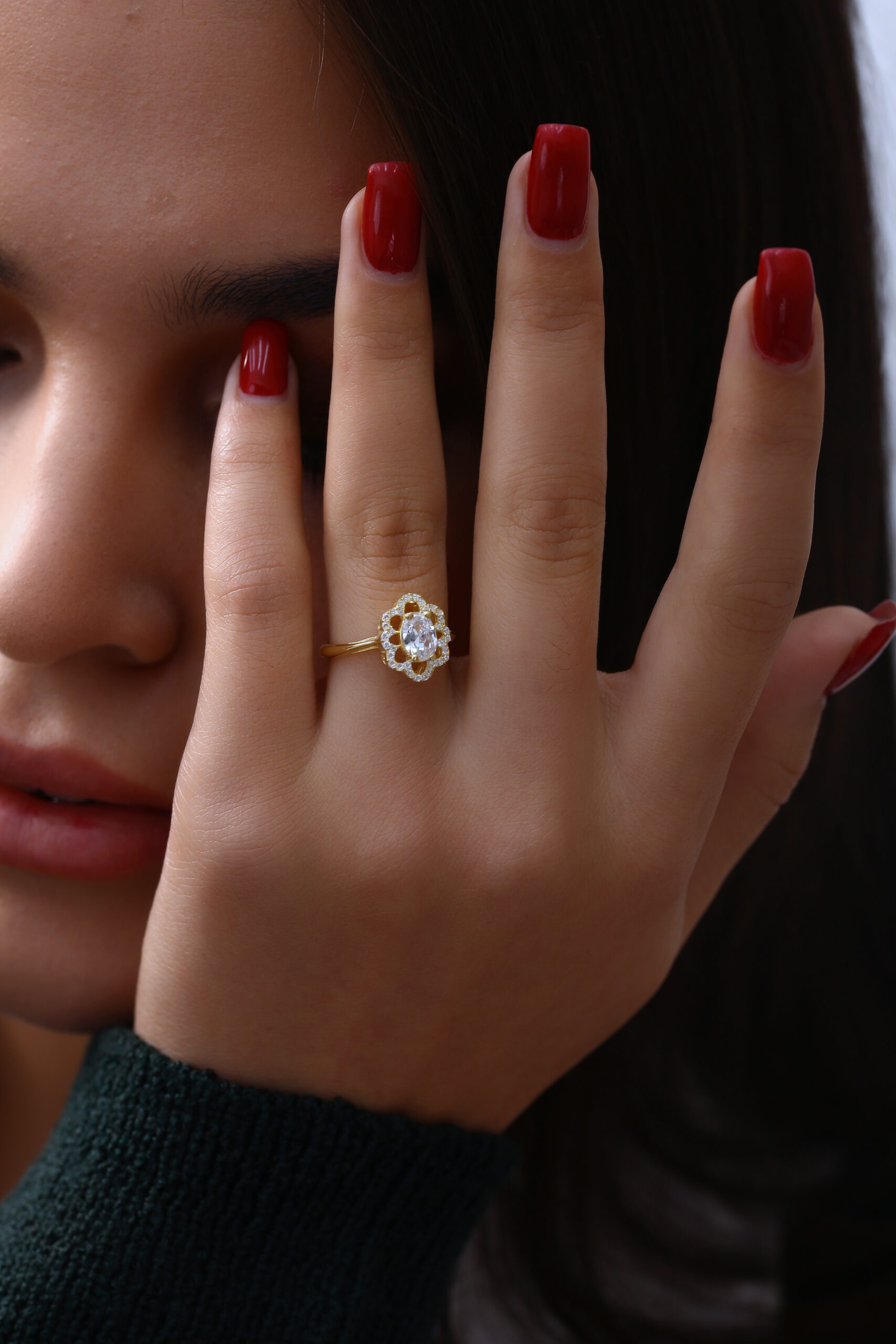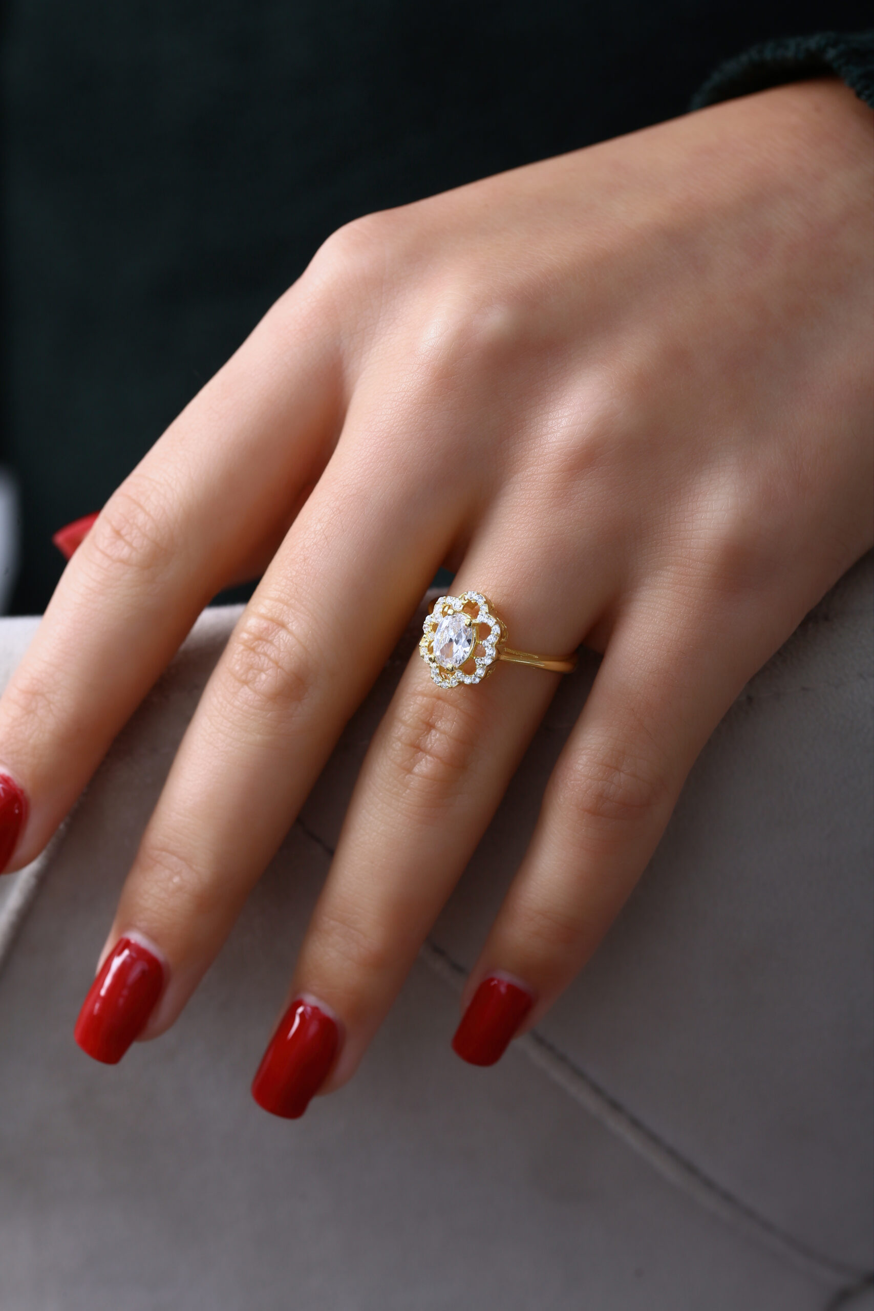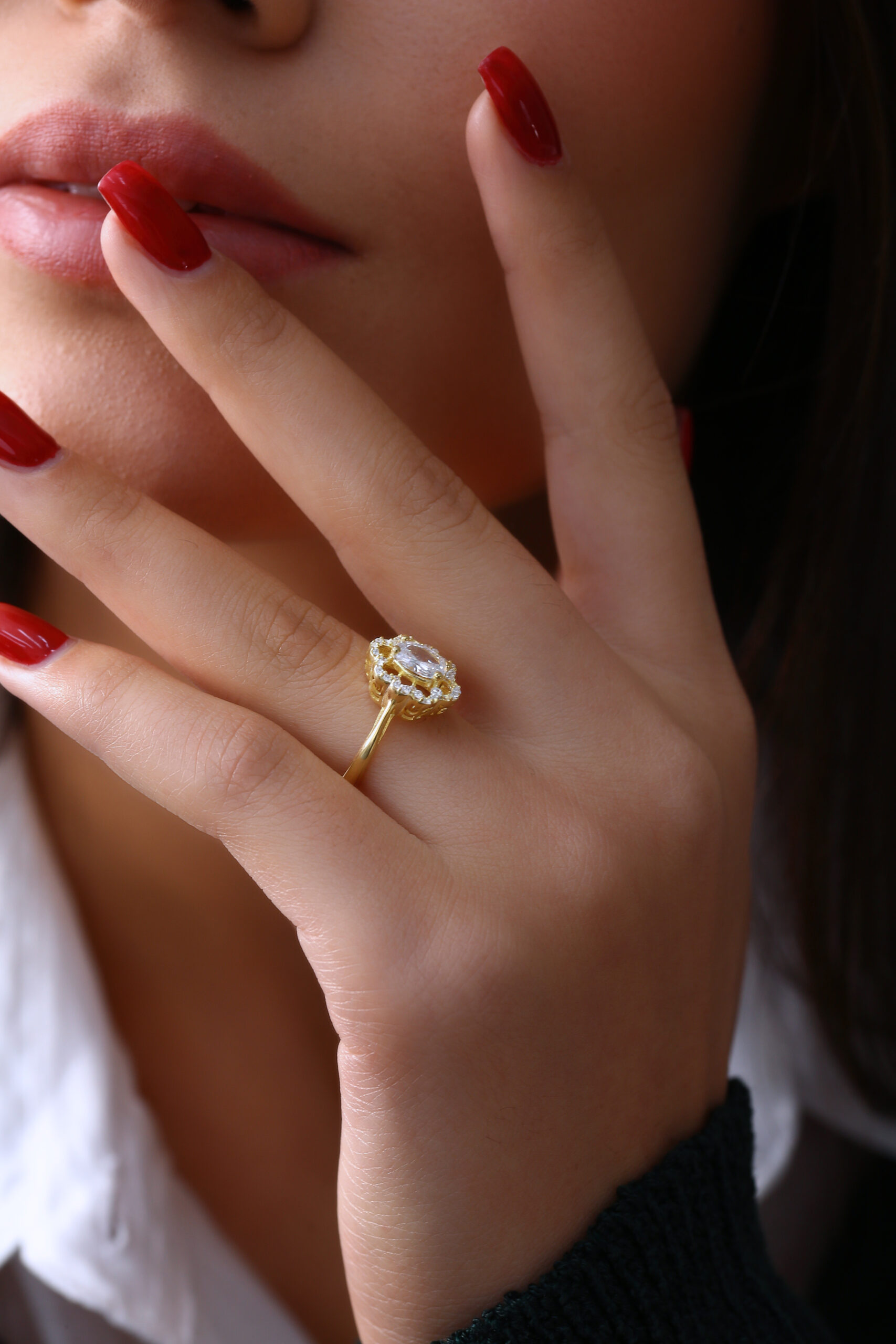 Oval taş ve çevresindeki parlak taşlarla şık, göz alıcı gold yüzük.