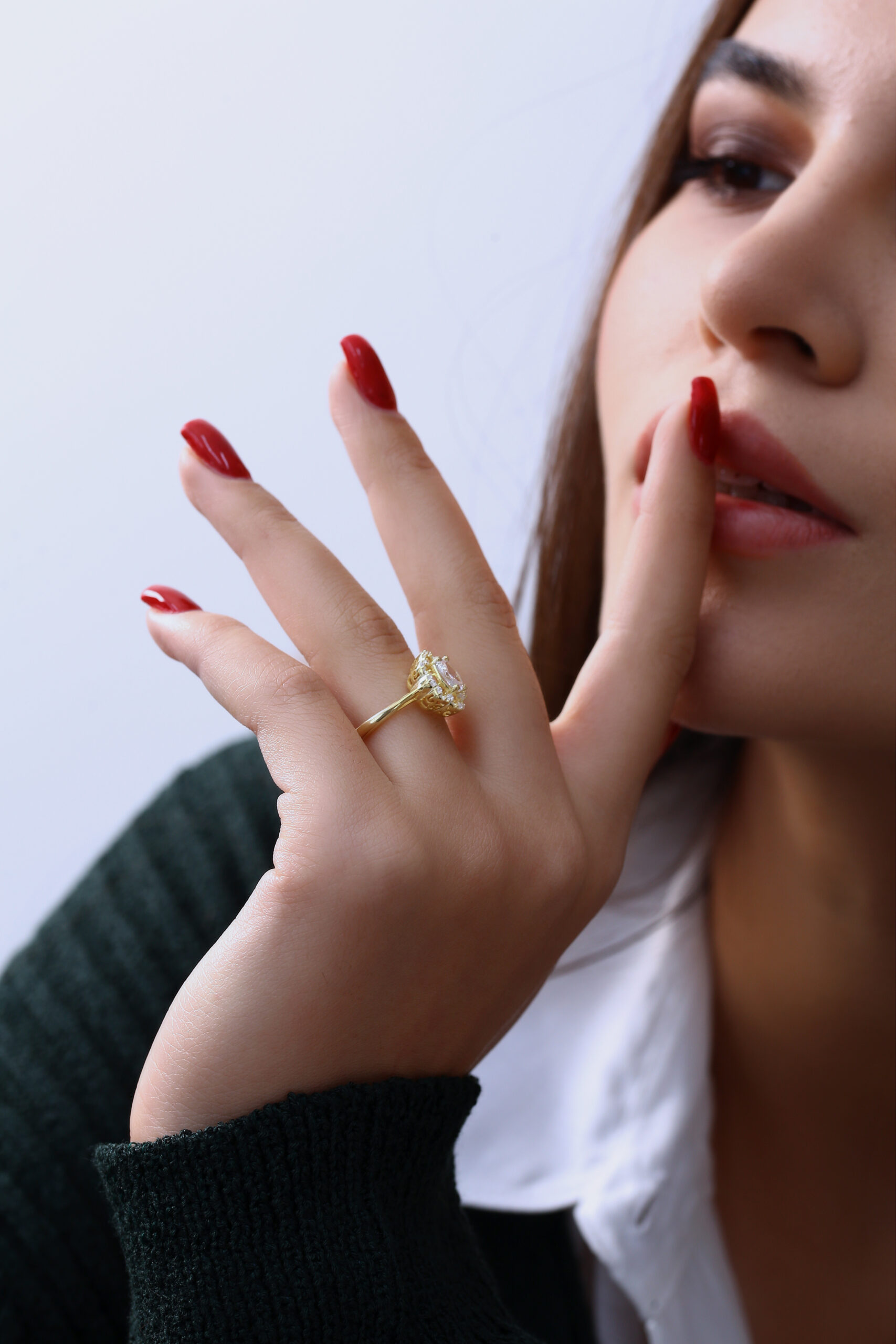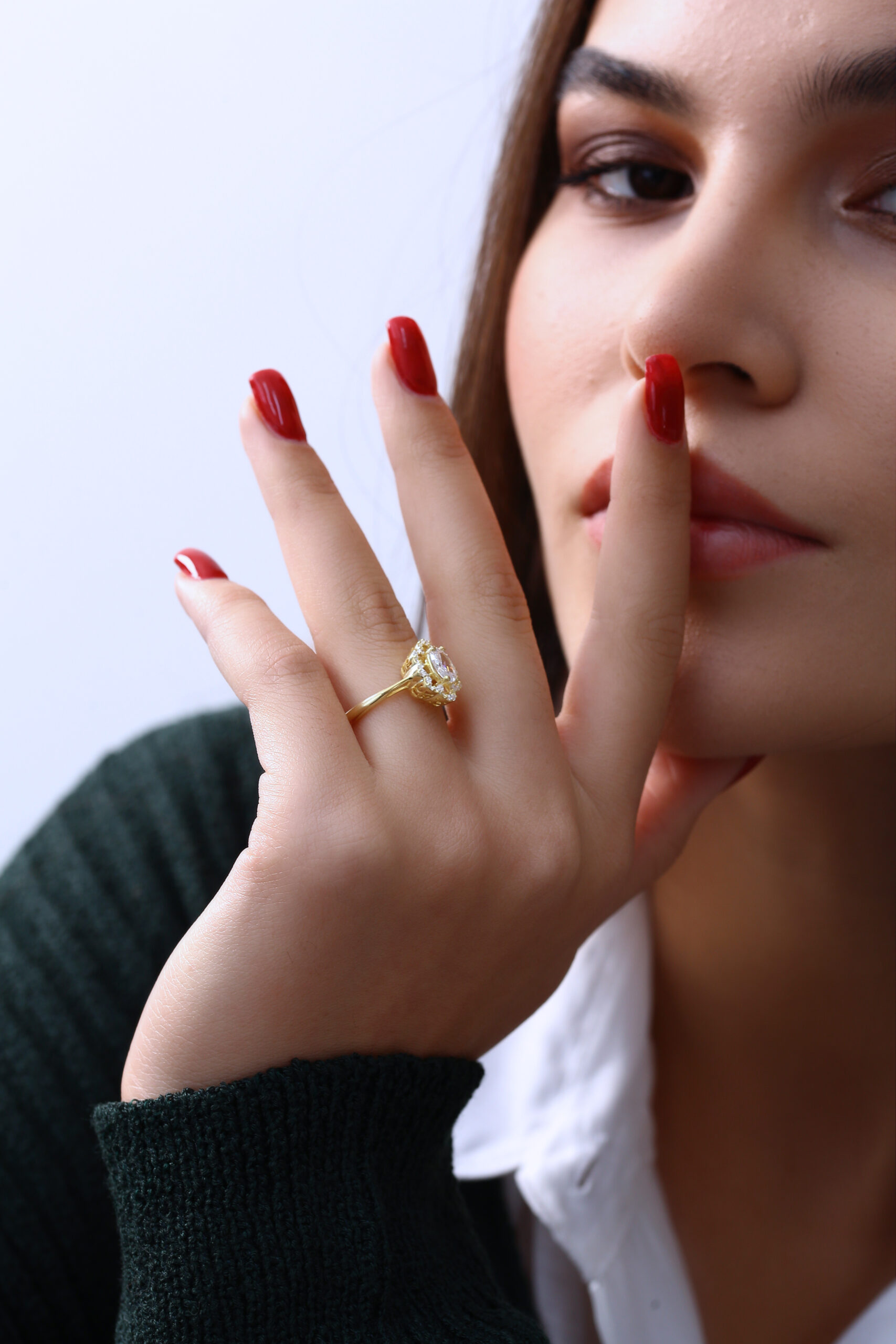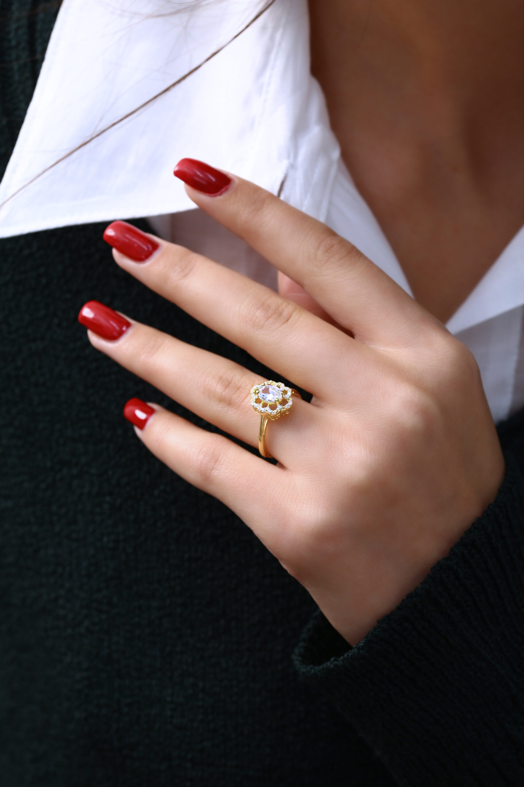 Özel kesim büyük oval taş ve etrafındaki parlak taş dizilimiyle oldukça gösterişli ve zarif bir model olan bu yüzük, özel günlerde dikkat çekmek isteyen kadınlar için ideal bir seçimdir. Altın rengi gövde ile parlak taşların uyumu kusursuz bir bütünlük oluşturur. Hem klasik hem de modern dokunuşlara sahip tasarımıyla Goldpark’ın seçkin modellerinden biridir.