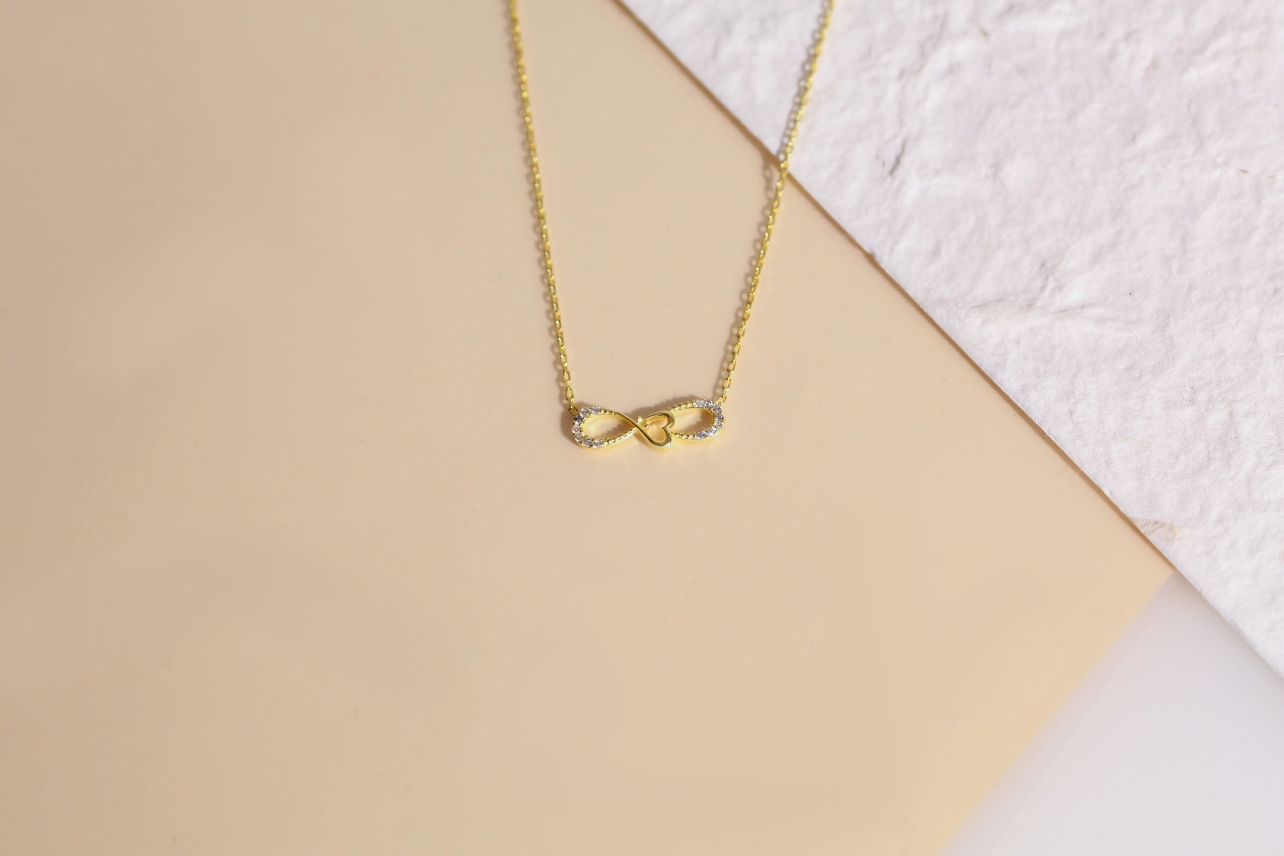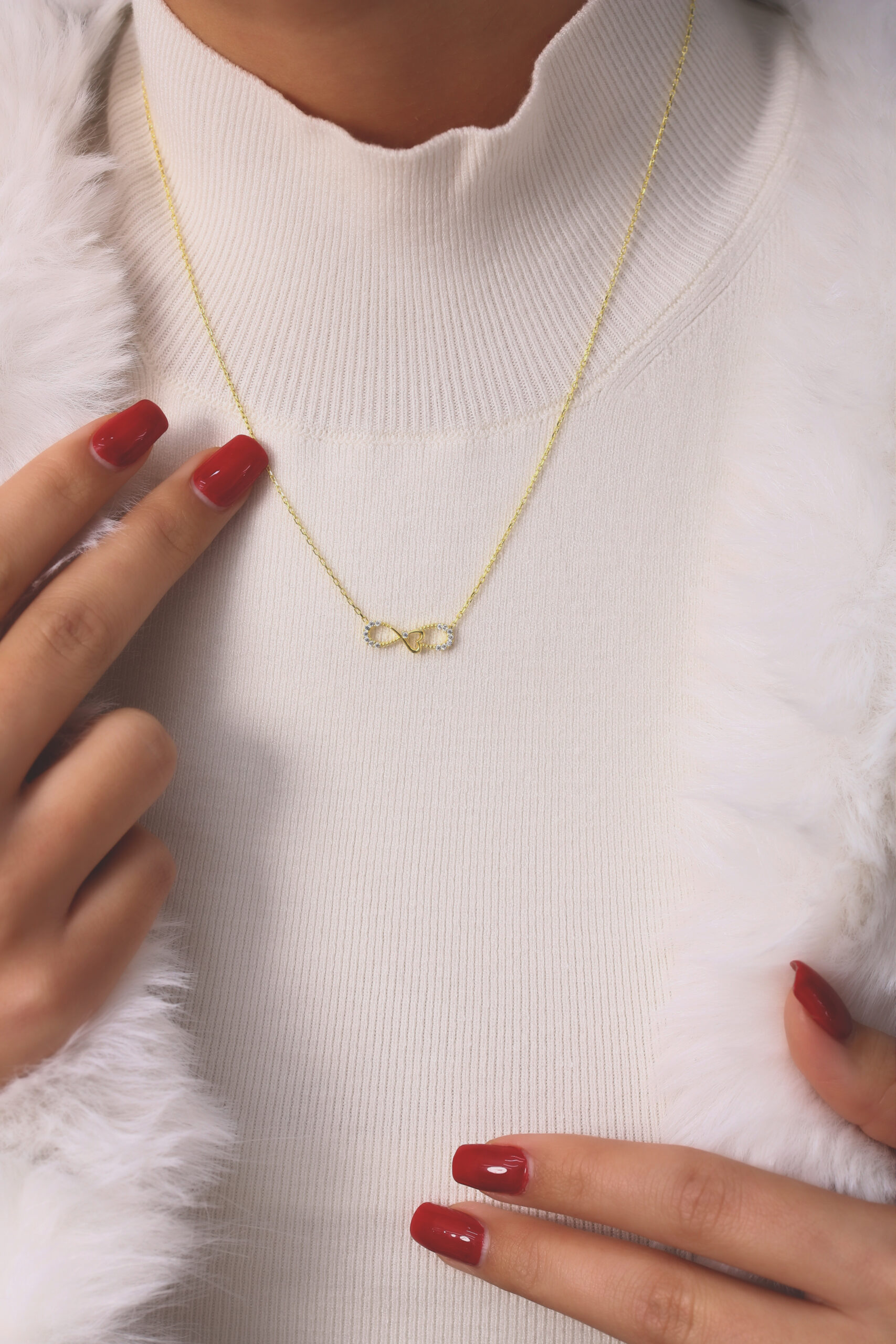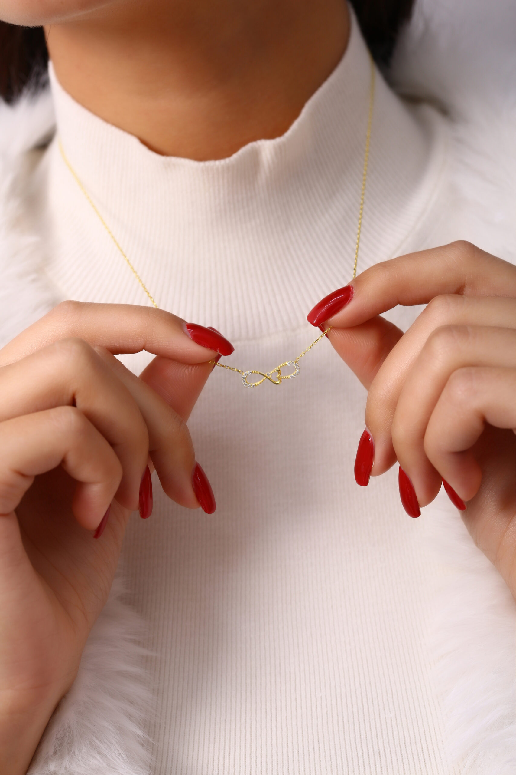 Sonsuzluk sembolü ile kalp detayını bir araya getiren bu özel tasarım kolye, sevgi ve bağlılığı zarif bir şekilde temsil eder. Parlak taş işlemeleri ışığı kusursuz yansıtarak şık bir görünüm sağlar. Altın kaplama ince zincir yapısı ise hem günlük hem özel kombinlerle kolayca uyum sağlar. Minimal ama etkileyici tasarımı sayesinde her yaşa ve her stile hitap eden romantik bir aksesuardır.