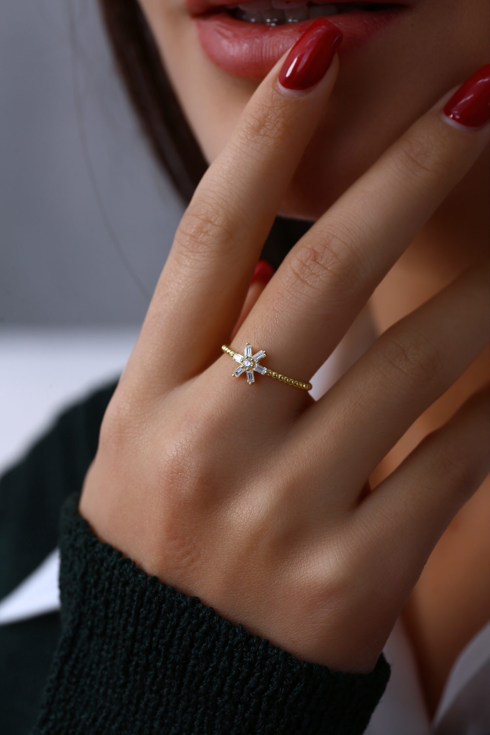 YZK-1018 modeli, boncuk detaylı halkası ve yıldız şeklindeki baget taş yerleşimiyle romantik ve modern bir tasarım sunar. Baget taşların özel kesimi, ışığı yüksek oranda kırarak yüzüğe güçlü bir parlaklık kazandırır.