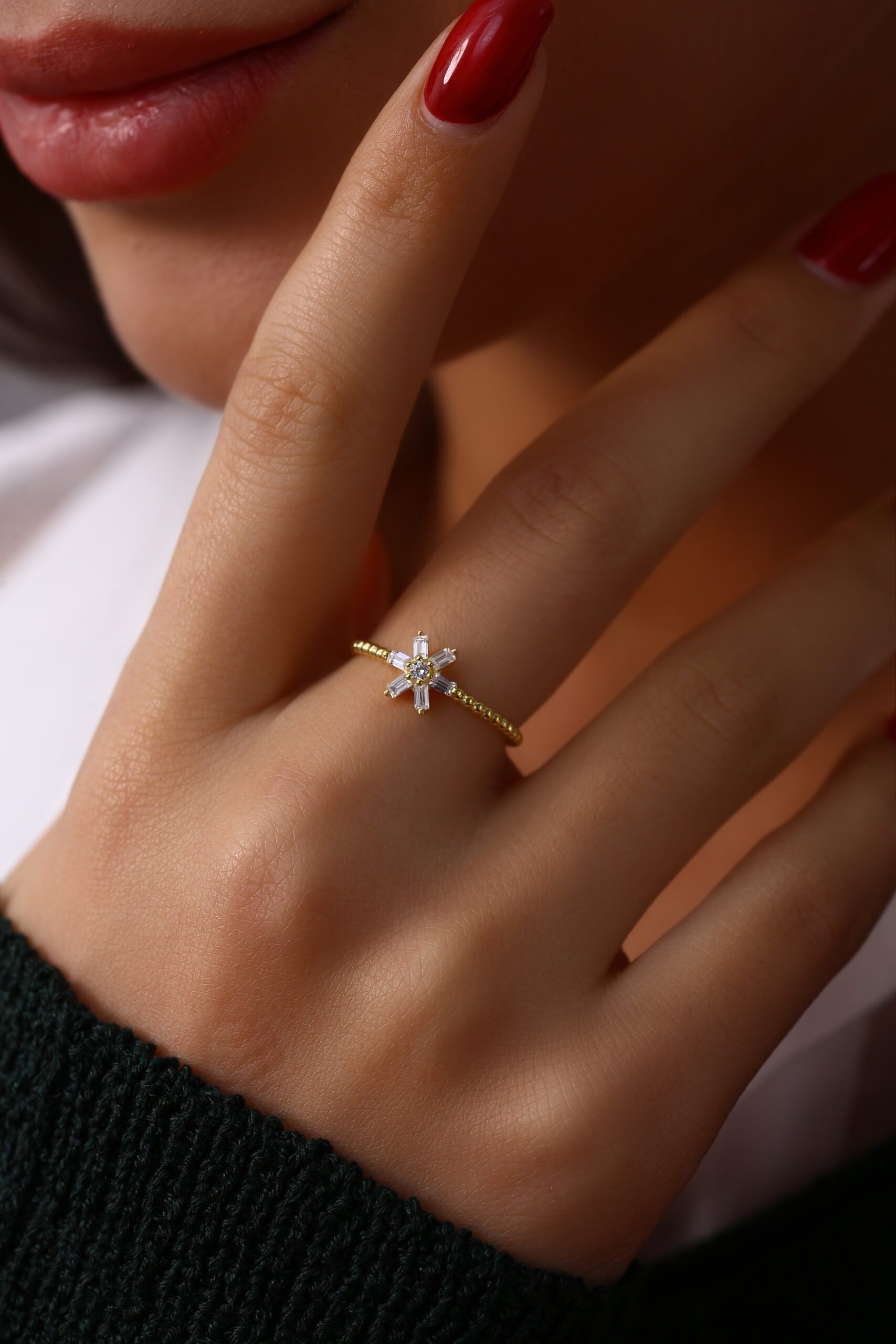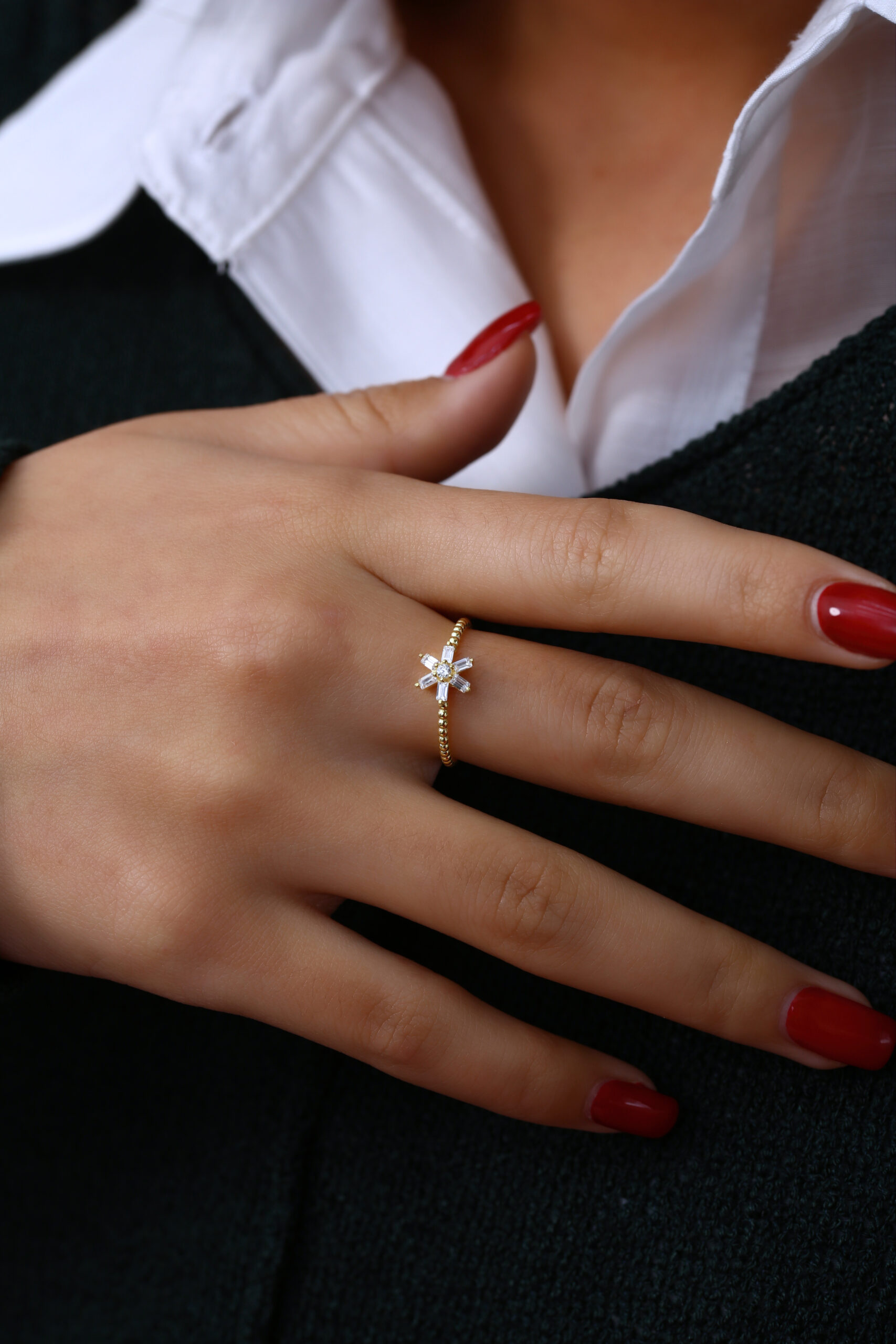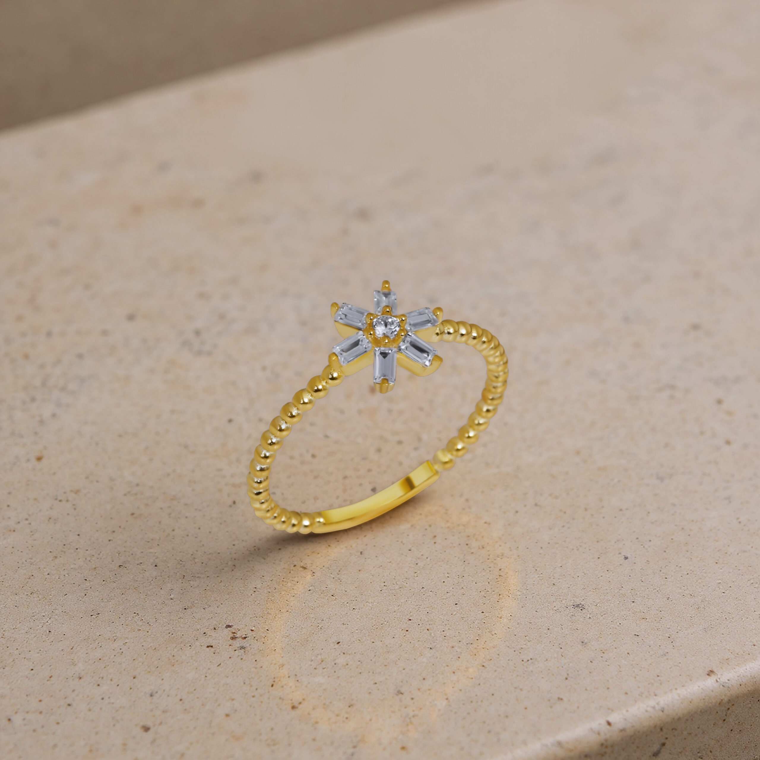 Yıldız formuna yerleştirilen baget taşlar ile zarif ve modern bir görünüm sunan şık yüzük modeli.