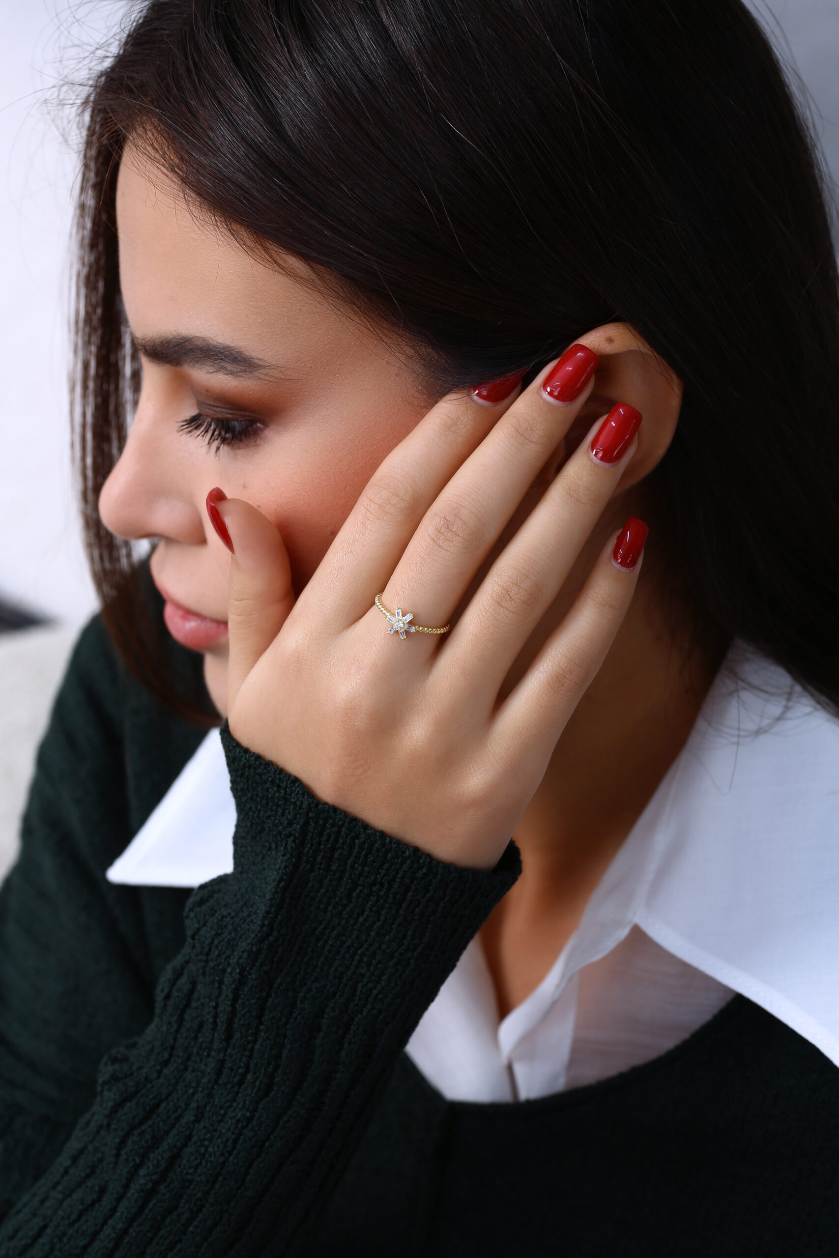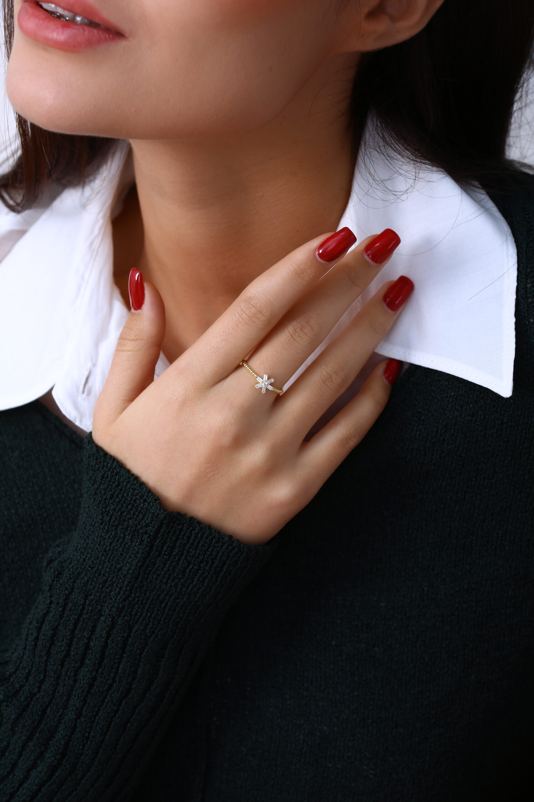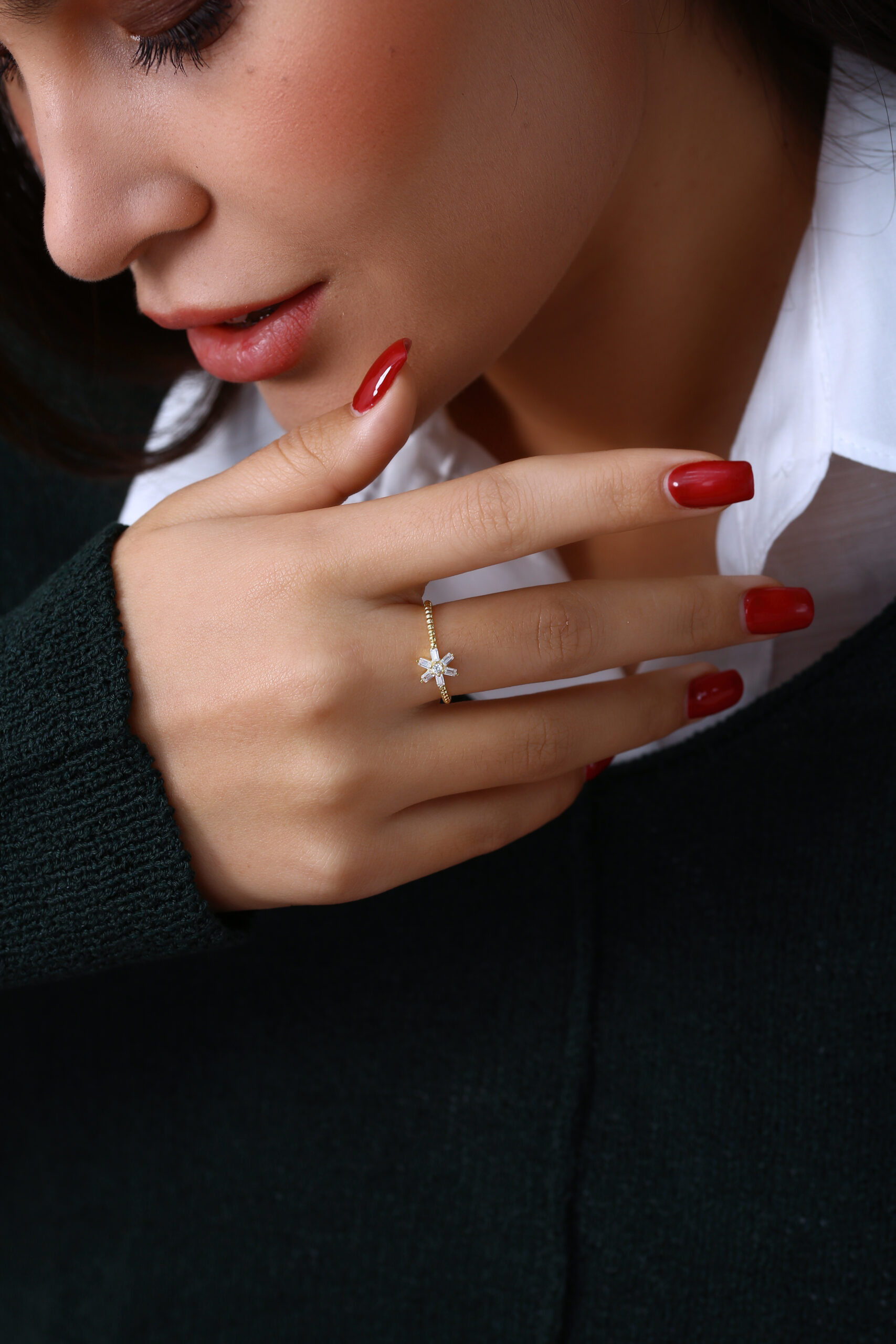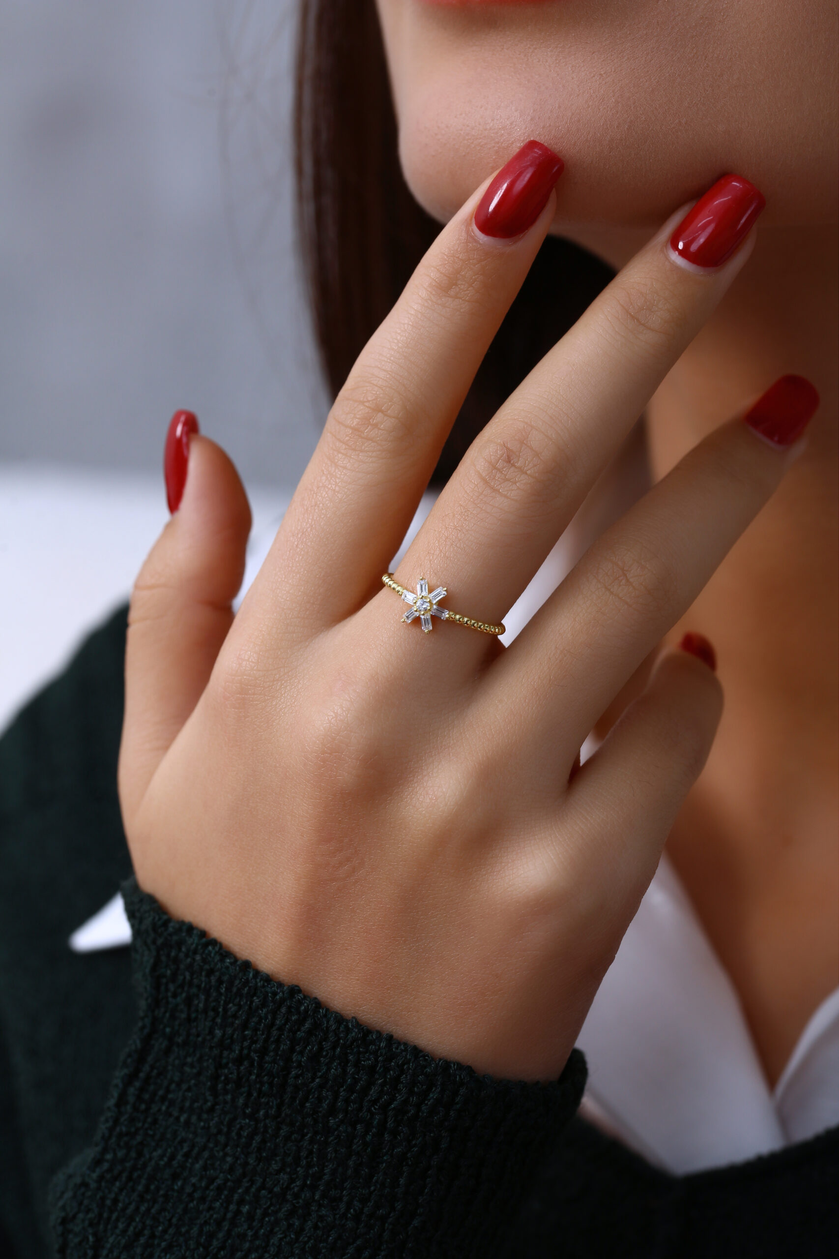 Yıldız formuna yerleştirilen baget taşlar ile zarif ve modern bir görünüm sunan şık yüzük modeli.